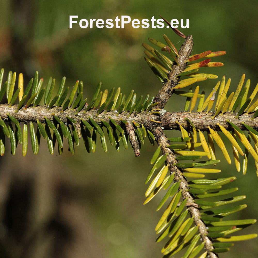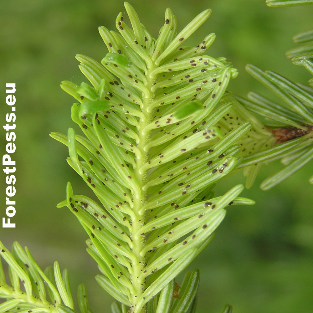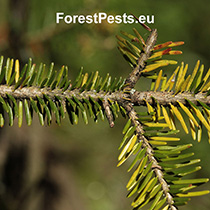The damage to young firs (Abies alba) is caused by the sucking of larvae on needles and twigs. The needles on the new shoots twist downwards due to sucking, turn yellow, and shorten. The needles affected by a weaker attack are only a bit shorter than the unaffected ones. In the case of a heavy attack, the needles grow only to a length of 0.5 - 1 cm, and the shoots are deformed, shortened, brown, and dry. In addition, the shoots are swollen at the base. In 10-year-old firs, the growth is reduced to 5-6 cm. The terminal and lateral shoots and whole individuals gradually die. A suitable pest detection method is to control the presence of deformed needles and branches.