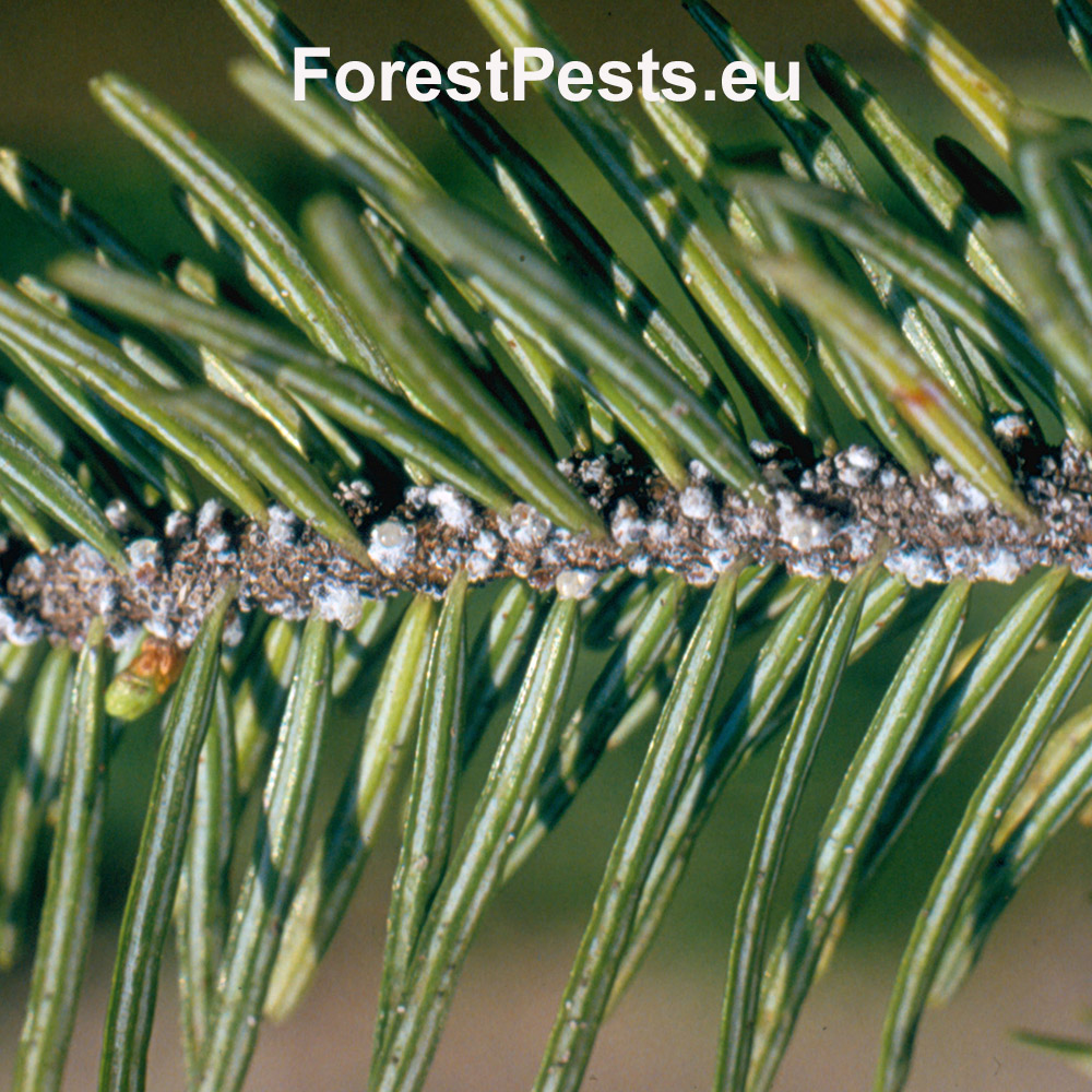 In Europe, the development is shorter, lasts only one year, and exclusively on fir. The pest overwinters as a first instar larva on the trunk and branches of trees. As soon as the temperature rises in early spring, the larvae develop rapidly through the second and third stages to the wingless female (fundatrix), which begin to lay eggs (from 300 to 500 pieces). Two different types of larvae hatch from these eggs in early May. First, larvae (sistens) settle on the trunk, where they suck plant juices. They have an extended straw-like sucking organ. These larvae no longer develop that year and remain on the trunk until autumn, where they overwinter. The second type of larvae (progrediens) moves into newly formed needles and fir shoots. It has a significantly shorter sucking organ. On the needles, these larvae are visible as tiny black dots. They suck for several weeks and gradually change into two types of adult females through four developmental stages. One type is winged and flies over a secondary host - the Caucasian fir. In Europe, this type of female species dies. The second type of female species is not winged and begins to lay eggs. Their fertility is low; they lay only 10 - 15 eggs. In July and August, larvae hatch from the eggs. They move on the trunk, joining the sistens, who have been feeding there since spring. All the larvae on the trunk are covered with a layer of white waxy wool at the end of September and the beginning of October. Under the layer of waxy wool, they overwinter until spring. In the spring, they continue to develop, they change into female fundatrix, and the whole cycle repeats.