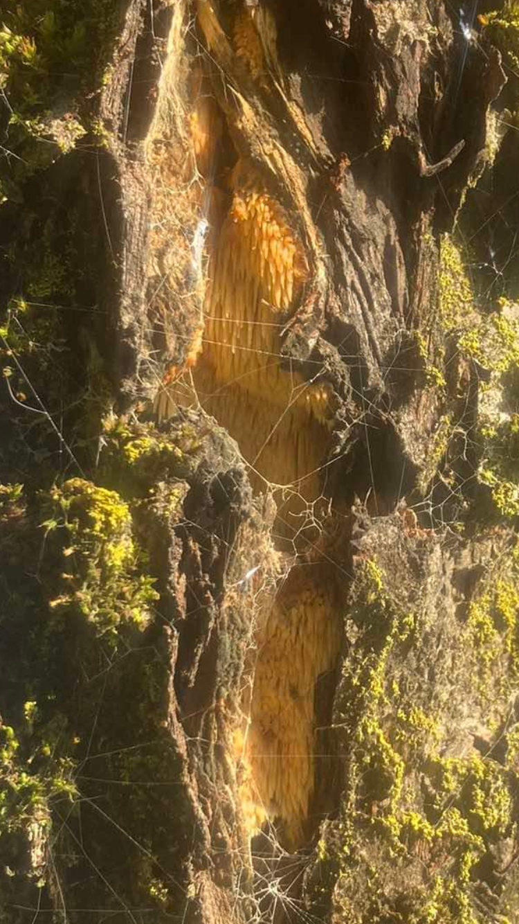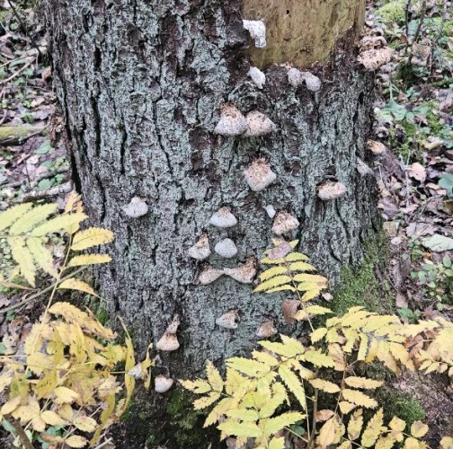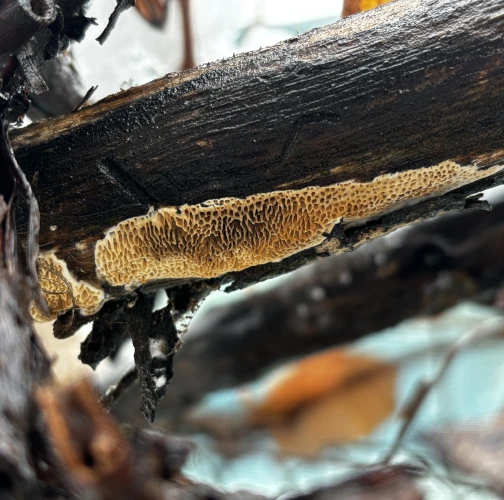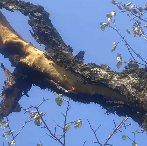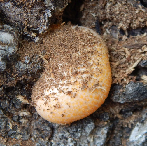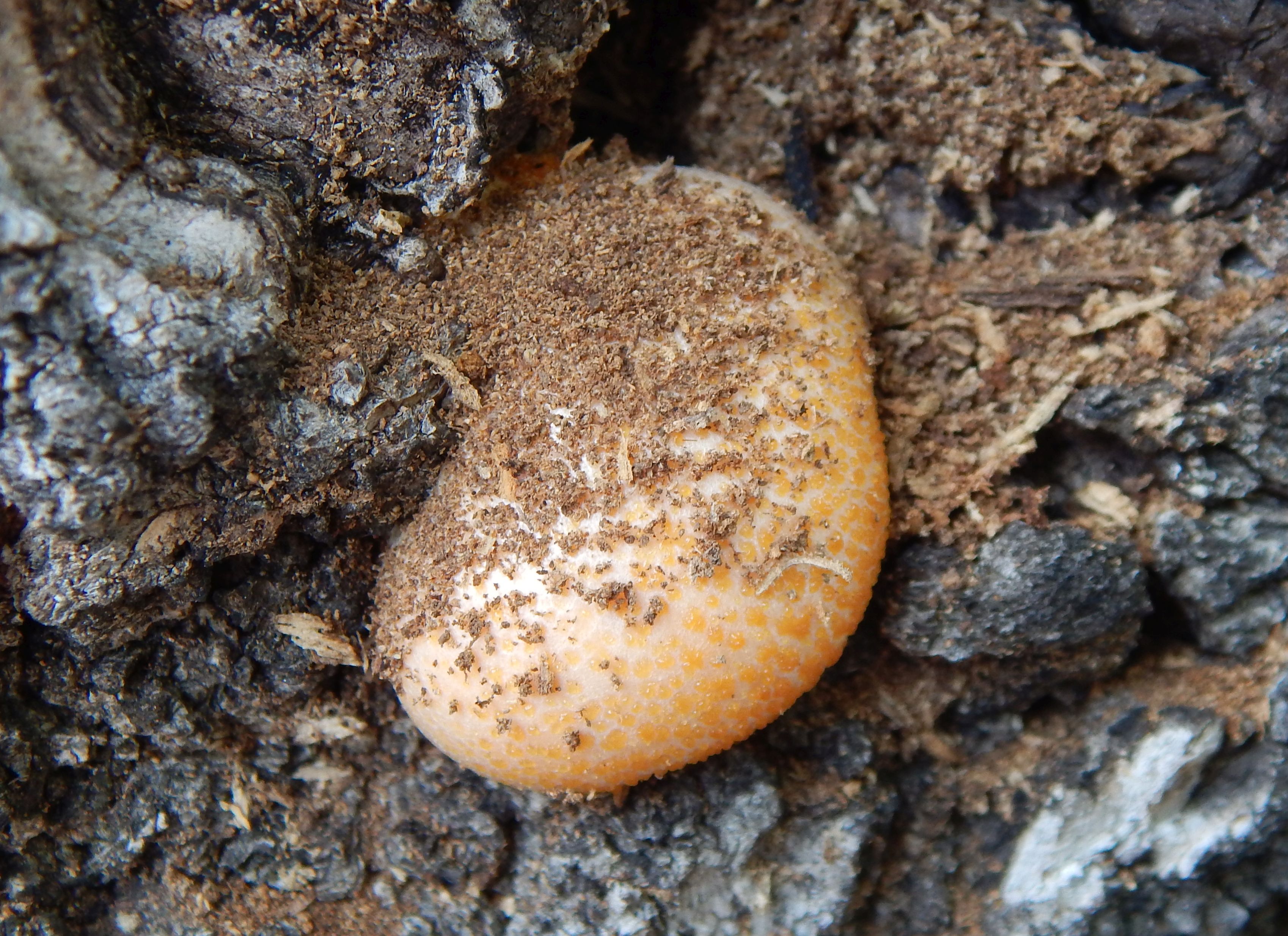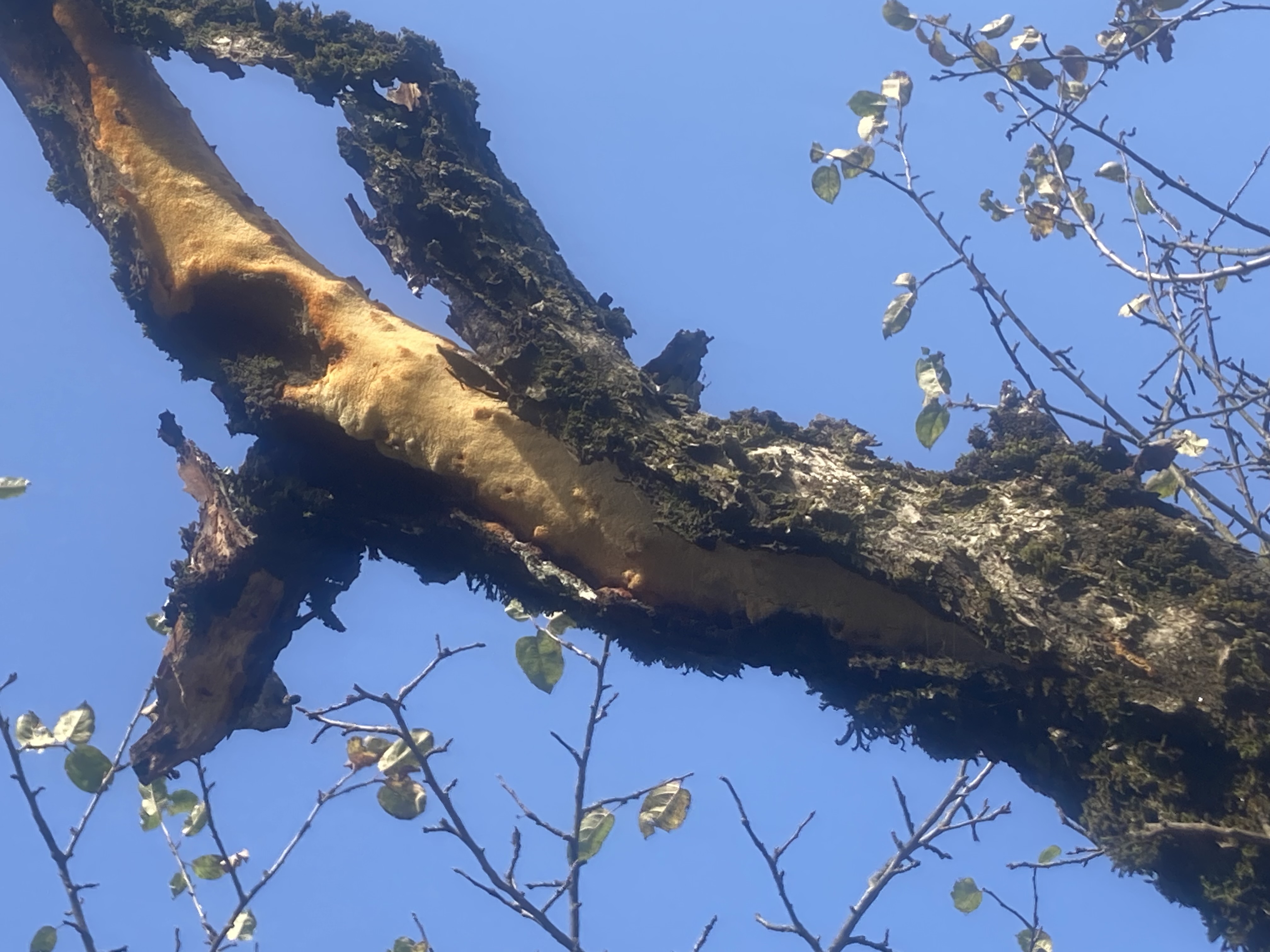 Found growing under the bark on deadwood, old apple orchard. Two trees affected