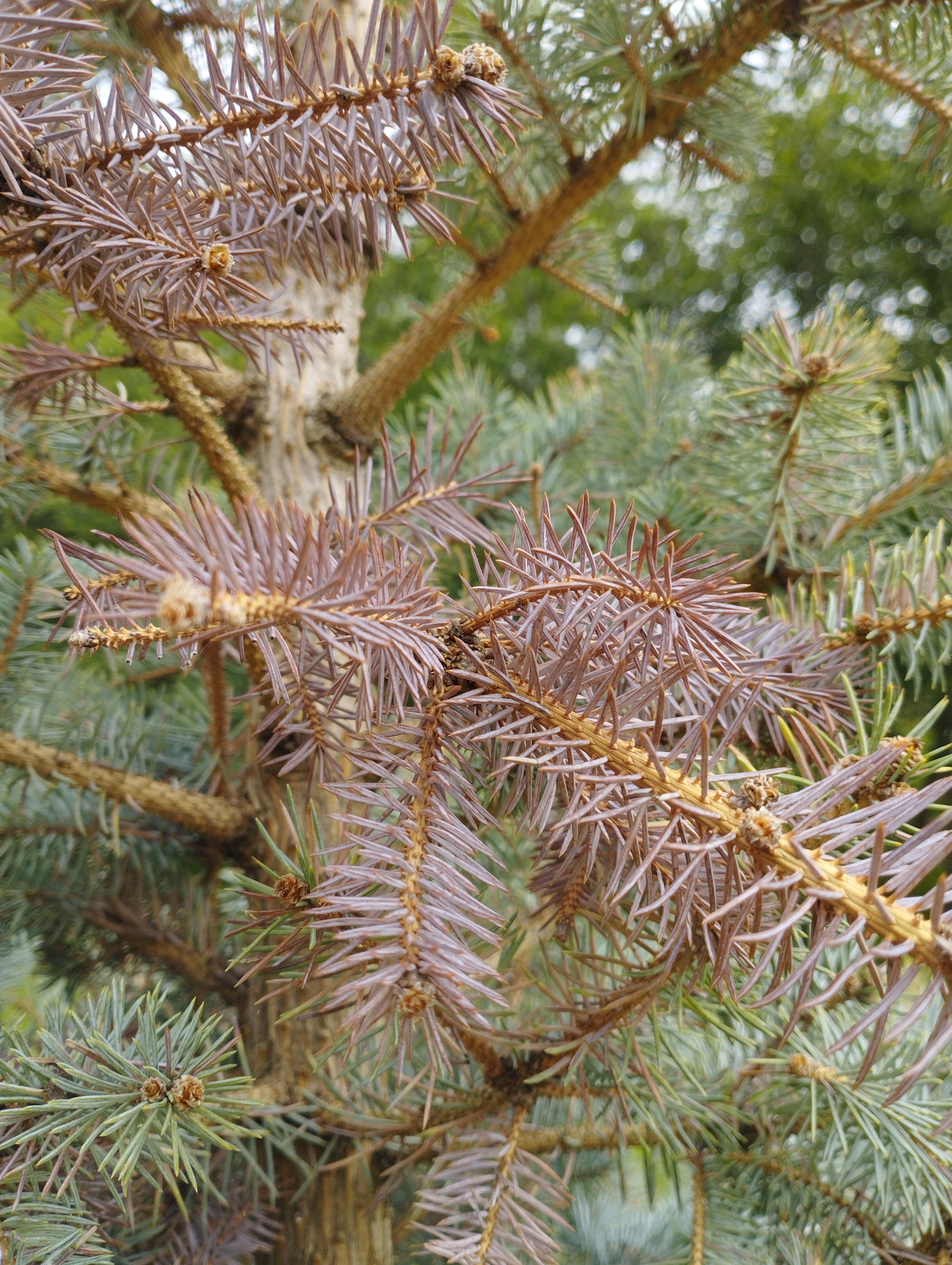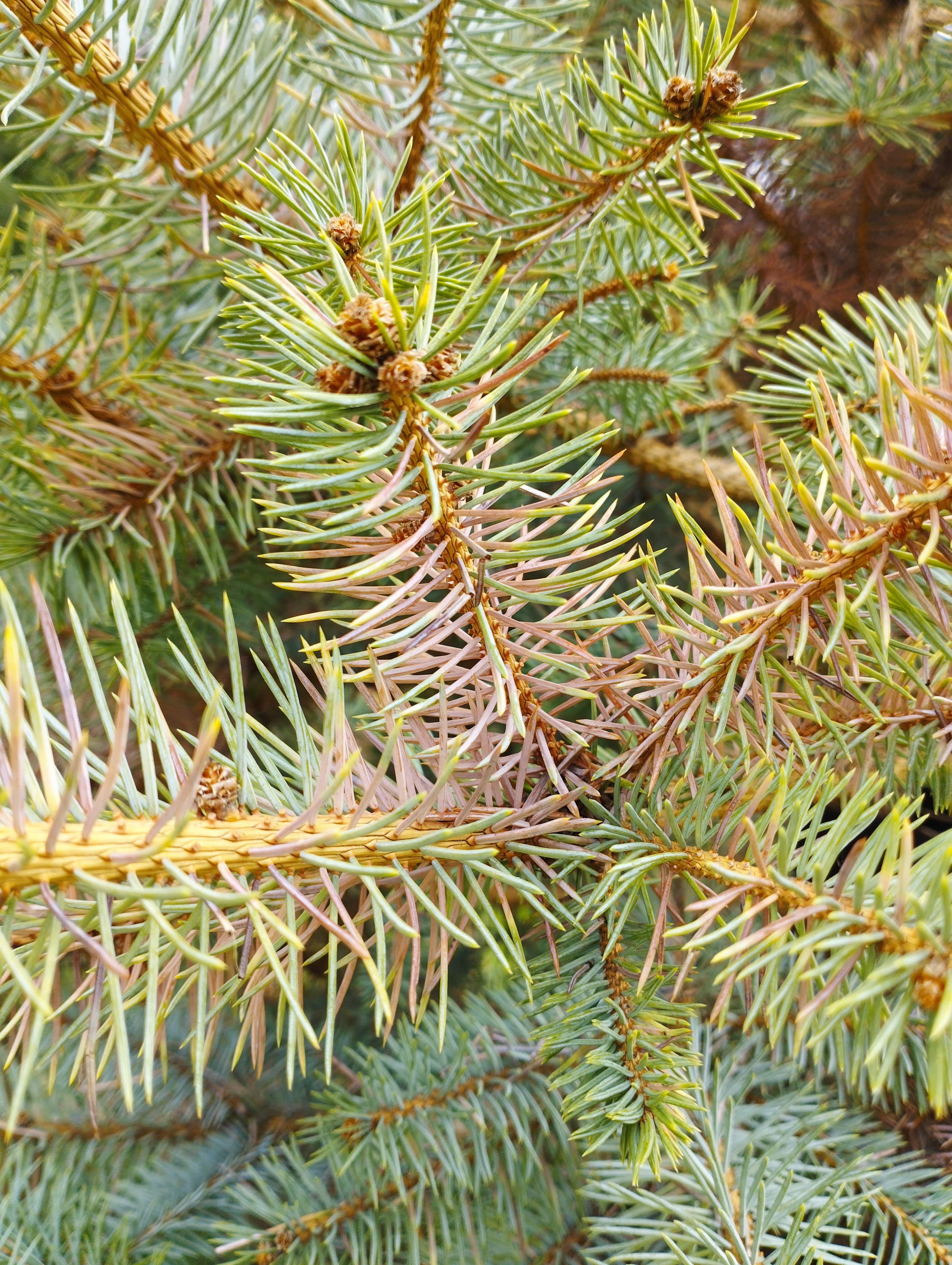 Na jeseň 2022 vysádzané smreky pichľavé začali cca pred 3 týždňami meniť farbu ihlíc na rôznych miestach koruny, nie je to odspodu nahor, ani nijak systematicky, rôzne konáriky začnú takto takmer červenieť..