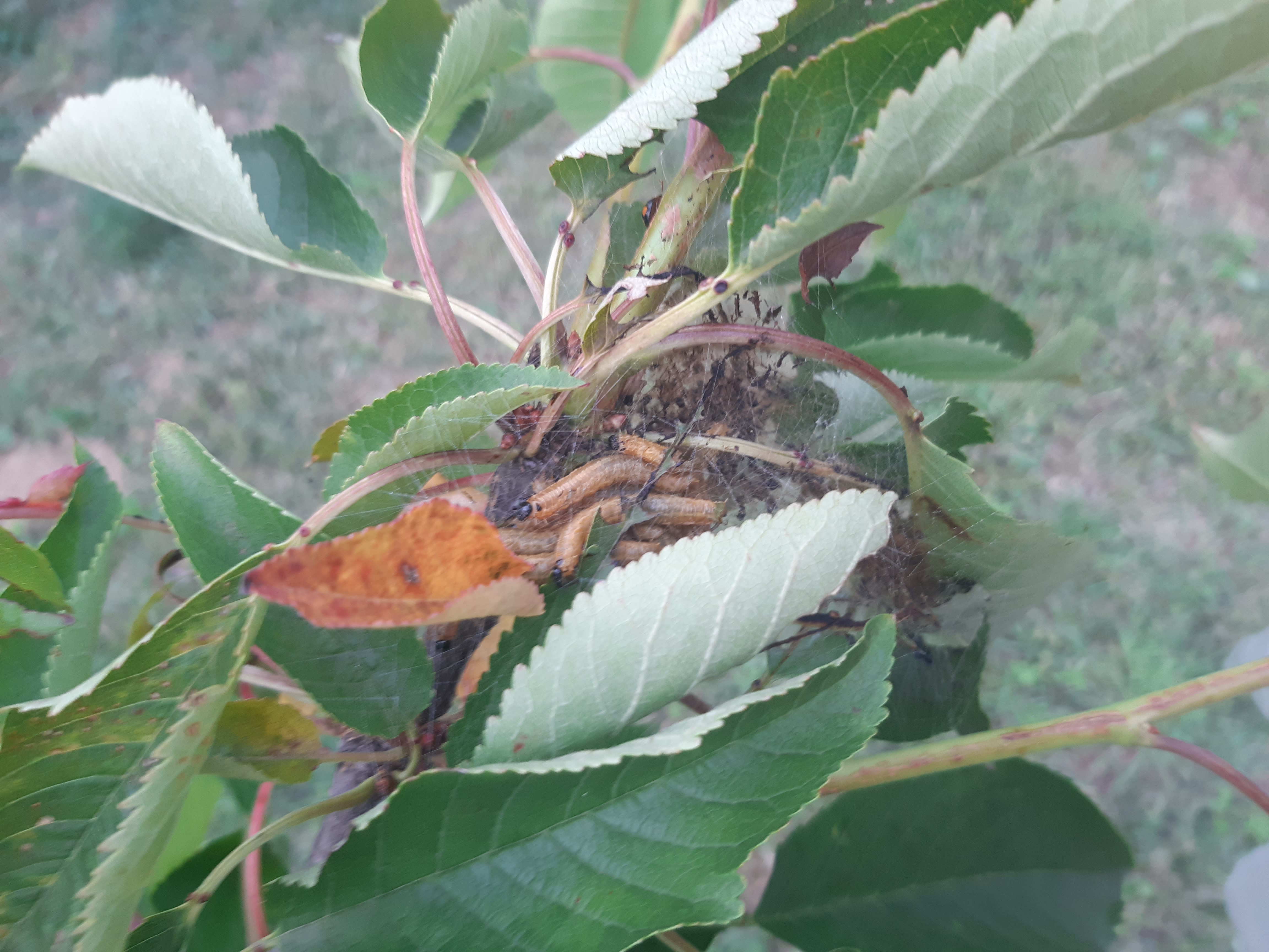 Husenice maju maximalne cca 3-4 cm. Na konari je husta pavucina so zachytenym trusom tmavej farby vo forme asi 1 mm guliciek. Koru na konariku obzrali az do ziveho dreva. Podobne pavuciny s takymto trusom som nasla aj na mate, tam som ale husenice neobjavila.