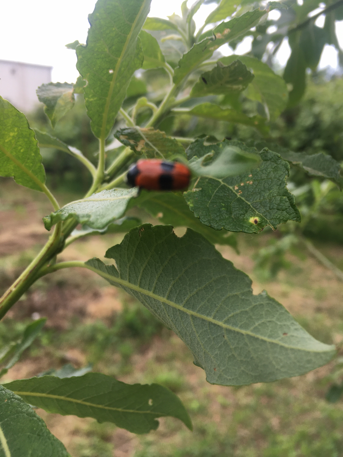 Dobrý deň, ďakujeme za dotaz. Je to chrobák vrbinár hladký (Chrysomelidae) - Clytra laeviuscula. Dospelé chrobáky môžu obhrýzať listy vŕby, brezy a niektorýžch iných drevín. Ale väčšie škody obyčajne nespôsobujú. Larvy žijú v hniezdach mravcov. S pozdravom M. Zúbrik