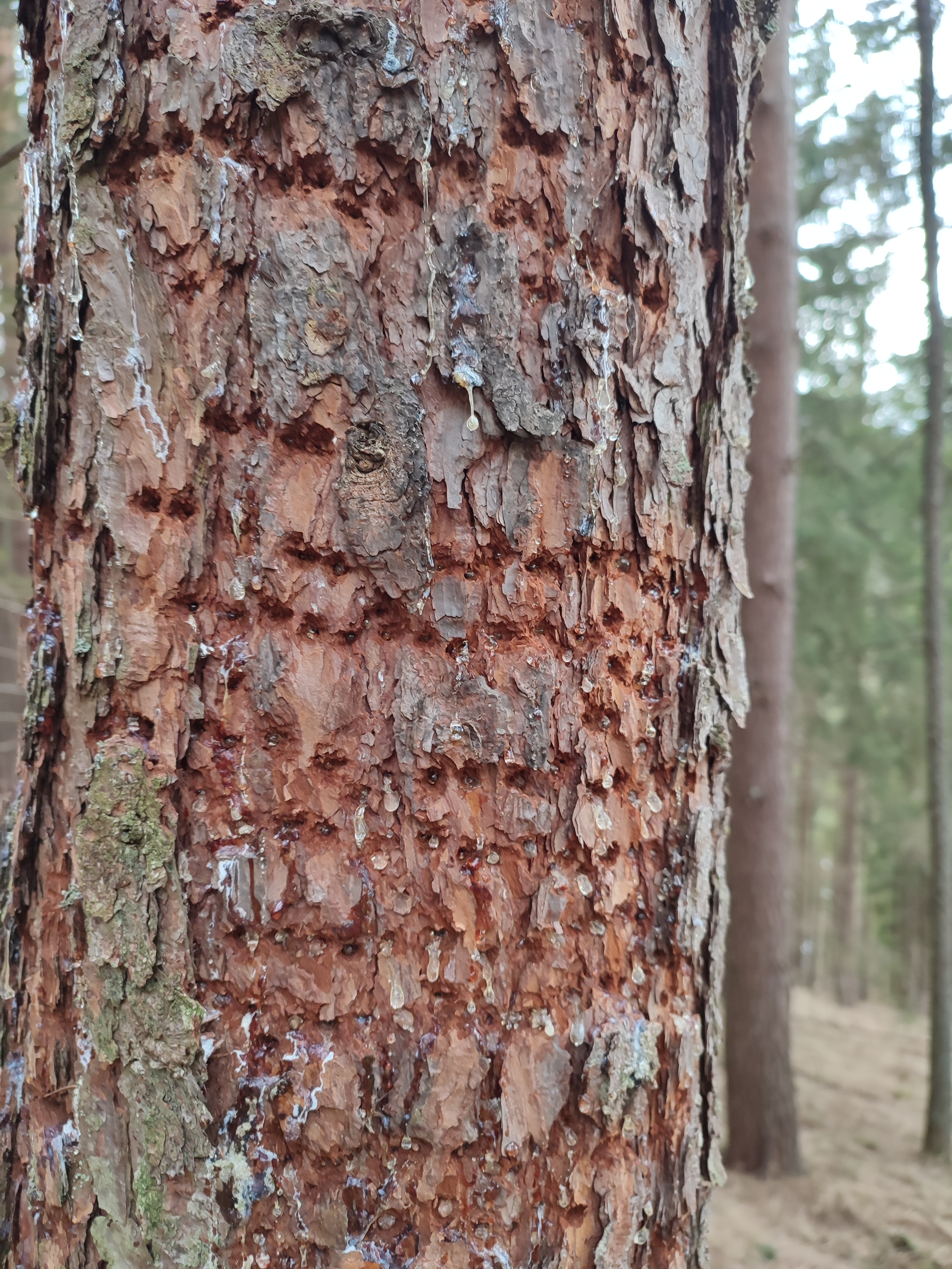 Dobrý večer, poškodenie stromu spôsobil ďateľ. Viac o tomto type poškodenia si môžete prečítať tu: https://www.skodcoviadrevin.sk/skodca/kruzkovanie-stromov-datel . Ronenie miazgy následkom činnosti ďatľa sa prejavuje aj nasledovným spôsobom: https://www.skodcoviadrevin.sk/skodca/oranzova-kora. Ďakujeme za dotaz. S pozdravom MZ.