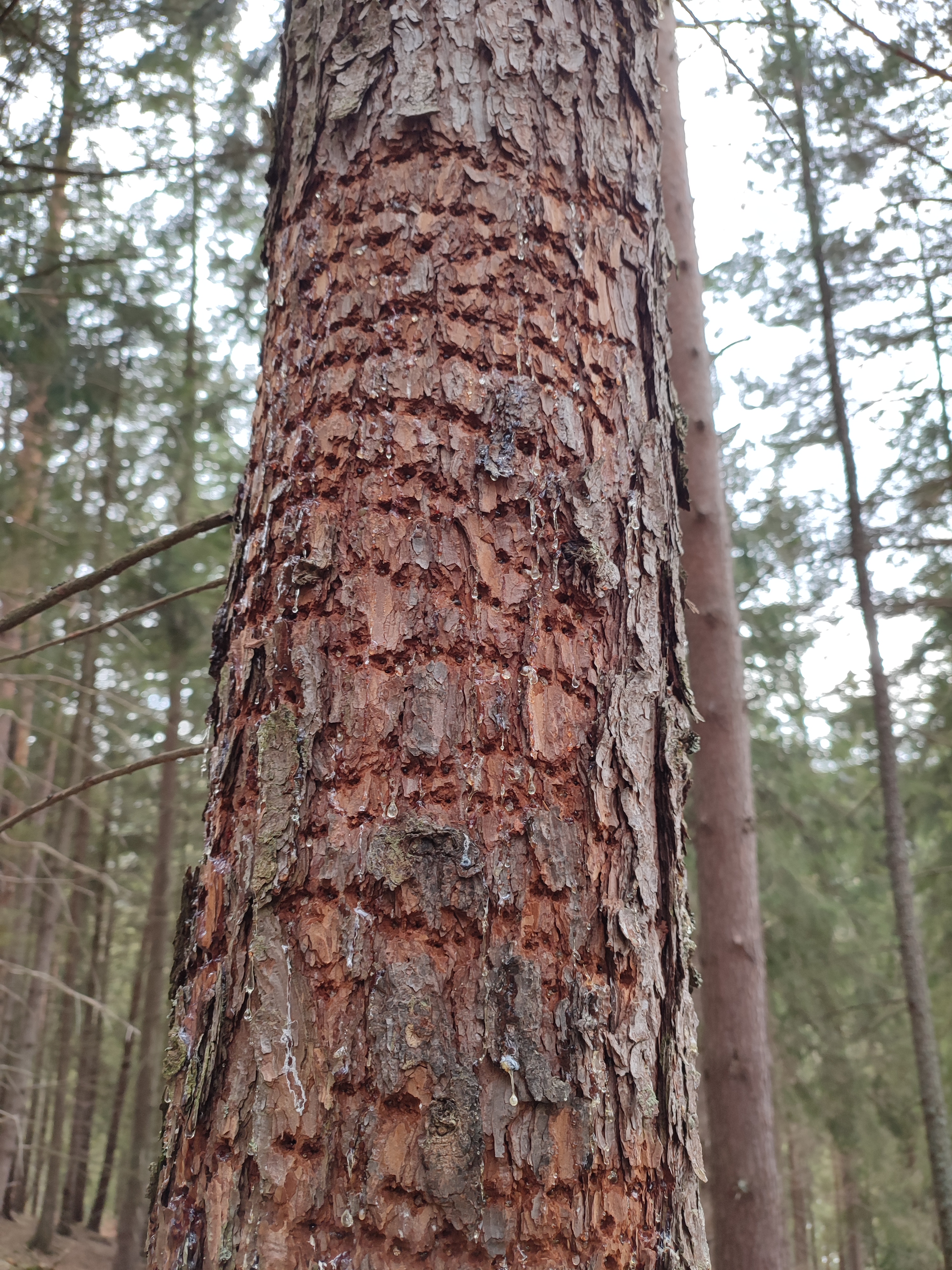 Dobrý deň, ďakujeme za fotky, osobne si tiež myslím, že by sa mohlo jednať o poškodenie vtákmi. Možno by bolo zaujímavé pozrieť s pod kôru či sa tam nachádzajú požerky hmyzu a akého druhu. A taktiež či sa jedná len o individuálne stromy alebo je celkovo zdravotný stav smrekovca v poraste zhoršený. V prípade potreby nás môžete kontaktovať na Lesníckej ochranárskej službe v Banskej Štiavnici.
