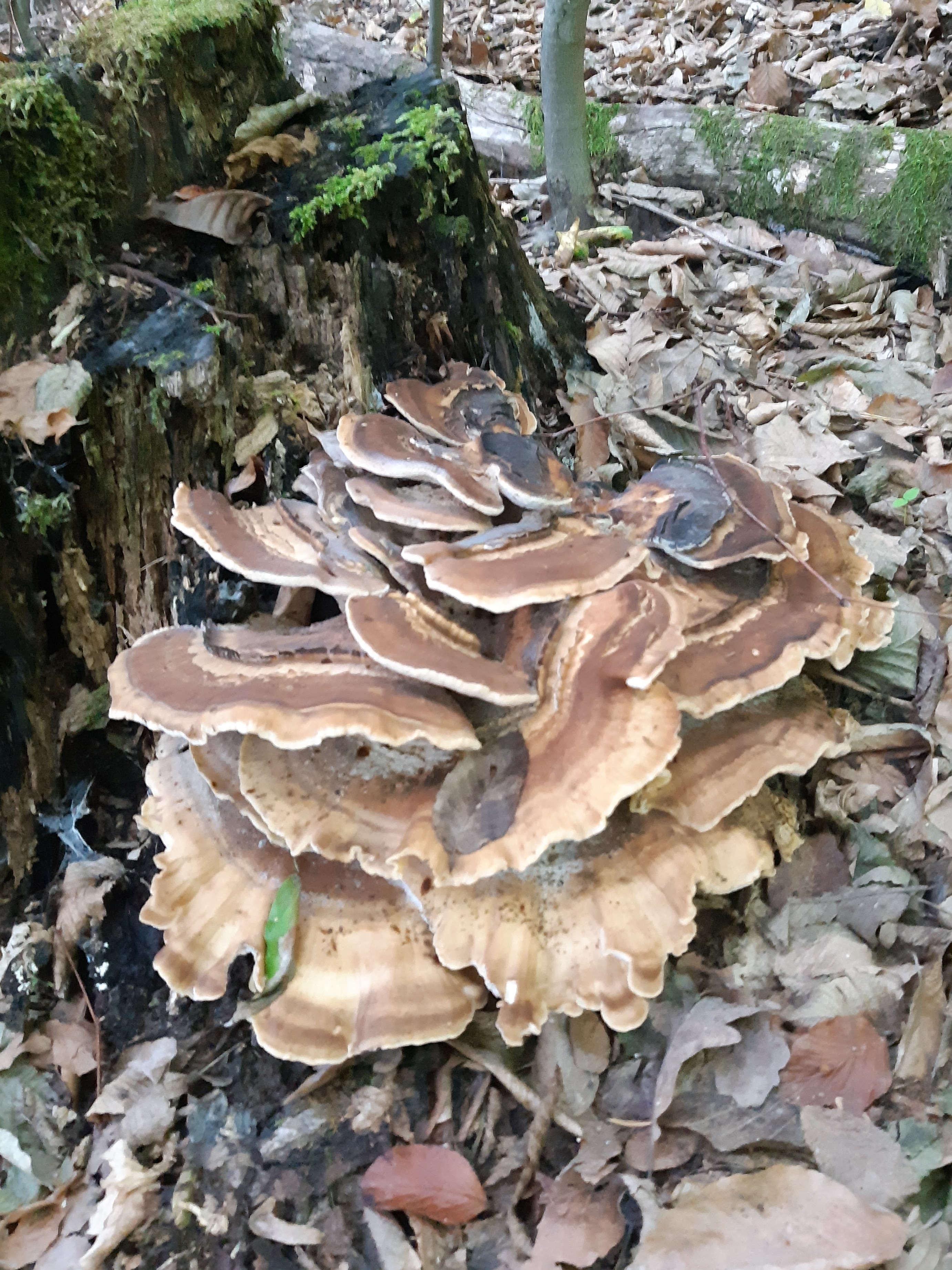 Pozdravujem Marián, podľa priloženej fotky, ak sú plodnice staršie mohol by to byť trúdnikovec pestrý (Trames versicolor), alebo aj dubník (Xylobolus frustulatus), presnejšia determinácia by bola možná keby boli k dispozícii aj plodnice, s pozdravom Roman Leontovyč