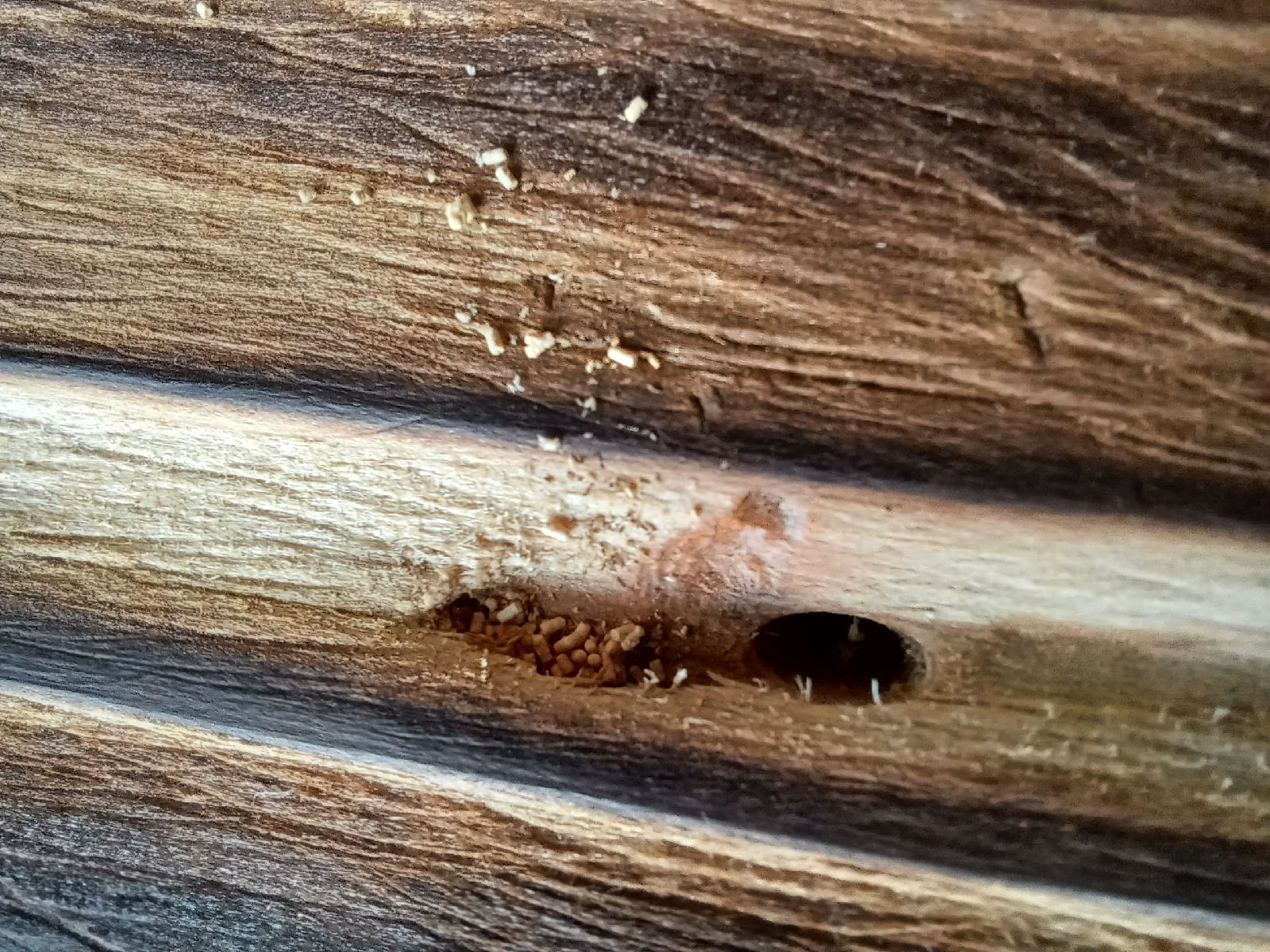 Dobrý deň, ďakujeme za dotaz. Poslal ste 2 obrázky. Na jednom je nejaký bližšie neurčený druh samotárskej včely. Tieto druhy si v dreve vyhrýzajú krátke chodby v ktorých vychovávajú svoje mladé. Časta využívajú už existujúce diery, ktoré vyhlodali iné druhy hmyzu. Nepovažoval by som ich za nebezpečné, zväčša sú len spprievodnými druhmi, ktoré zásadným spôsobom drevo neničia. Na druhom obrázku je výletový otvor. Podľa jeho tvaru sa zdá, že sa jedná o výletový otvor fuzáča - fuzáč krovový. https://www.skodcoviadrevin.sk/skodca/fuzac-krovovy Toto je veľmi vážny druh škodcu. Mrzí nás, ale na trhu momentálne neexistujú prípravky, ktoré by boli schopné zahubiť larvytohot druhu už žijúce v dreve. Opakovaný náter trámov vhodnými prípravkami (s insekticídnym účinkom - poradia vám v najbližšej predajni) pôsobobí preventívne (odporáčam ho realizovať) a môže zabrániť ďalšiemu zhoršeniu stavu. Ale larvy, ktoré už sú v dreve, sa nimi zahubiť nepodarí. Tam by už pomohlo len osloviť špecializované firmy, ktoré sa zaoberajú chemickou dezinfekciou priestorov. Pekný deň MZ