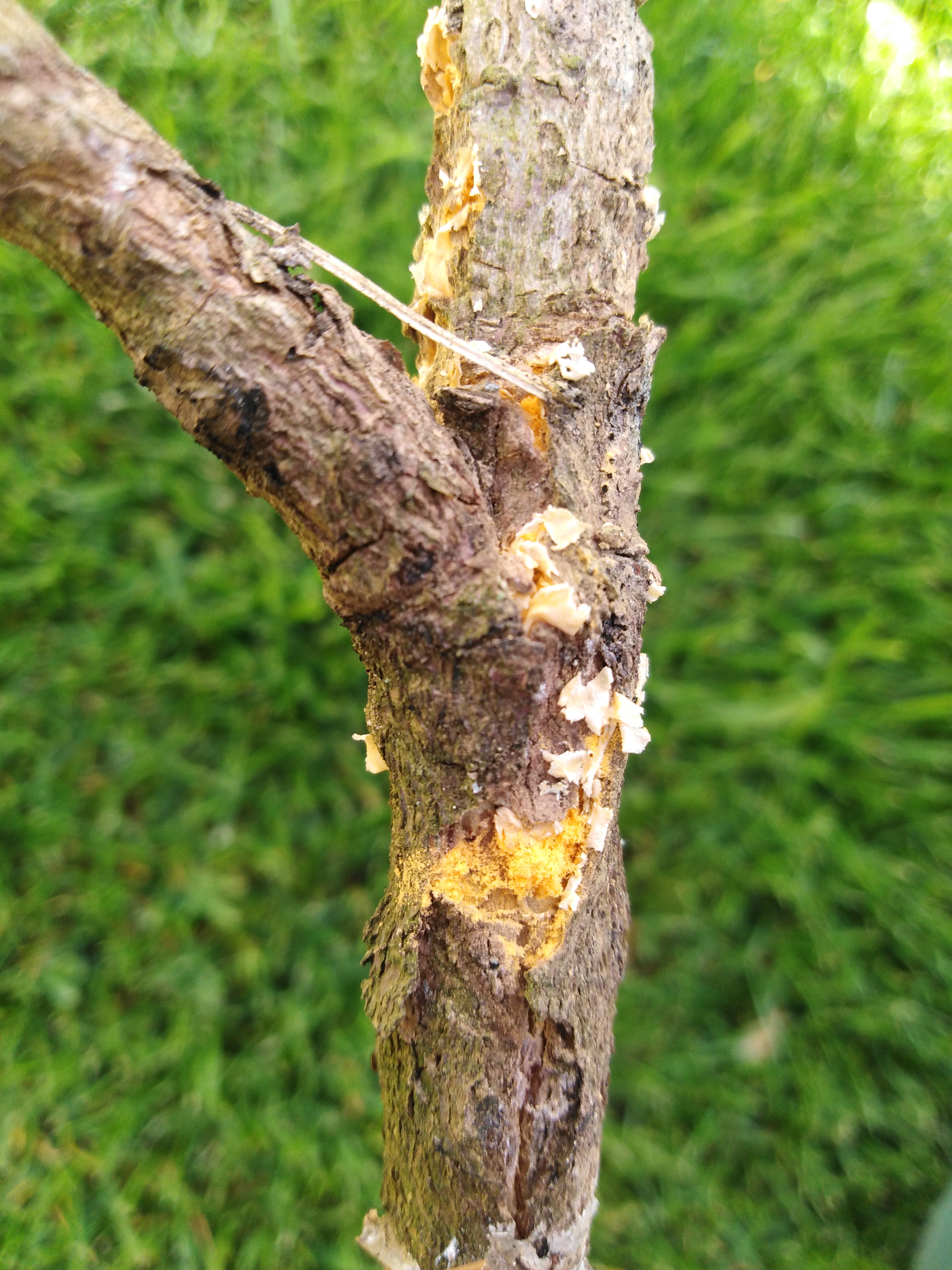 Uschnute ihličie na konáriku, zhrubnute miesta na konáriku v mieste napadnutia, popraskané kôra z ktorej padá svetlo oranžový prach, tie drobné svetle akože výrastky sú mäkké a medzi prstami sa nerozpadnu pripomína to takú šupku,