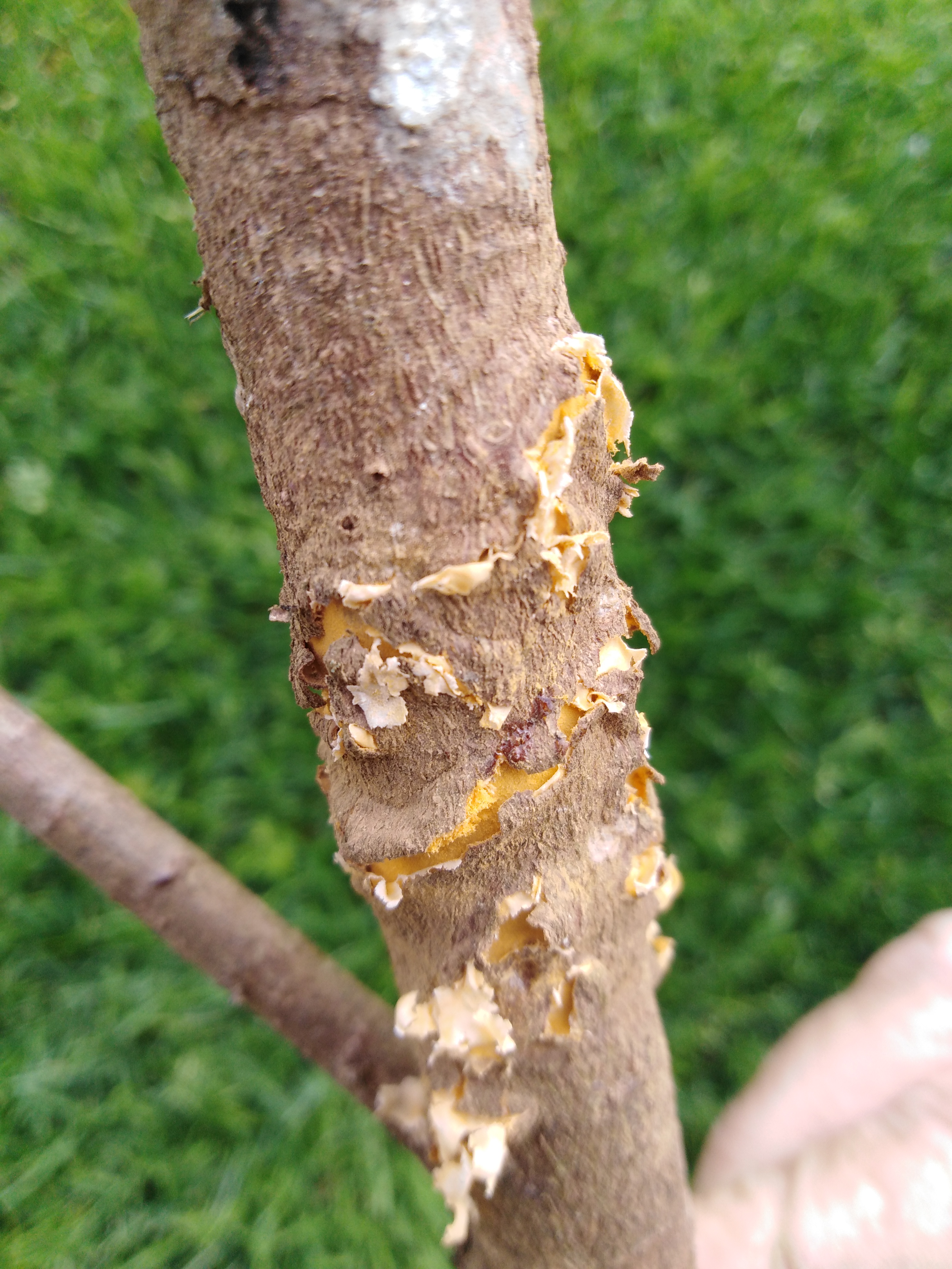 Mladej asi trojročnej hruške v plnom kvete náhle v priebehu jedného týždňa zvädli kvety aj listy. Pri hľadaní príčiny som našiel pri podpníku drobné výtrusy z dreva a len malú dierku v kmeni podpníku. Po zväčšení otvoru som zistil, že drevo je zožrané a temer zostala len kôra po obvode. V diere som našiel bledožltú larvu.