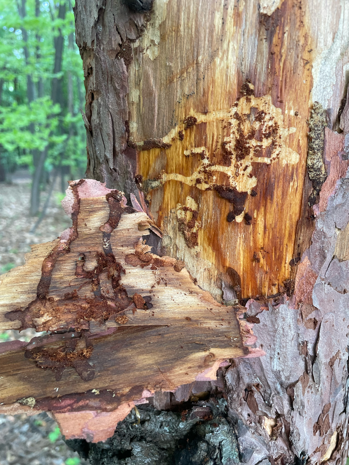 Dobrý deň. Na fotkách je vidieť požerky krasoňa modrého (Phaenops cyanea). Taktiež sú tam požerky fuzáčov a myslím, že aj zástupcov lykožrútov z rodu Orthotomicus (na kmeni bez kôry). S pozdravom JG