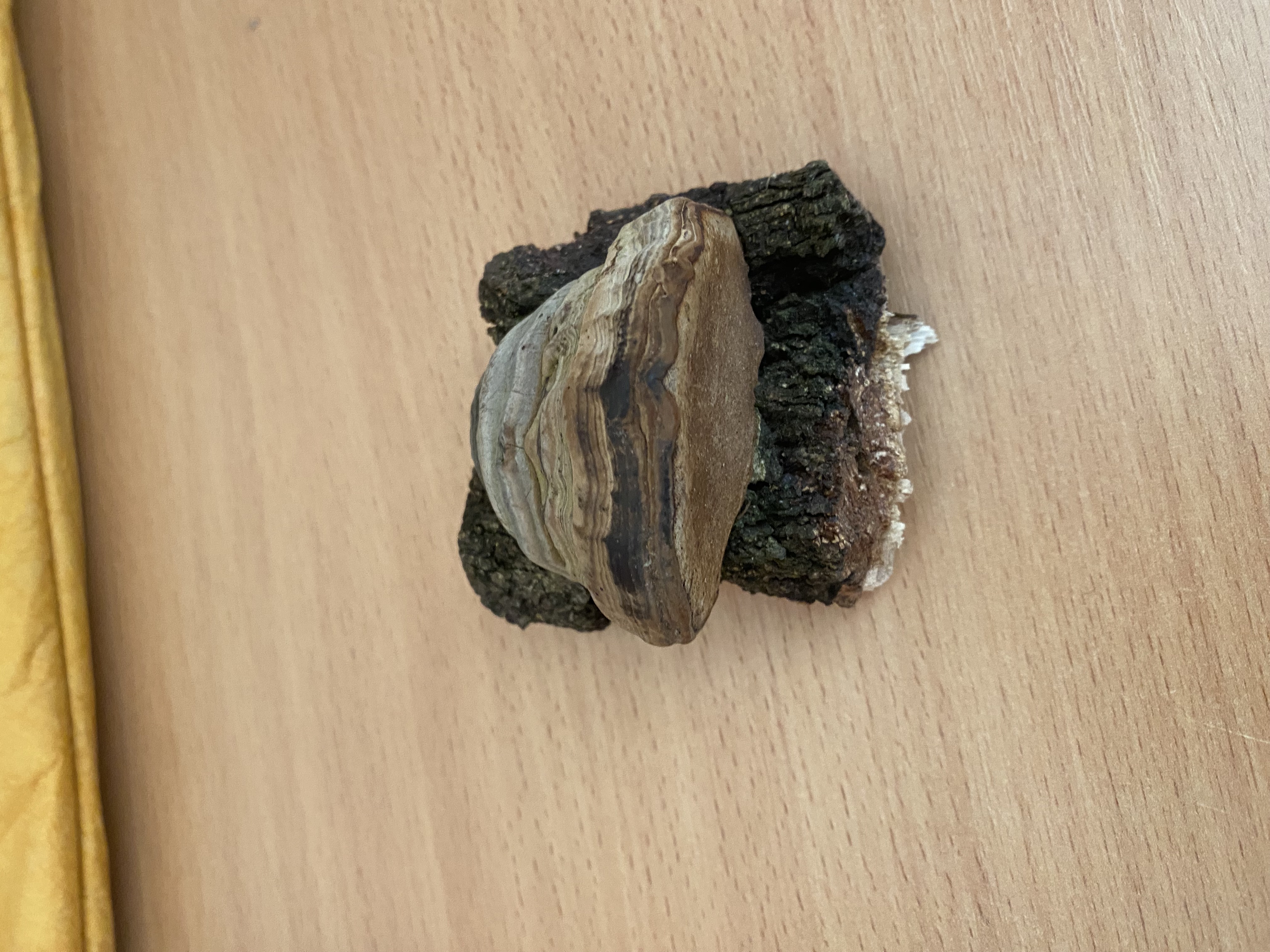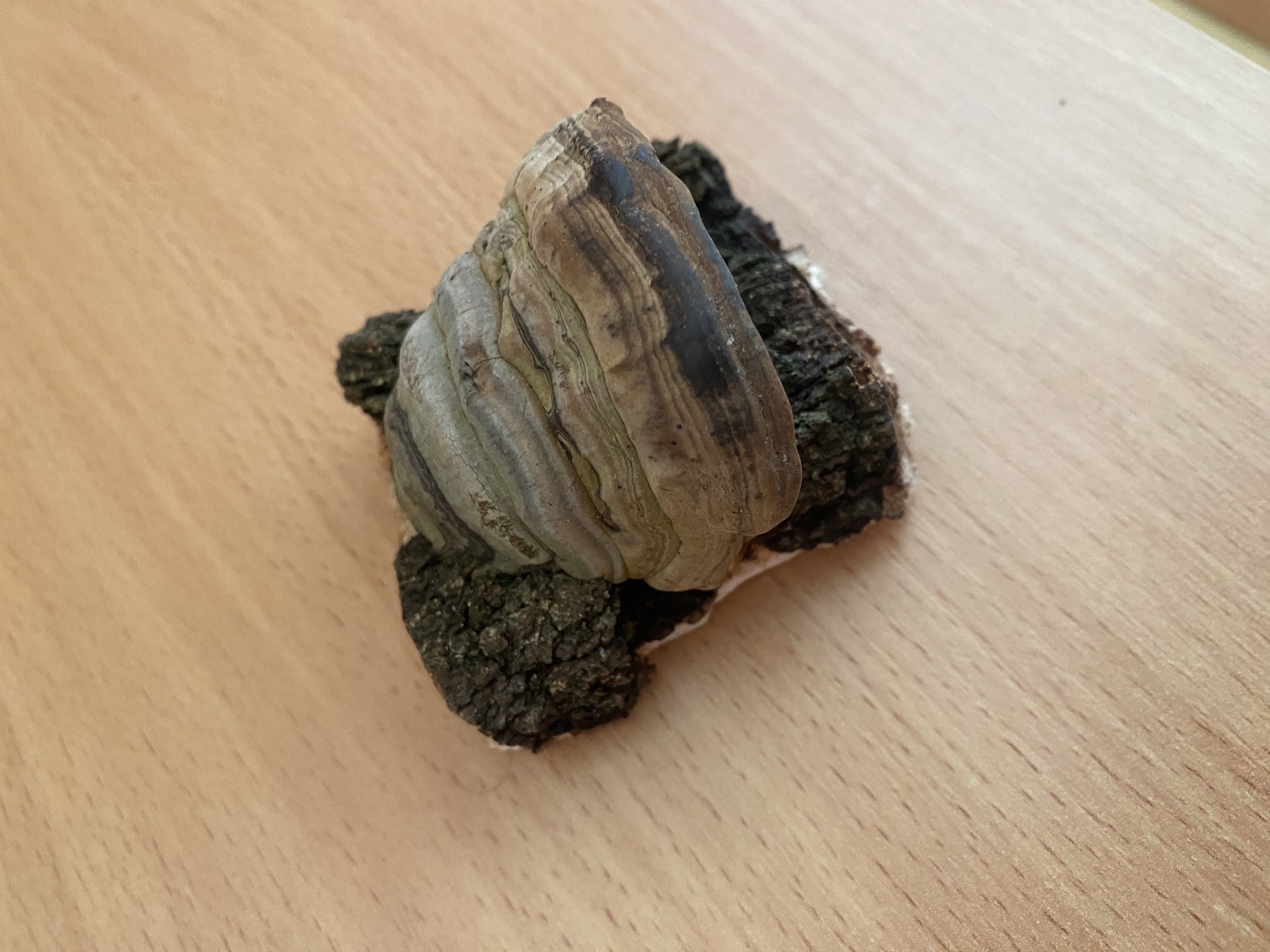 Ide o Trametes versicolor, plodnica napravo by mohla byť Fomes fomentarius, ale aj niečo iné.