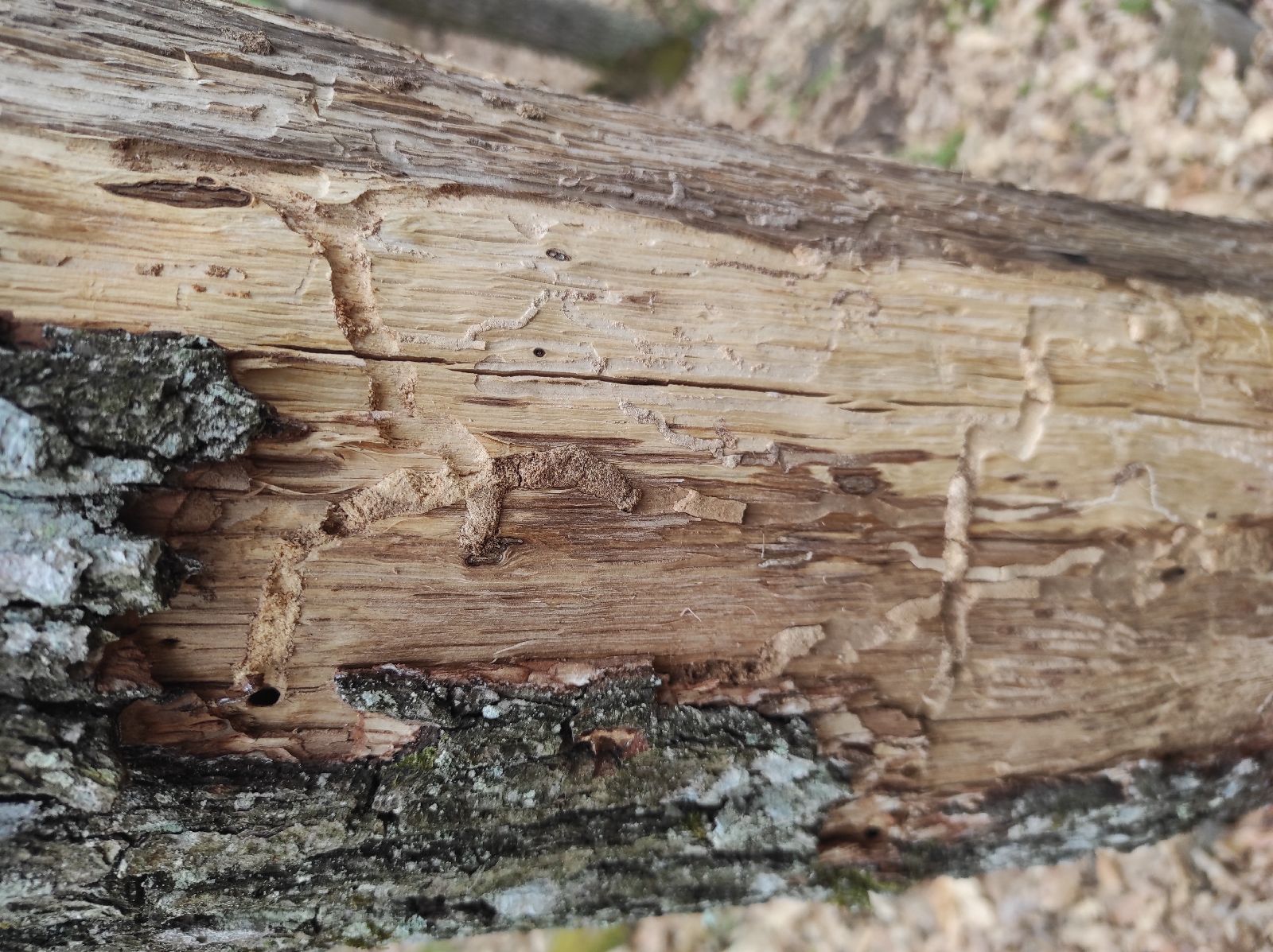 Na obrázku sa nachádza požerok lariev fuzáčov (Cerambycidae). Pravdepodobne sa jedná o fuzáča dubového (Plagionotus arcuatus), avšak, nakoľko na duboch sa vyskytuje viacero druhov fuzáčov, ktorých larvy môžu vytvárať podobné požerky, nemôžeme to tvrdiť so 100% istotou pokiaľ nemáme imágo.