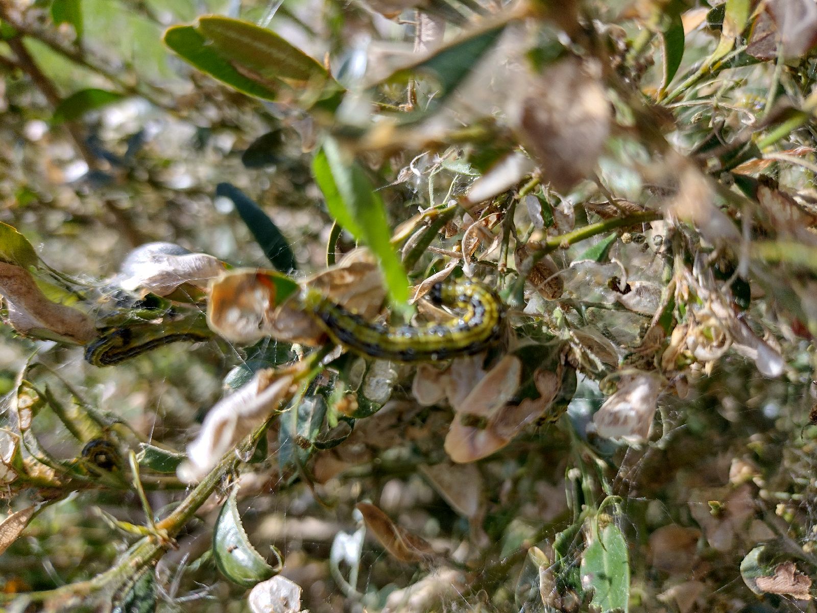 Dobrý deň, je to víjačka krušpánová Cydalima perspectalis. Nočný motýľ pôvodne z Ázie. Húsenice žerú krušpán. Iným drevinám mneškodia. Viac o nej tu: https://www.skodcoviadrevin.sk/skodca/vijacka-kruspanova. Zaberie každý postrek na húsenice motýľov.