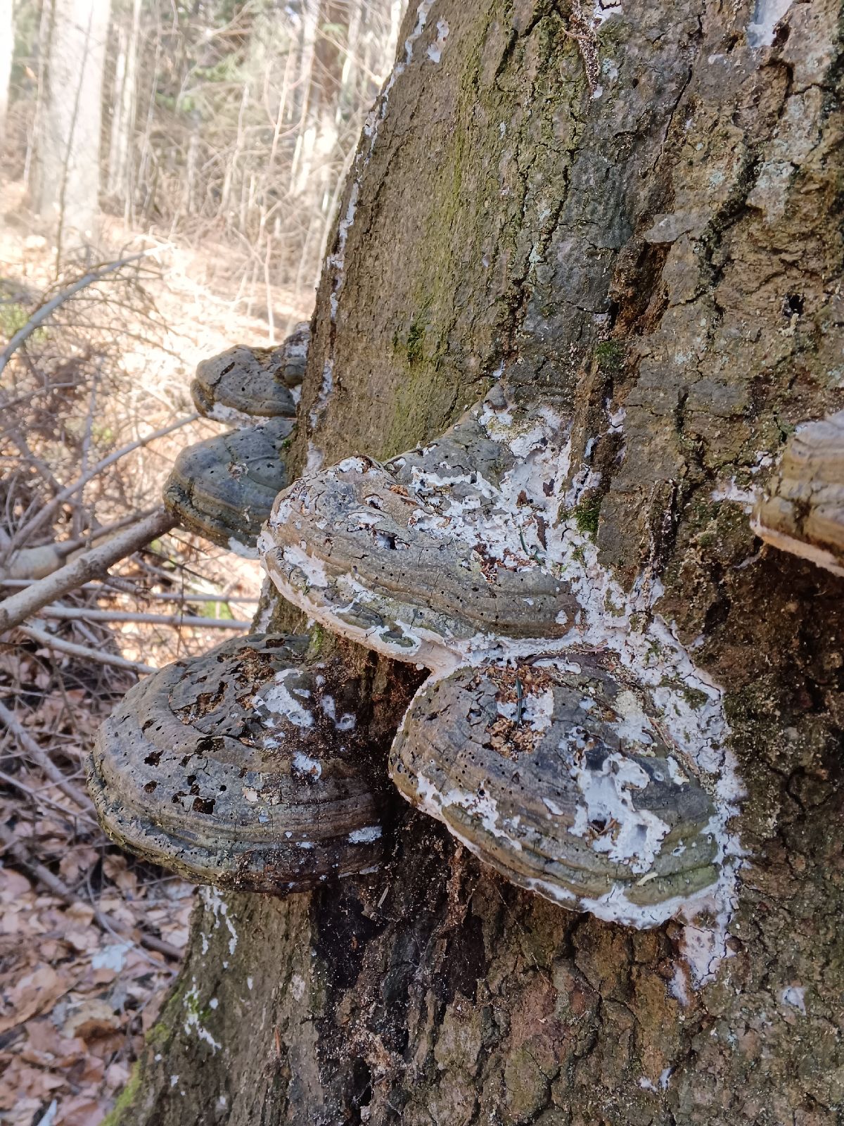 Zhnitý kmeň, zrejme bukový, posiaty plodnicami tejto huby.