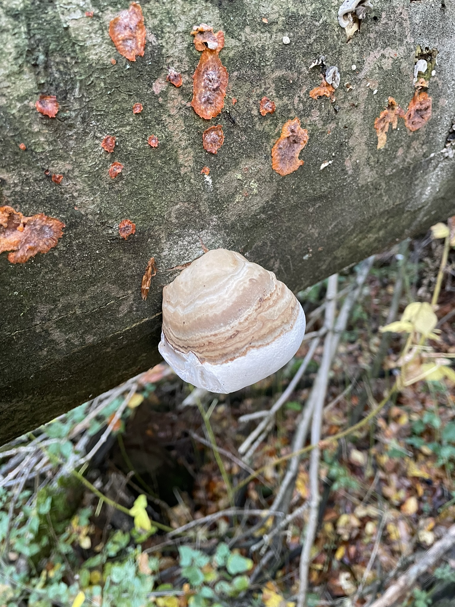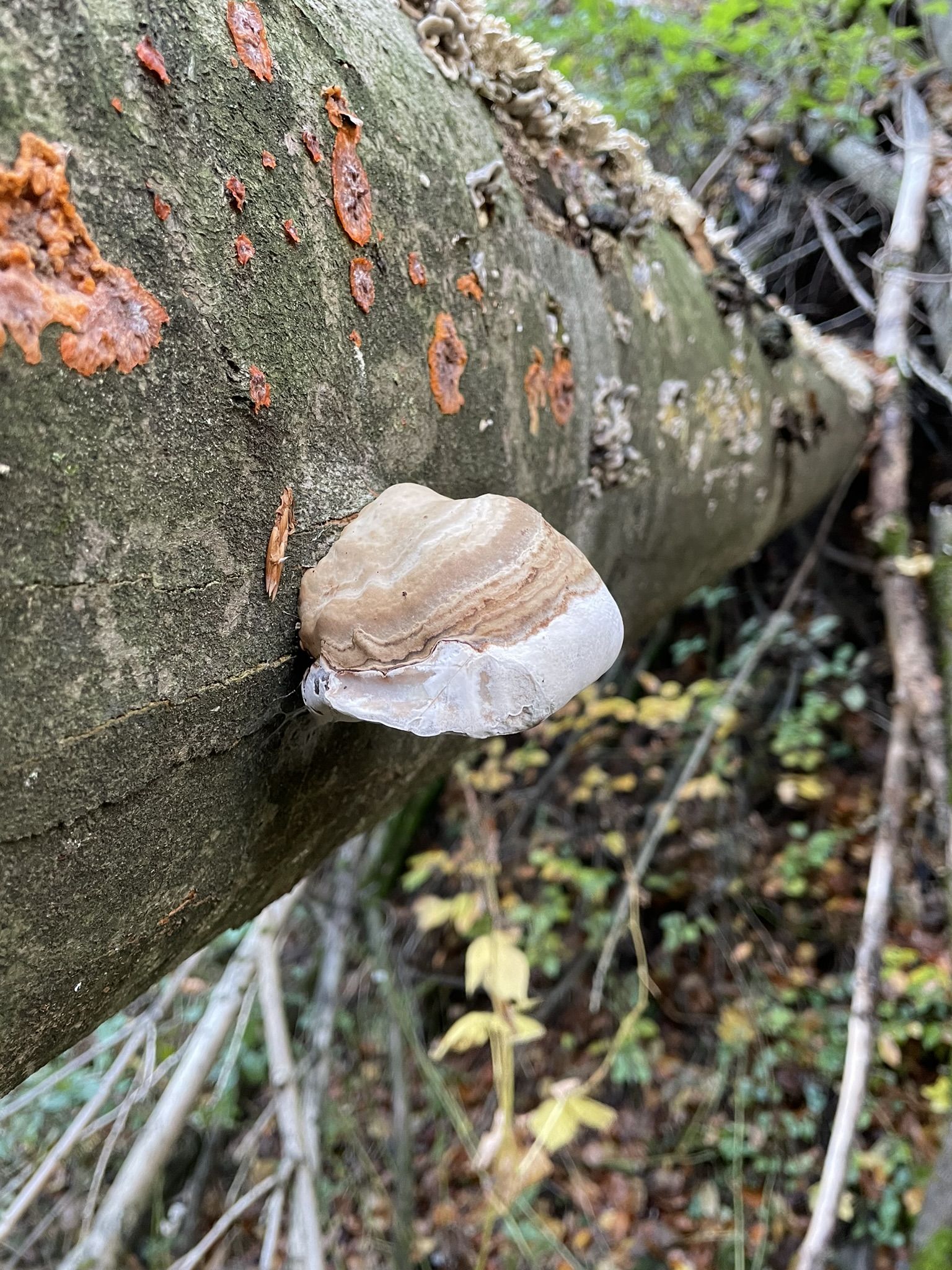 Zdravím, plodnice na vrchnej strane kmeňa majú "lupene", nemôže ísť o Trametes, myslím, že ide o Lenzites betulina. Tie napavo dole sú už Trametes versicolor. Huby treba fotiť aj zo spodnej strany! Ináč, pekný nález.