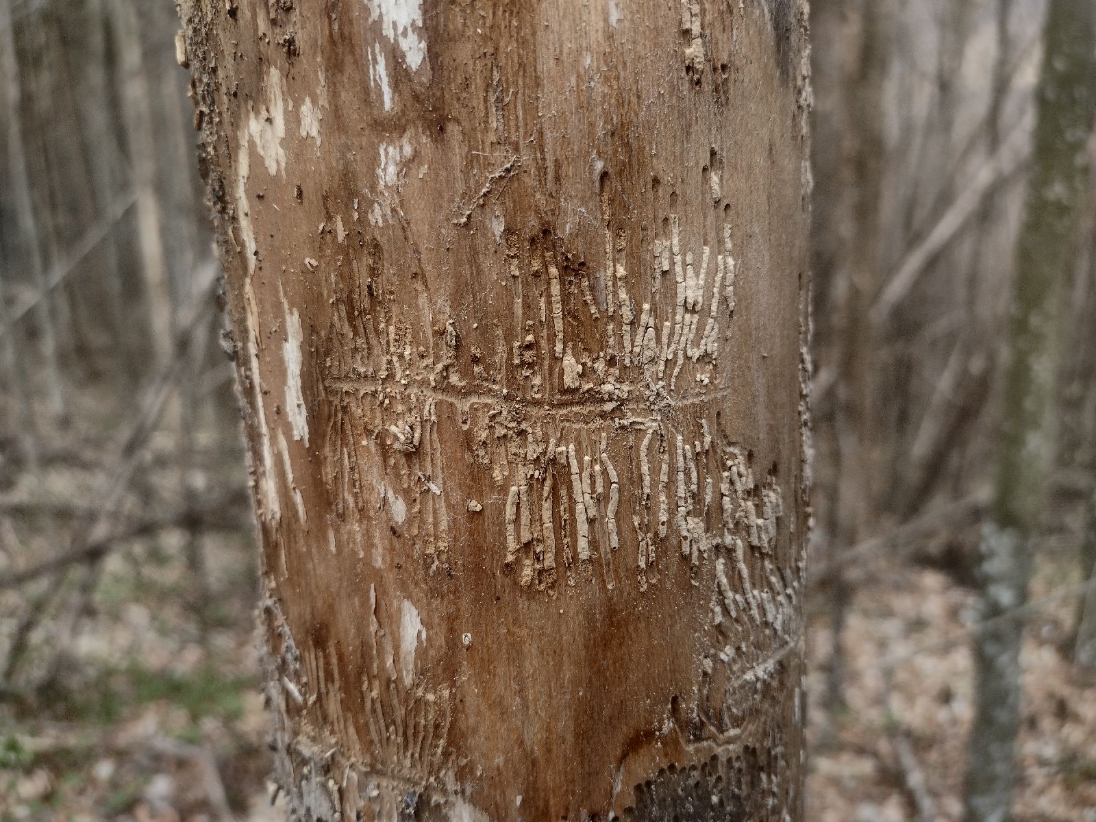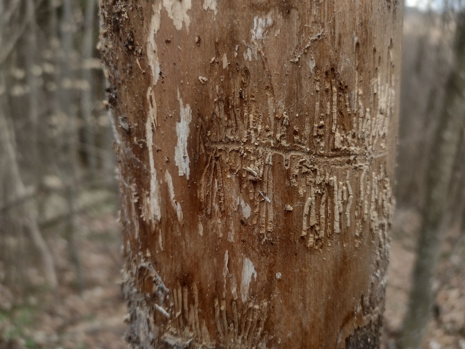 Napadnutá žrďovina jasena podkôrnikom Hylesinus fraxini, charakteristická materská 2 chodba v horizontálnom smere. Larválne chodby kratšie v smere osi kmeňa.