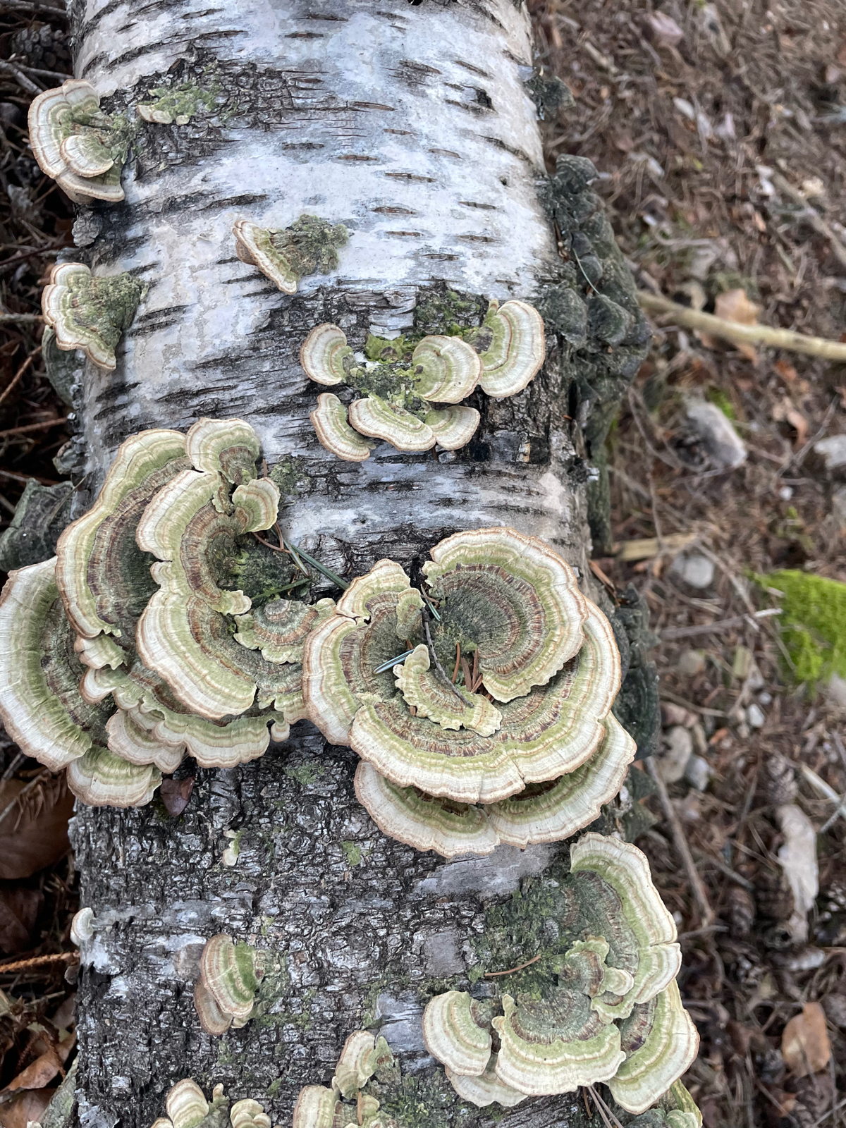 Zdravím, zdá sa, že je to Trametes versicolor. Nie je vidieť hymenofor (spodná strana klobúkov), a preto ešte by som potreoval vylúčiť Trichaptum biforme. Ale podľa tejto fotky T. versicolor.