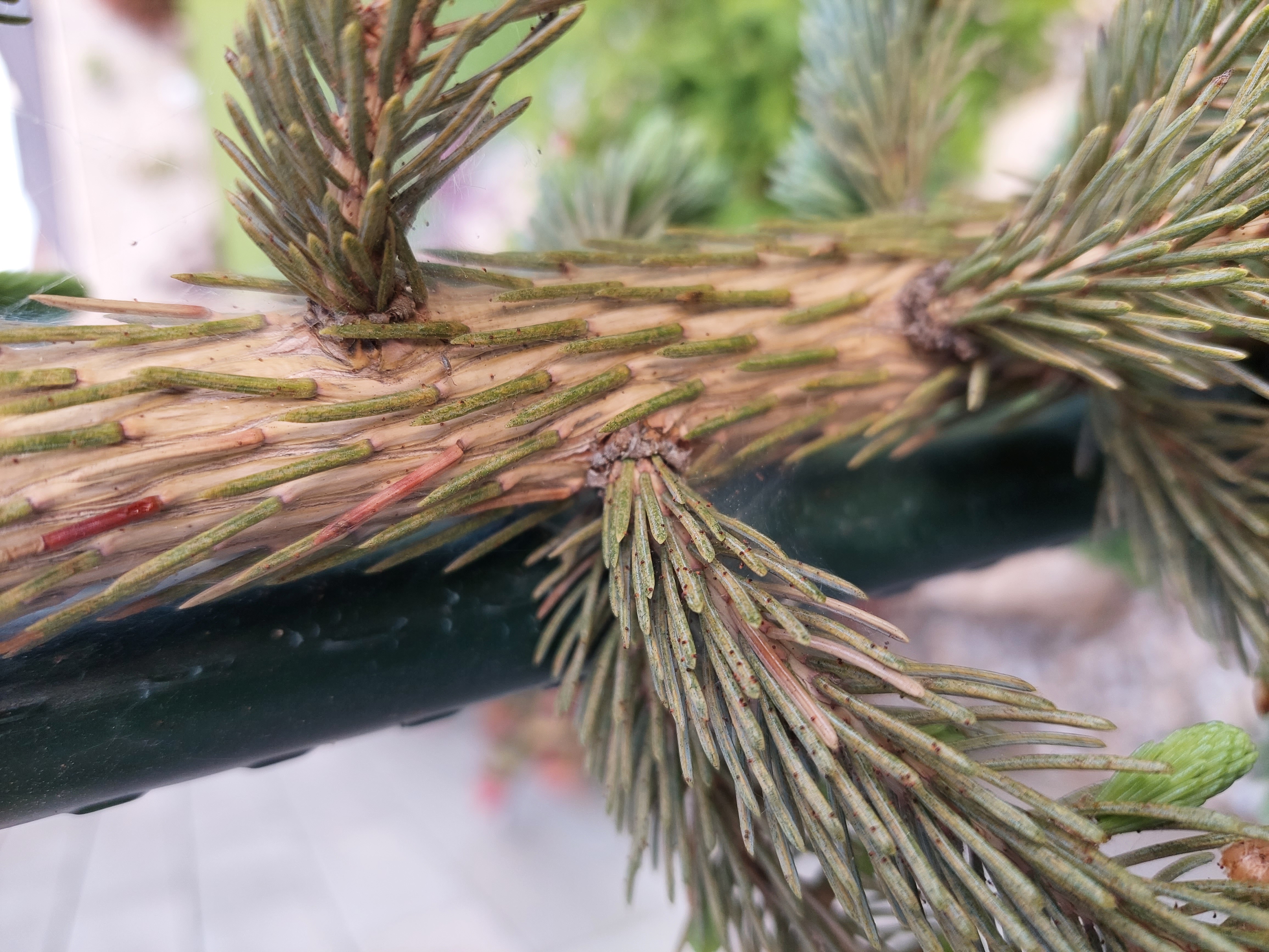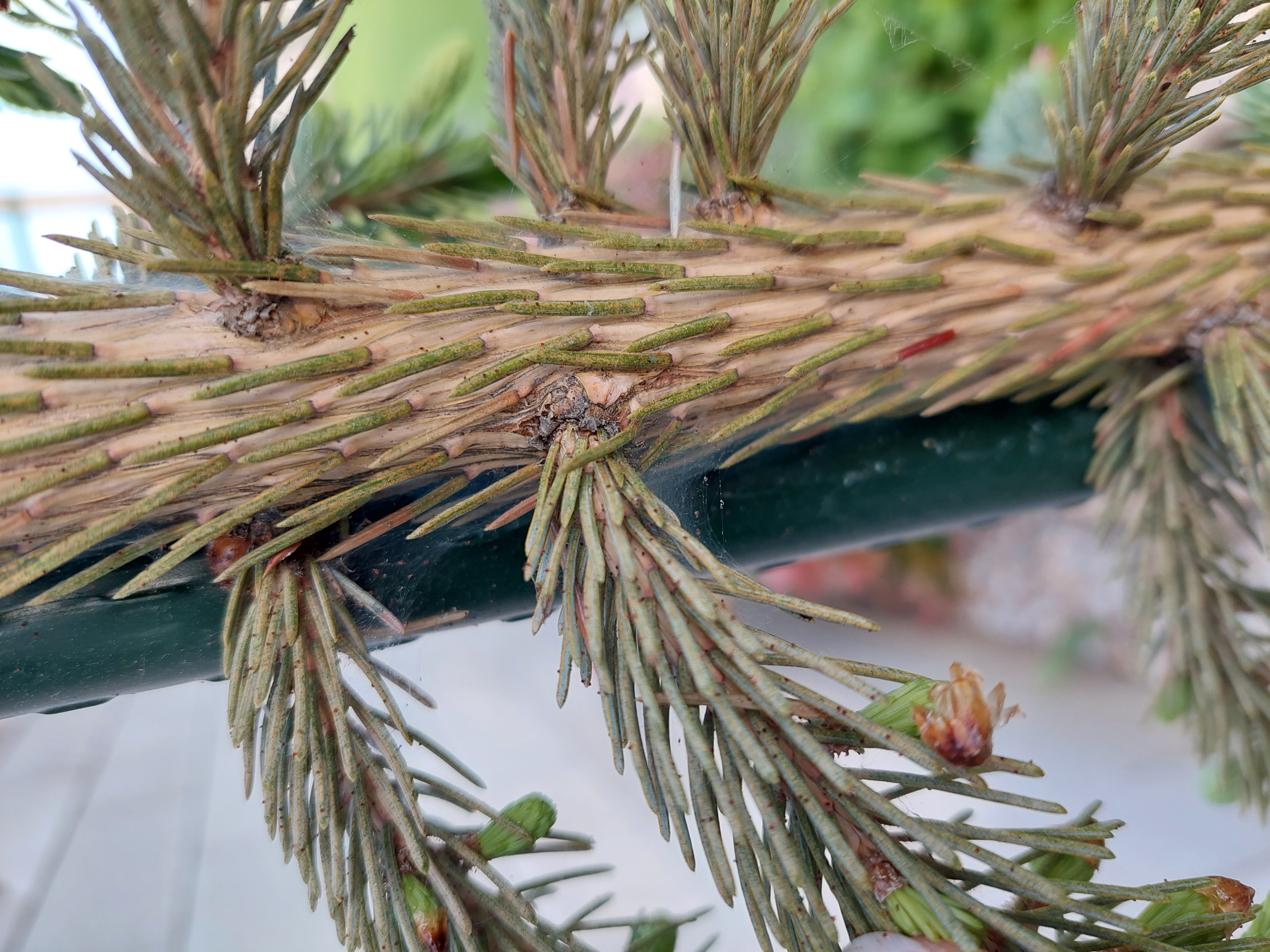 Dobrý deň, je to poškodenie, ktoré spôosobil roztoč druhu Oligonychus ununguis. Jedná sa o veľmi nebezpečného škodcu smreka - vaša drevina nie je jedľa ale smrek. Myslím, že by naň mal pôsobiť prípravok Karate ale v záhradkárskych potrebách by vám mohli odporučiť možno ešte niečo lepšie (čo je práve na trhu) s výraznejším akaricídnym účinkom. Pýtajte si teda niečo na roztoče. Pekný deň. M. Zúbrik