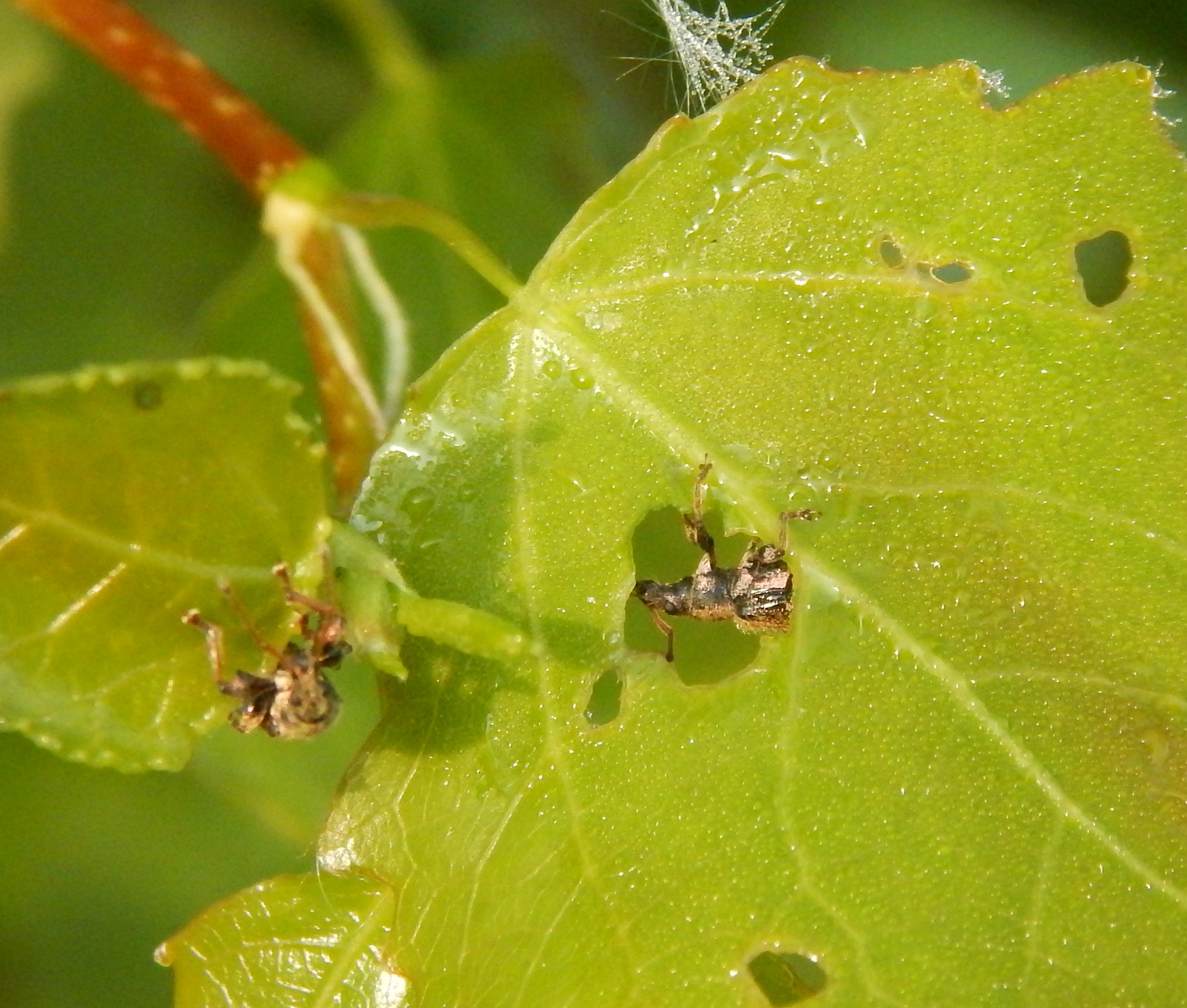 žer na listoch osiky, chrobáky 5-6 mm, Phyllobius betulinus.
