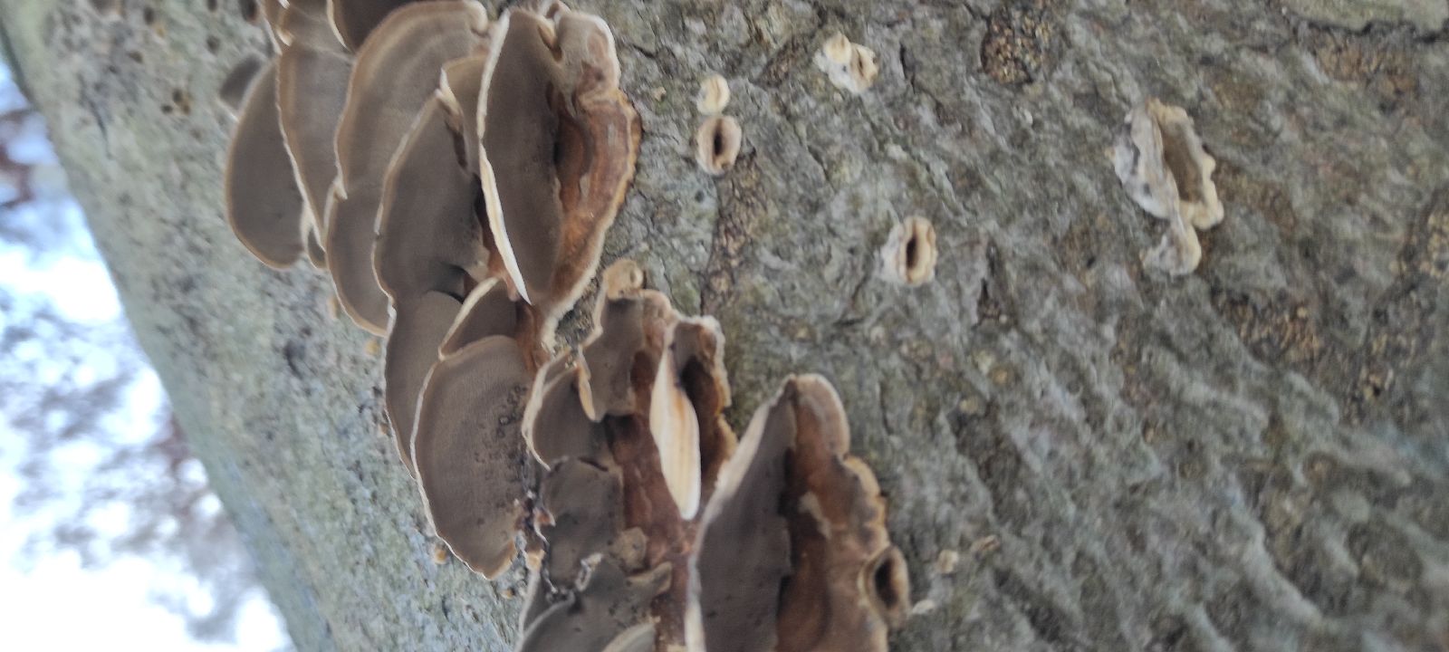 podľa priloženej fotografie sa jedná o Trúdnikovec pestrý - je to drevokazná chorošovitá huba, rastie ako saprofyt na odumretých kmeňoch, pňoch a konároch prevažne listnáčov, hlavnena buku. Vytvára jednoročné, vzácne aj dvojročné plodnice. V prírode rastie počas leta a jesene. Má kozmopolitné rozšírenie. v Európe sa vyskytuje vo všetkých krajinách okrem Škandinávie kde je pomerne vzácna. Využíva sa v TCM- tradičnej čínskej medicíne a v poslednom desaťročí aj v západnej medicíne. Huba je zaradená medzi nejedlé huby, používa sa sušená a podrvená na prášok. Hubu je možné pestovať rovnako ako hlivu ustricovitú na dreve.