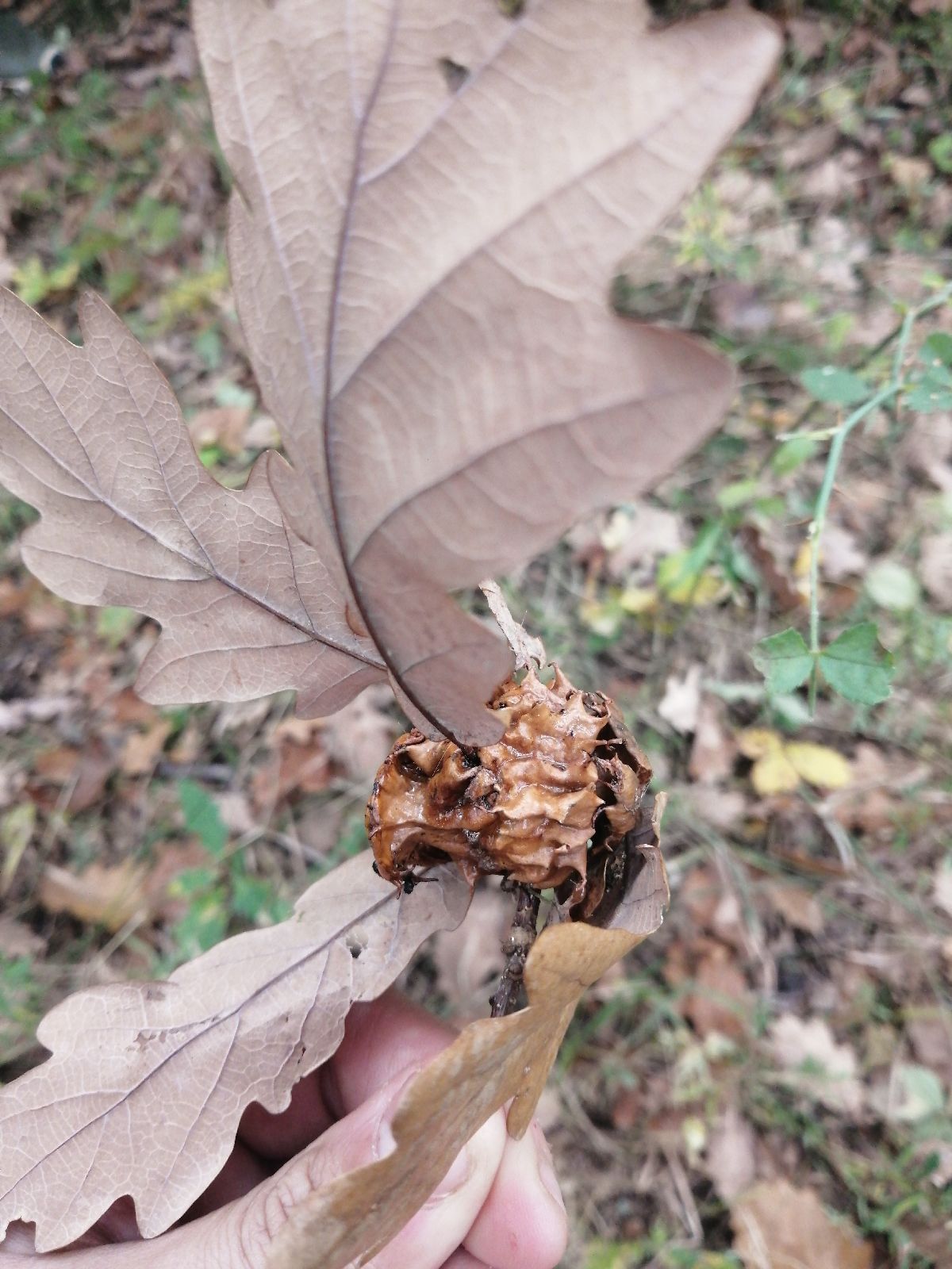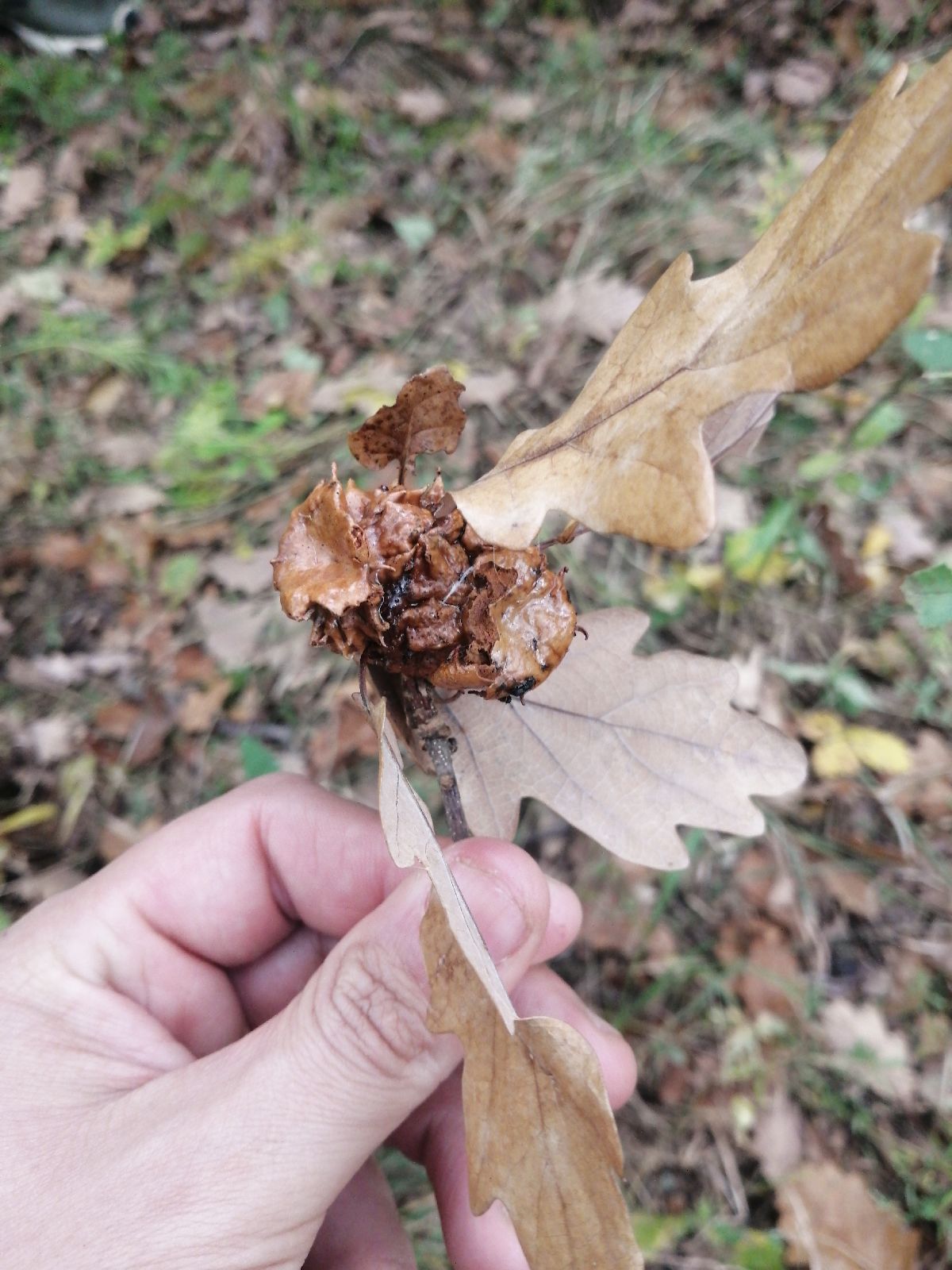 Dobrý deň, je to hálka ktorú spôsobuje na žaluďoch osička Andricus dentimitratus. Jej larva žije vo vnútri hálky. Tieto druhy dokážu poškodiť väčšinu žaluďov na strome, čo môže byť problém, ak má semeno duba slúžiť napríklad na prirodzenú obnovu v následnom lese. Samotnému stromu výskyt tejto hálky neškodí. Pekný deň. MZ