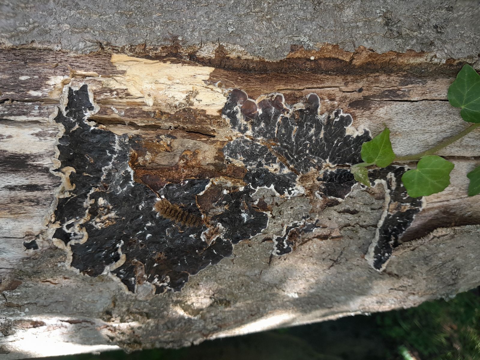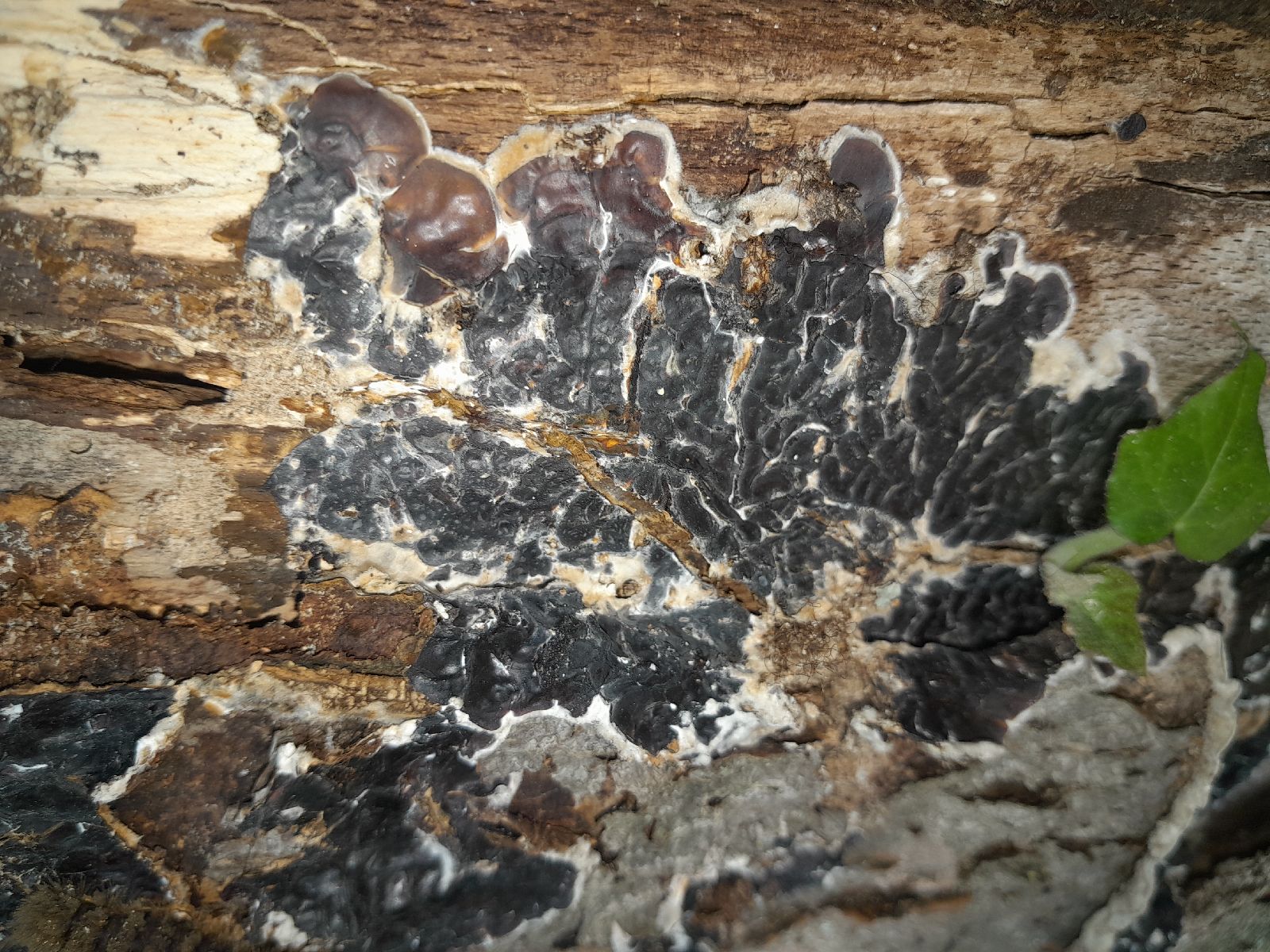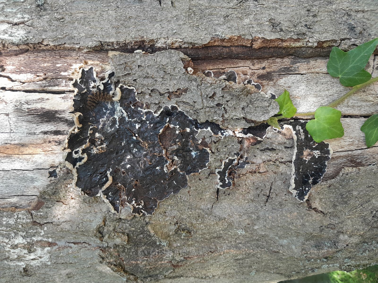 Zdravím, podľa mňa suchá verzia Auricularia mesenterica. Podobný "povlak" vytvára aj Ustulina deusta, avšak u nej je výskyt na koreňovom kŕčku (päte kmeňa) a väčšina povrchu je určite biela až bielozelená. Ale vďaka!