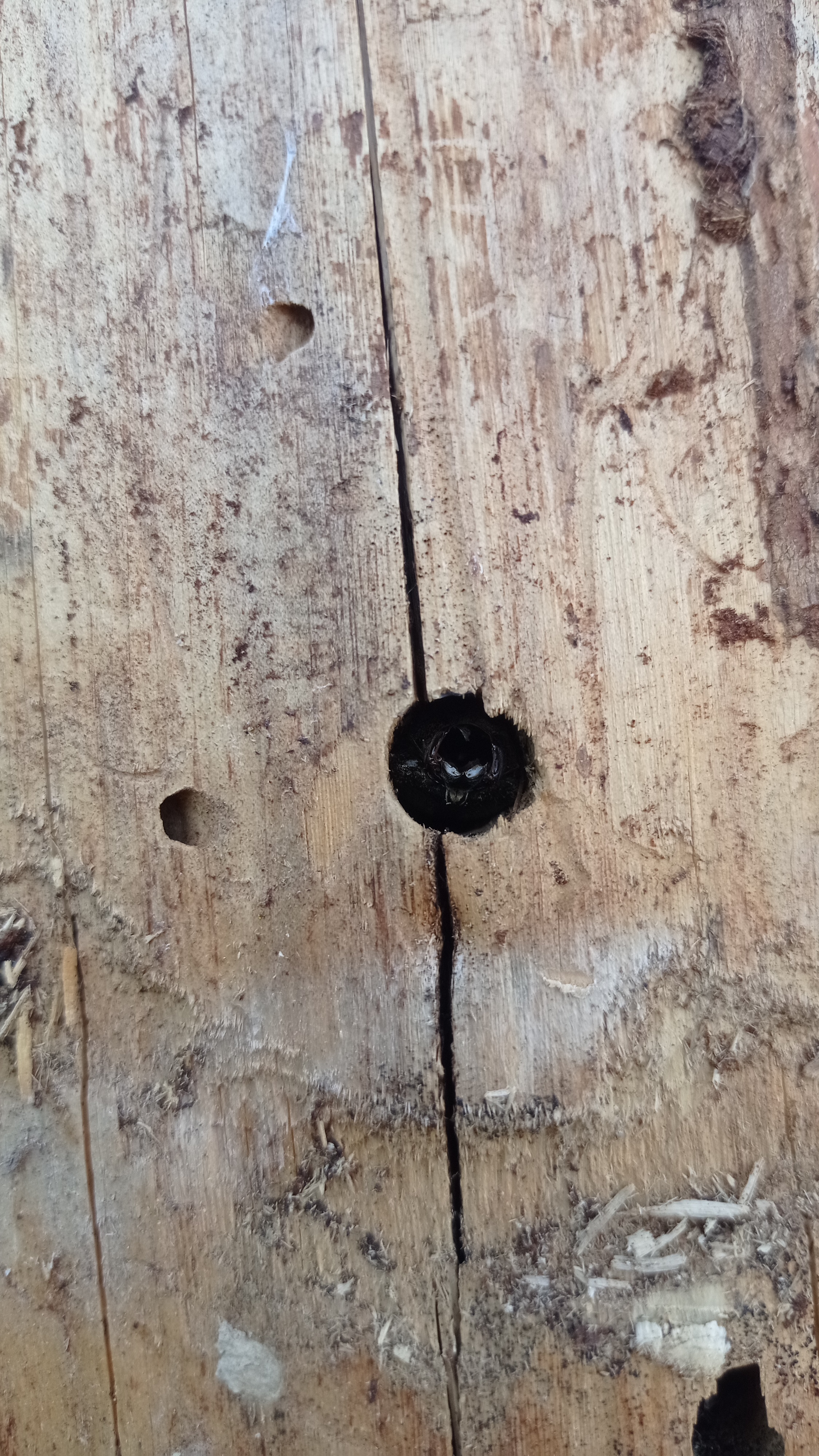 Dobrý deň, ďakujeme za dotaz. Tieto okrúhle výletoévé otvory patria niektorému zástupcovi čeľade Siricidae. Pravdepodobne patria bežnému druhu pílovka smreková Sirex noctilio. S pozdravom M. Zúbrik