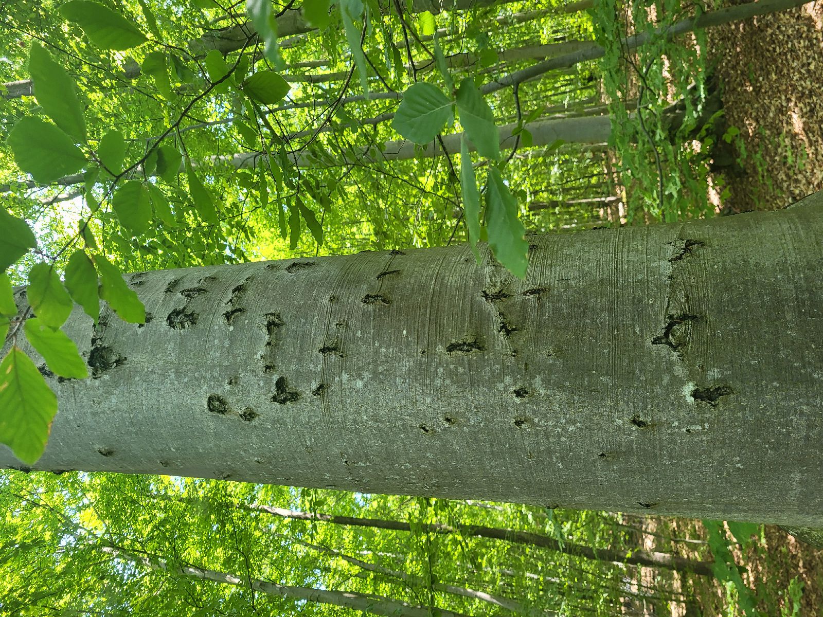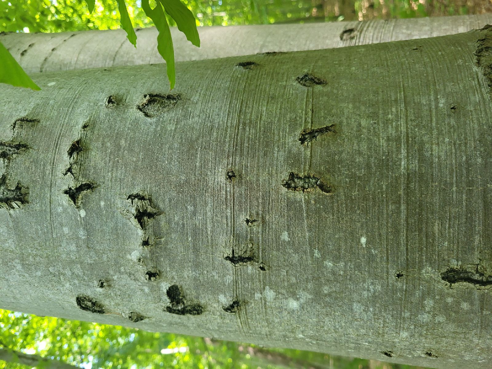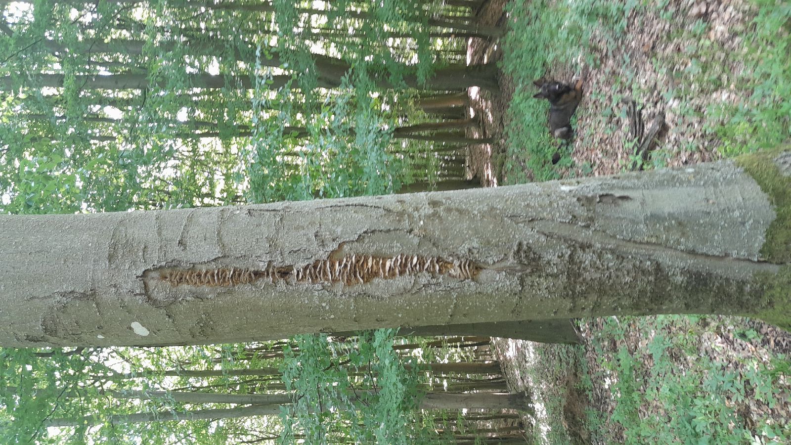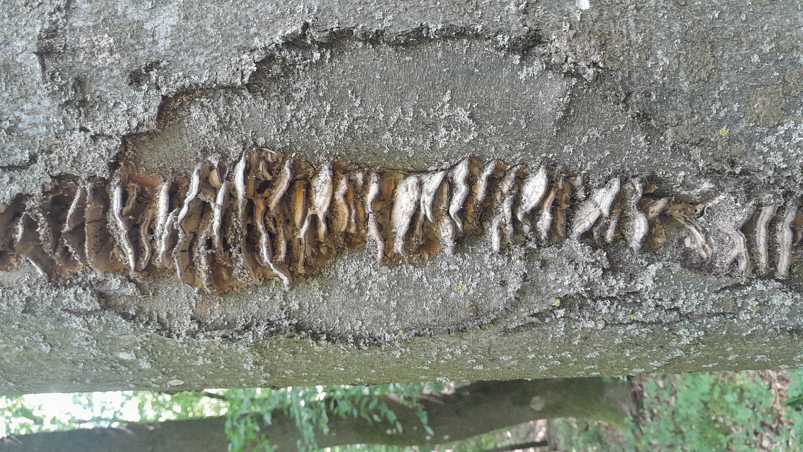 Dobrý deň. Vidím tam odumretý hrab, ktorý bol následne naletený červotočom obyčajným (Ptilinus pectinicornis). To otesanie do dreva spôsobili pravdepodobne ďatle. S pozdravom JG