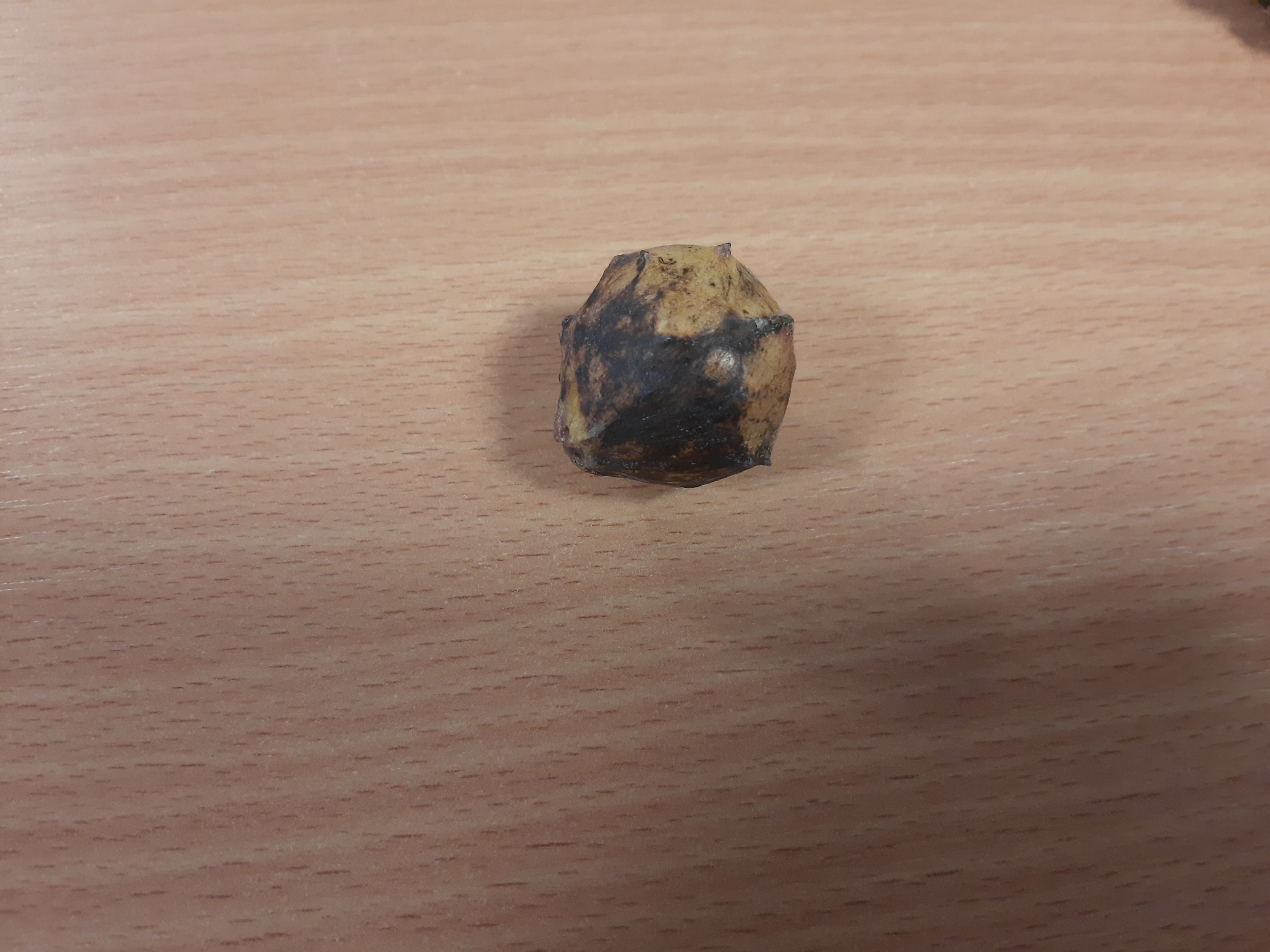 je to hálka osičky Andricus hungaricus. Počas roka sa v nej vyvíja larva osičky a v tomto období padajú na zem, prezimujú a dospelé osičky sa liahnu na jar.