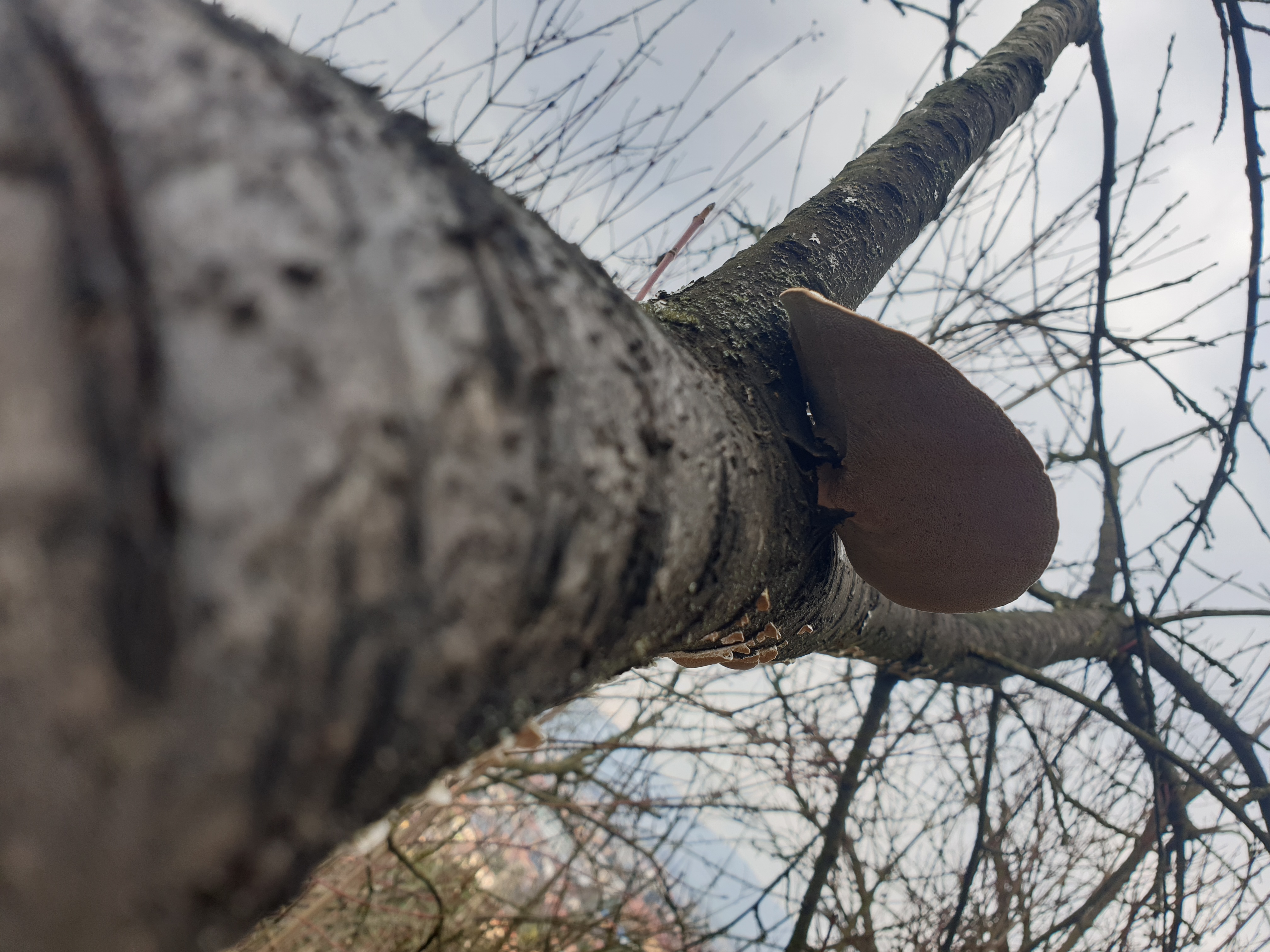 Mladé plodnice na kmeni smreka. Mohol by to byť druh drevokaznej huby s názvom Práchnovček pásikavý.