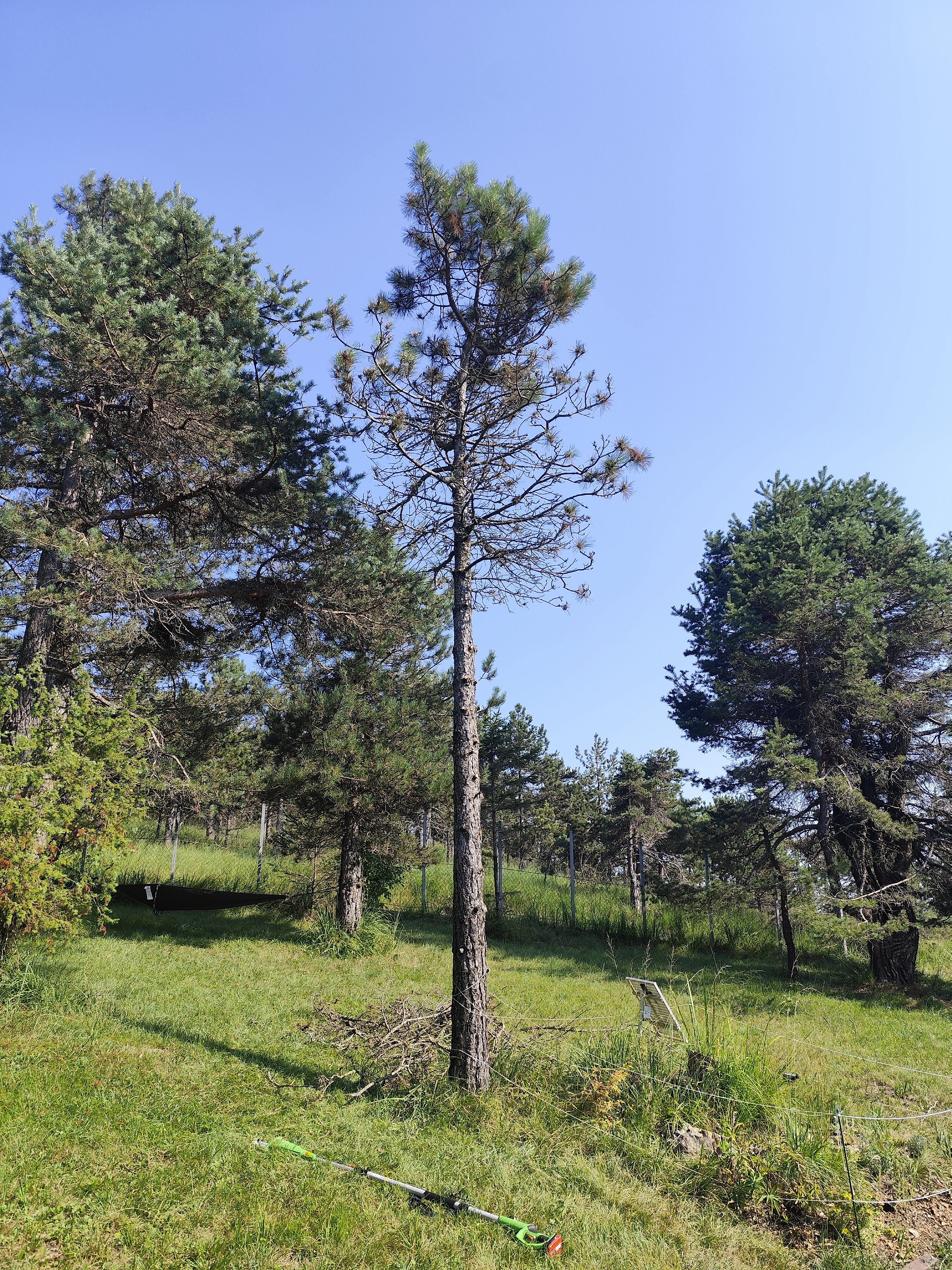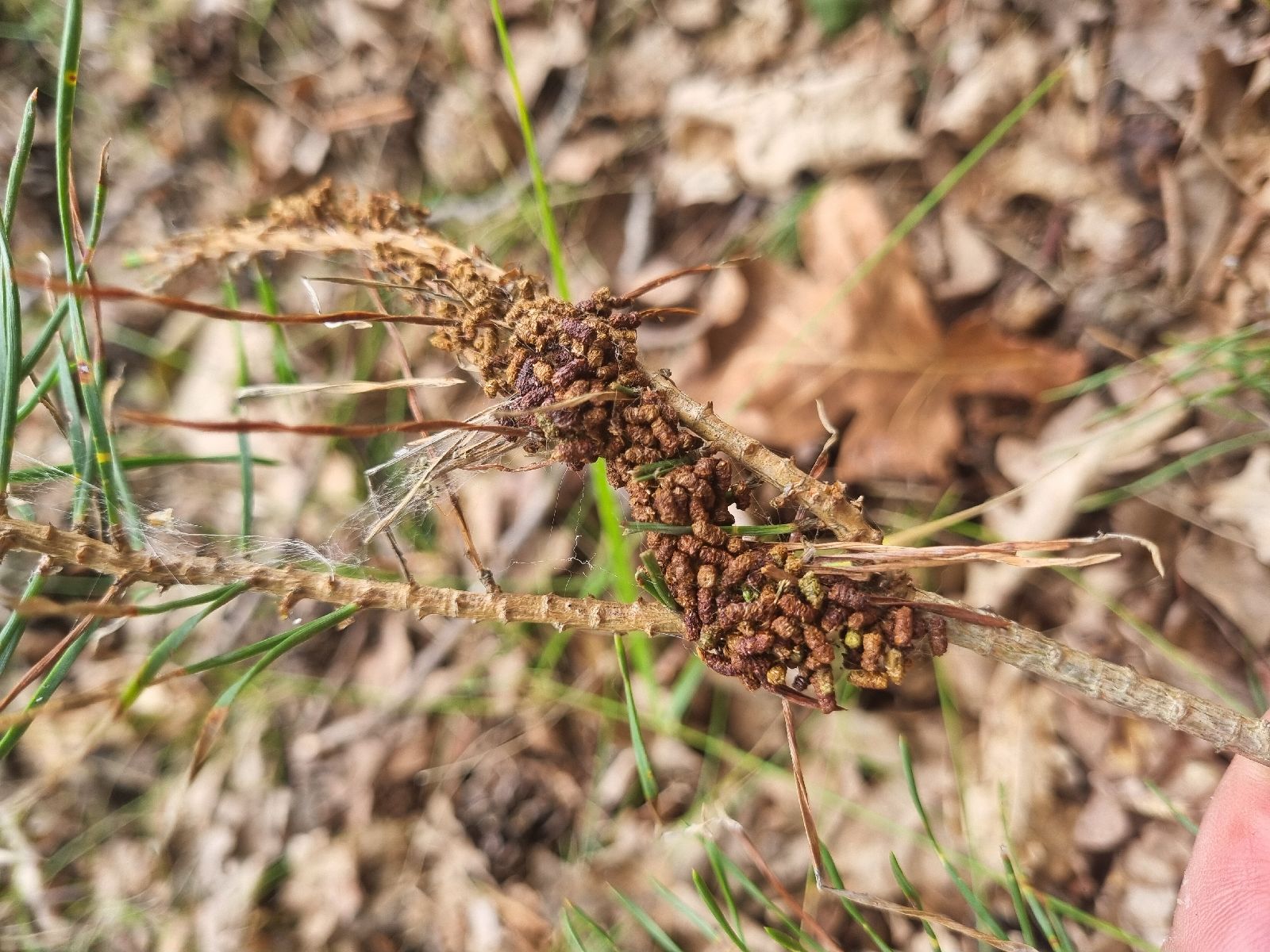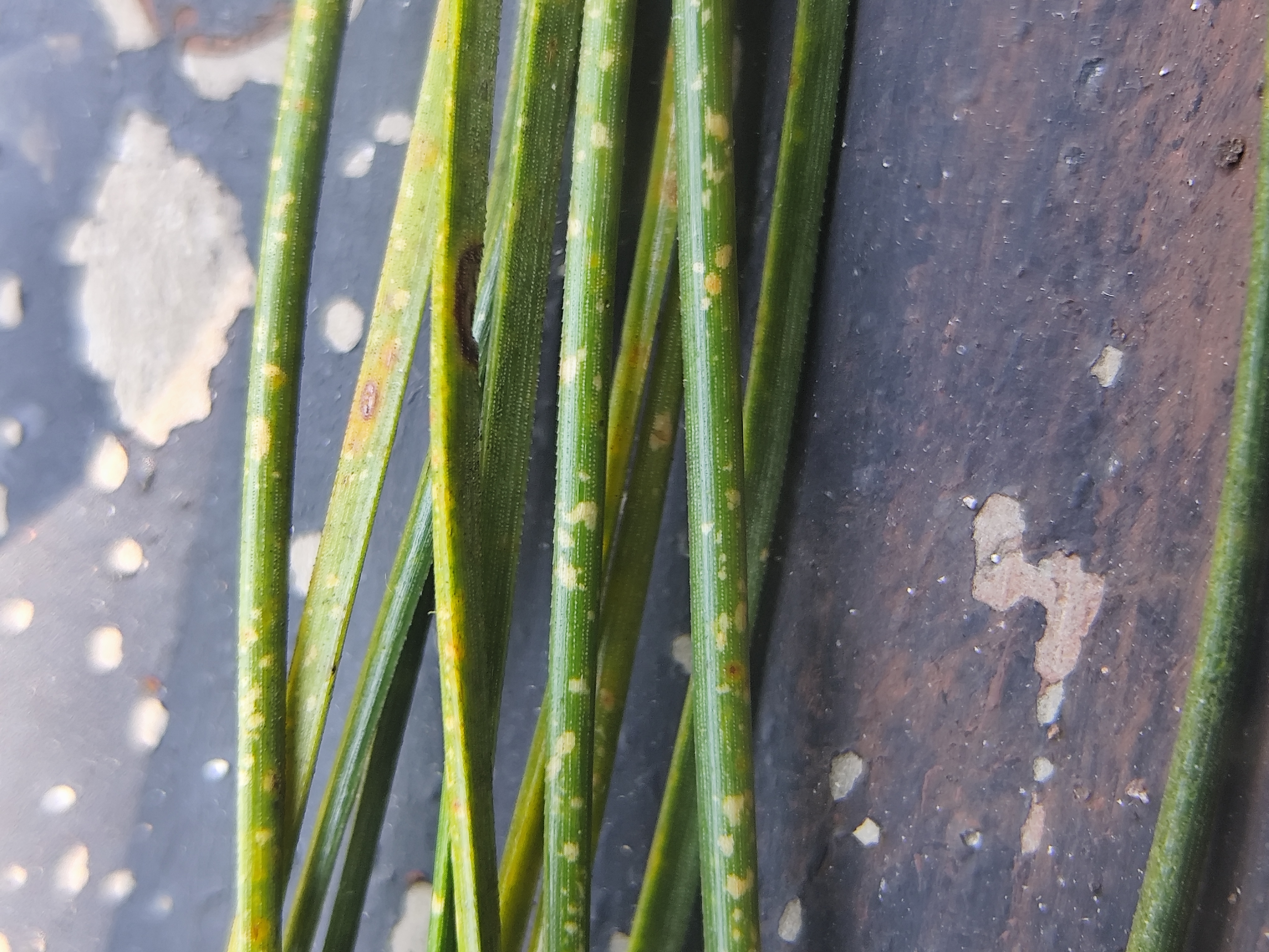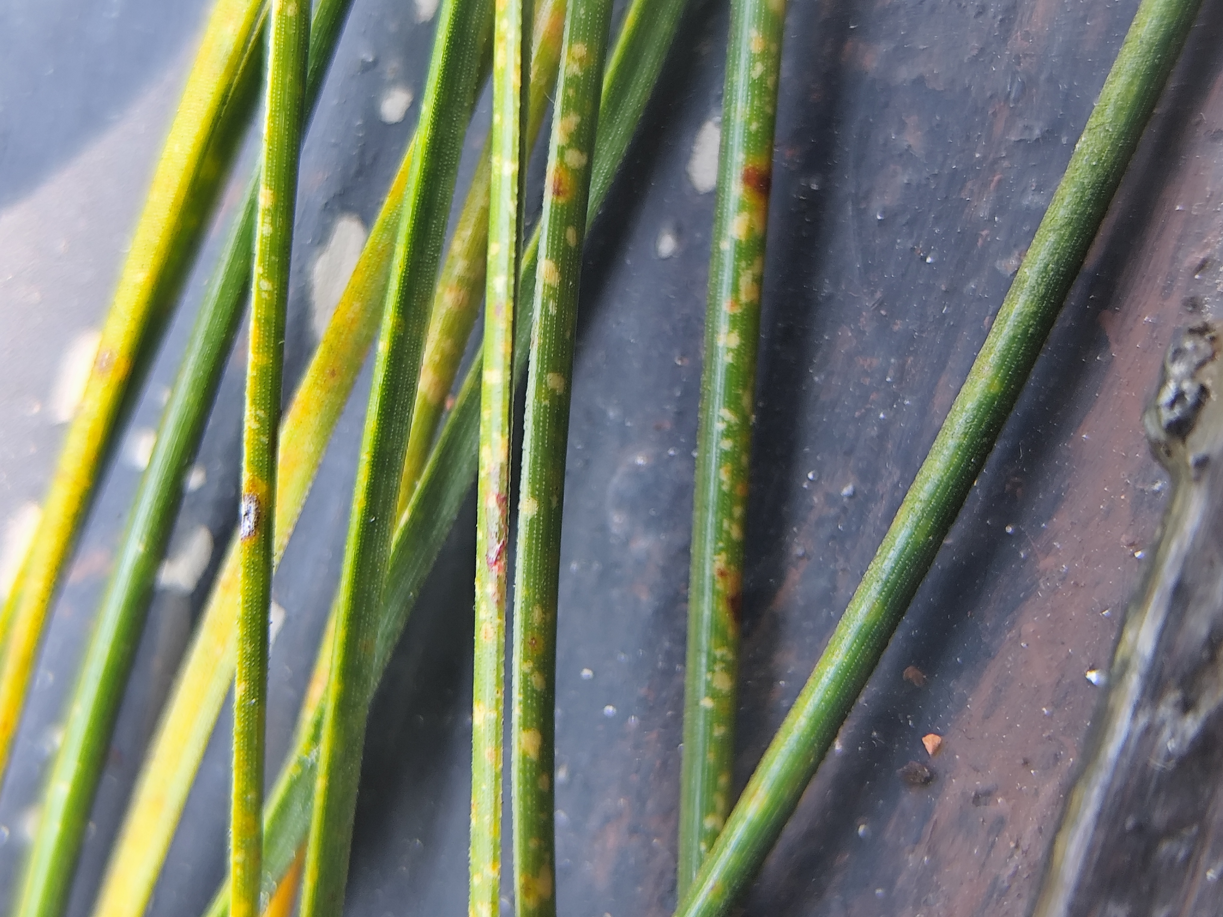Thank you for your question. Based on the photo, the pathogen appears to be Dothistroma septosporum. Needle infection occurs from early May to late September. The first symptoms are pale yellow to brown spots resembling damage caused by sucking insects. By November, the infected needles have turned brown, and by the end of December, brick-red spots or even transverse stripes may be visible on the brown needles. The asexual stage of the fungus is Mycosphaerella pini.