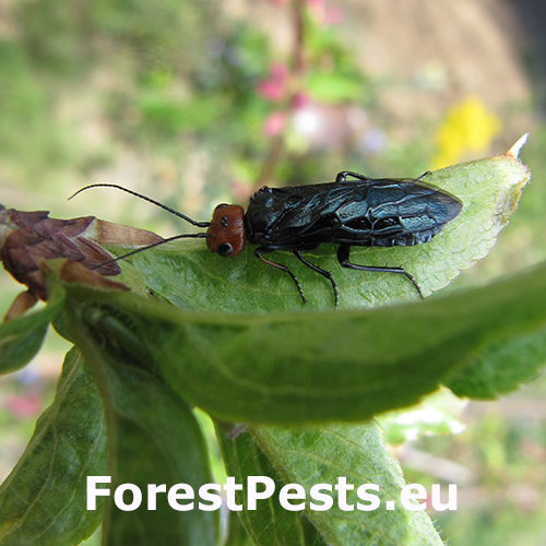 Acantholyda erythrocephala, commonly known as the red-headed pine sawfly, is a species of sawfly native to Europe that has also become established in North America. It primarily feeds on pine trees, including Pinus sylvestris, Pinus strobus, and Pinus resinosa. The larvae feed on old needles, constructing silk tubes that become filled with chewed needles, frass, and cast skins. In high densities, they can cause significant defoliation, weakening trees and making them susceptible to secondary pests and pathogens, such as bark beetles. The species has a univoltine life cycle, with larvae overwintering in the soil as prepupae. Adult emergence occurs in late spring, and females deposit eggs in rows along older pine needles. The species is widely distributed across Europe, with reports from various forested regions, particularly where host trees are abundant.