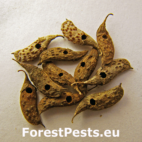 Affected seeds exhibit internal cavities caused by larval feeding. Distinct exit holes on the seeds. Pods may appear normal externally but are light due to hollowed seeds. Severe infestations result in reduced seed production and viability and visible frass within pods, distinguishing it from similar species.