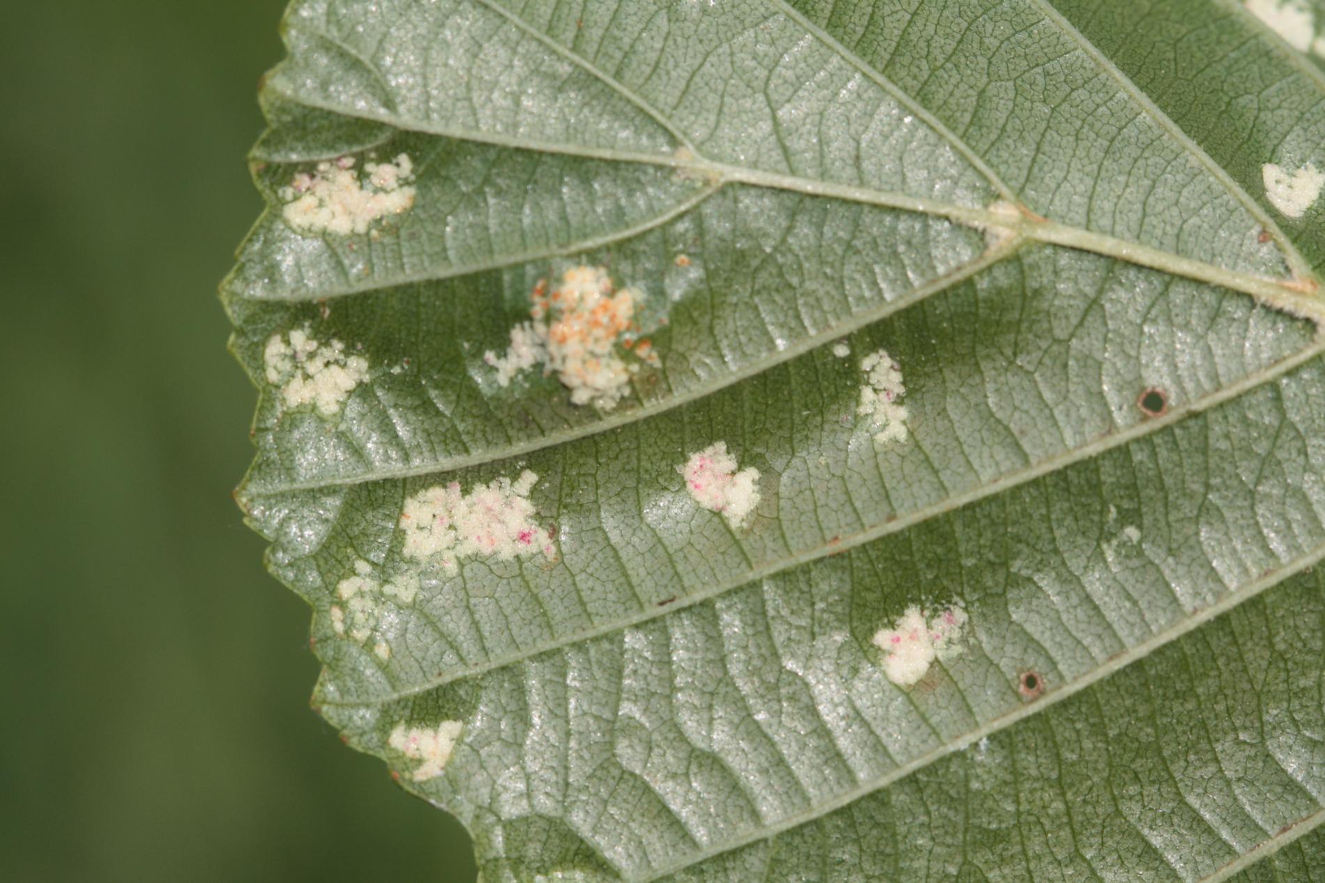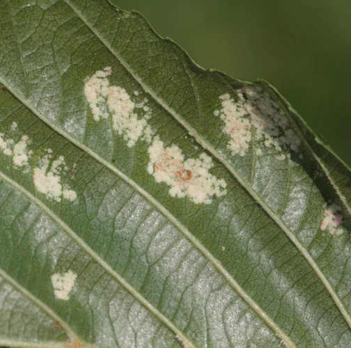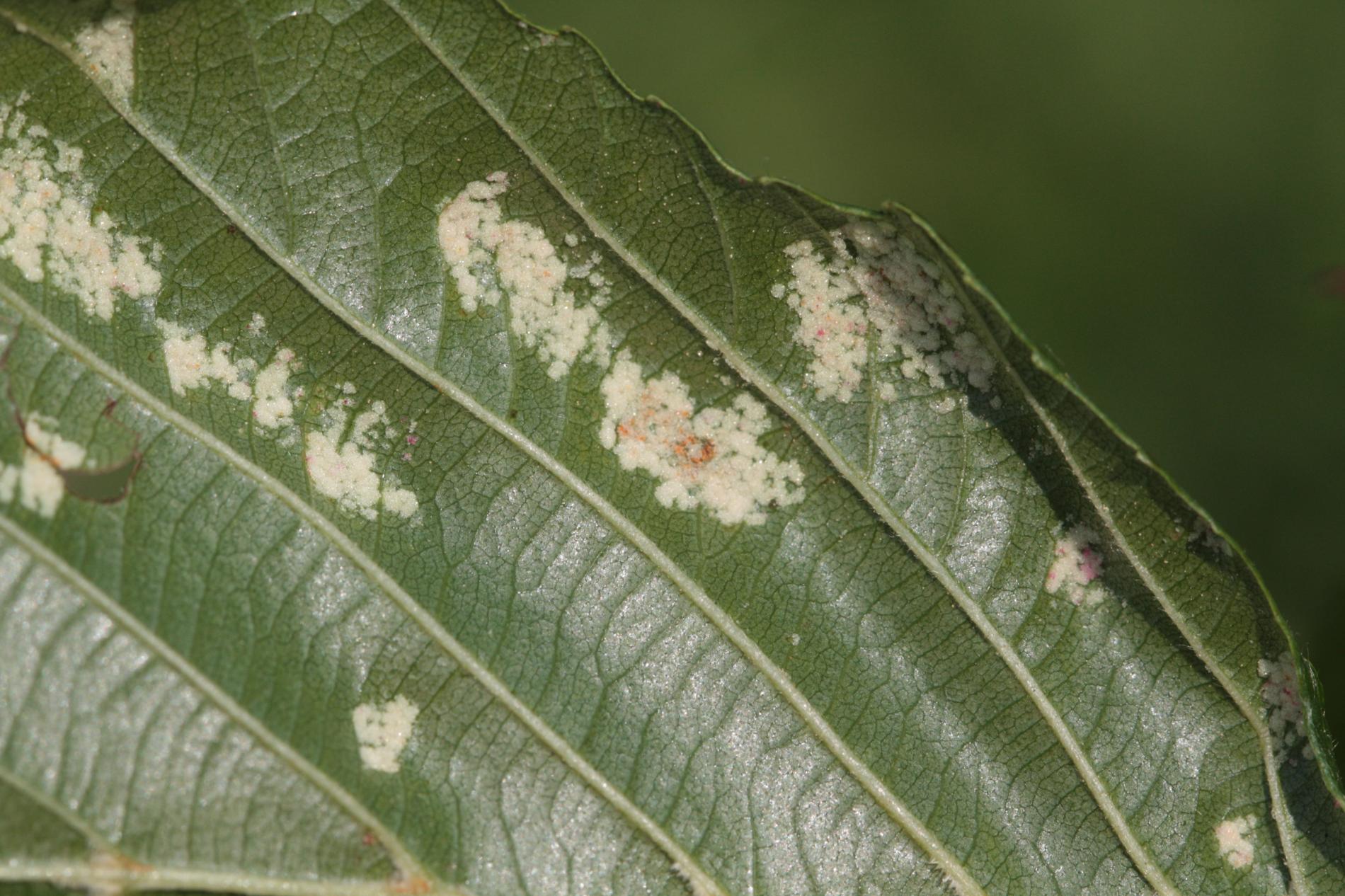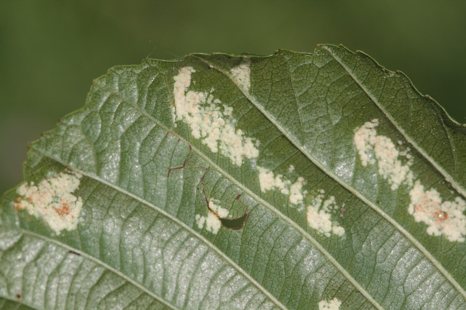 Creamy-whitte coatings on the underside of the leaf.