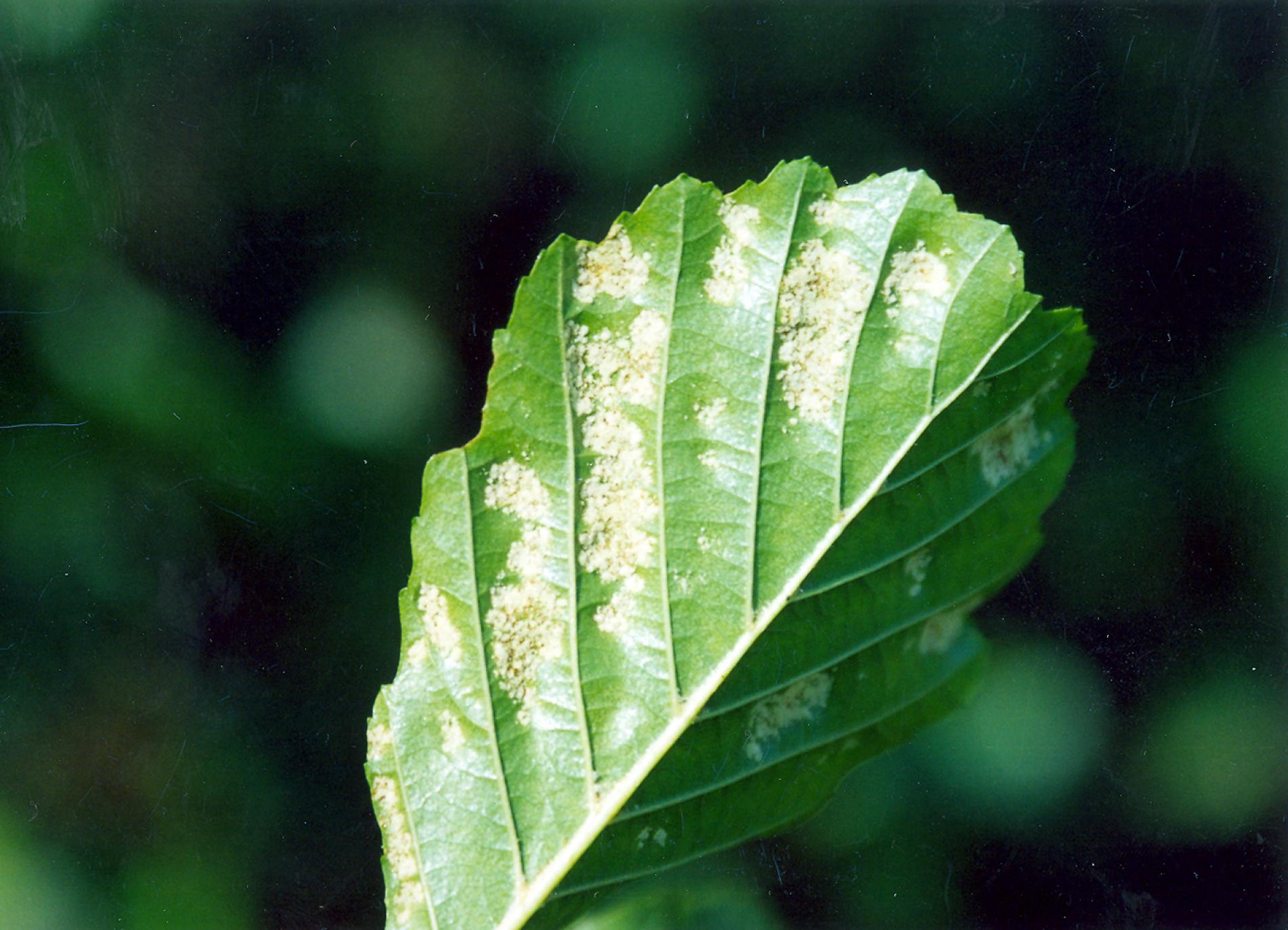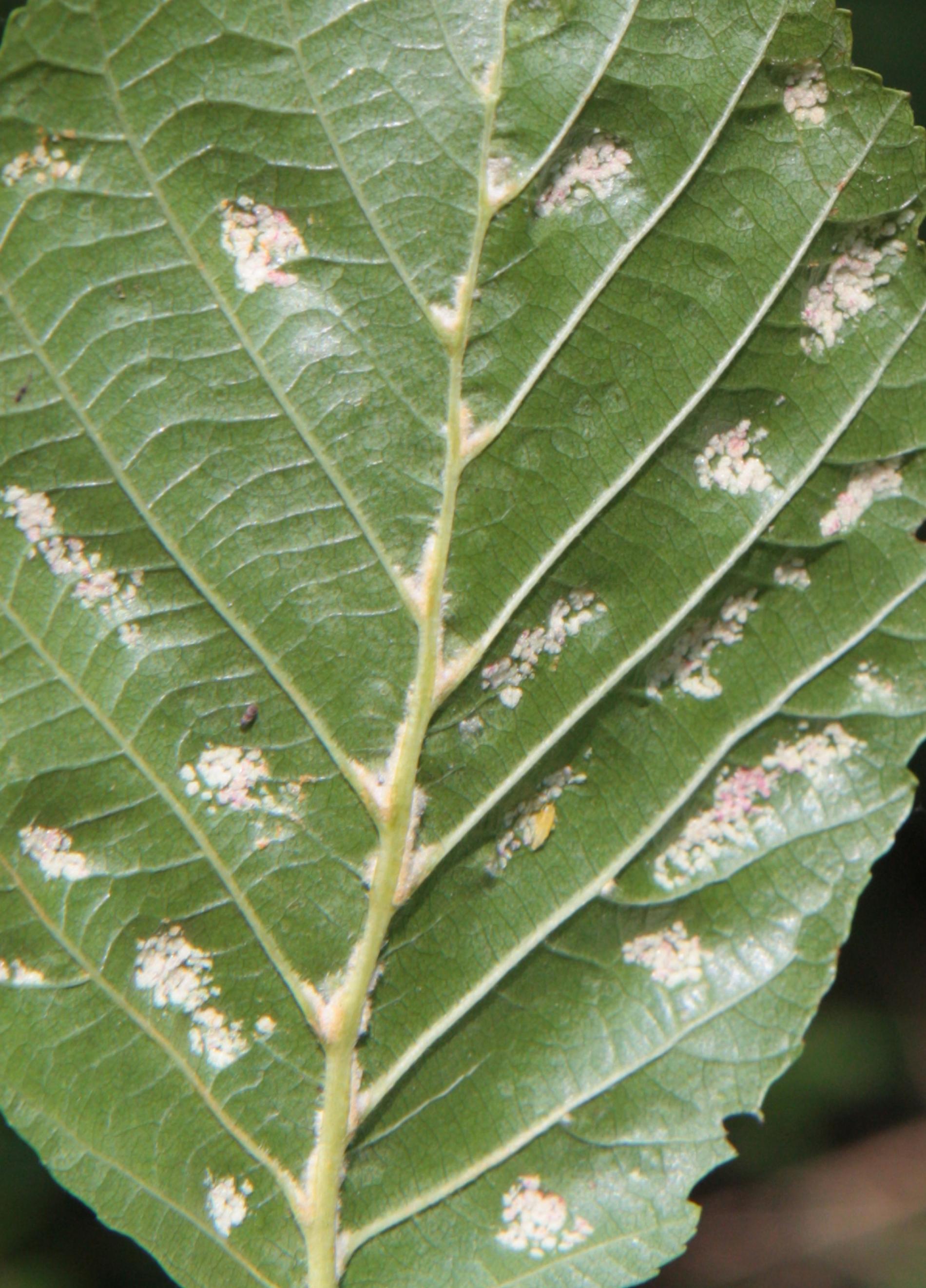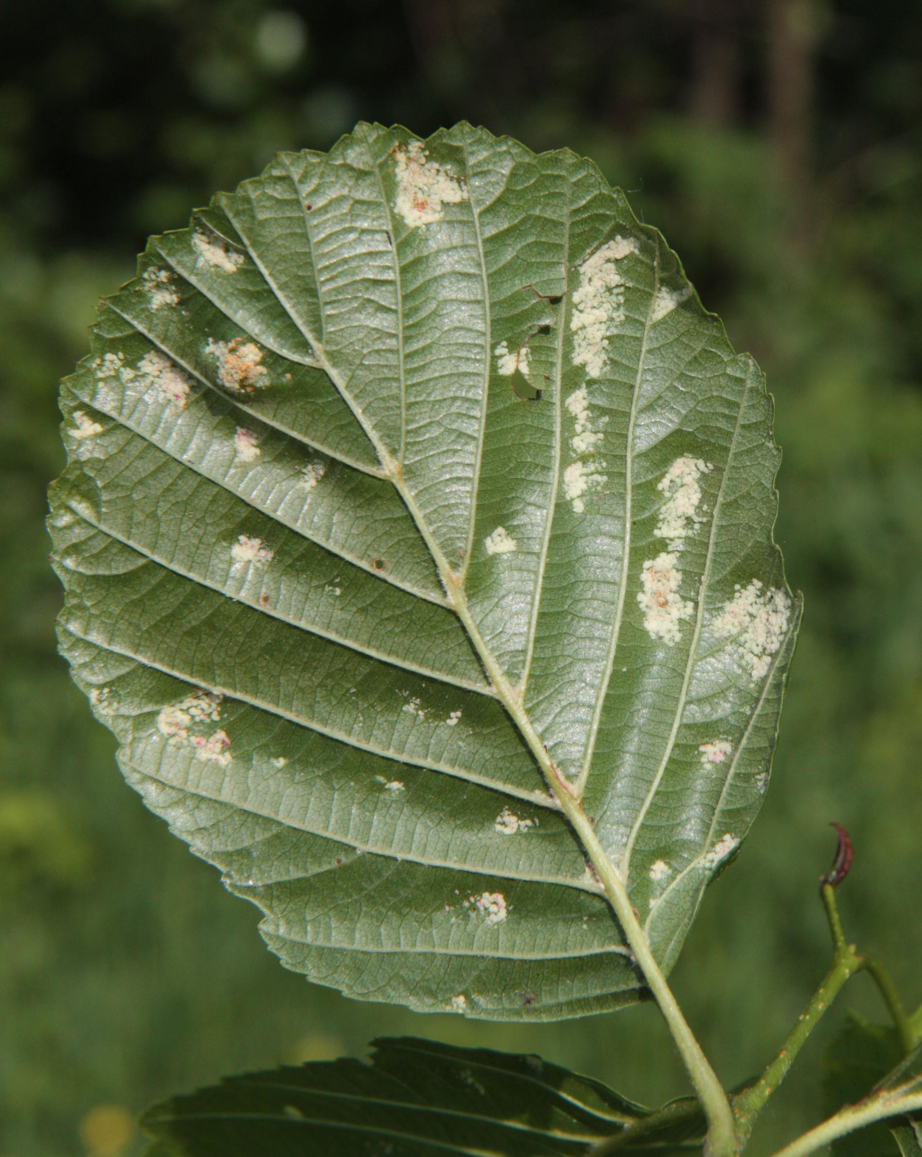 Creamy-whitte coatings on the underside of the leaf.