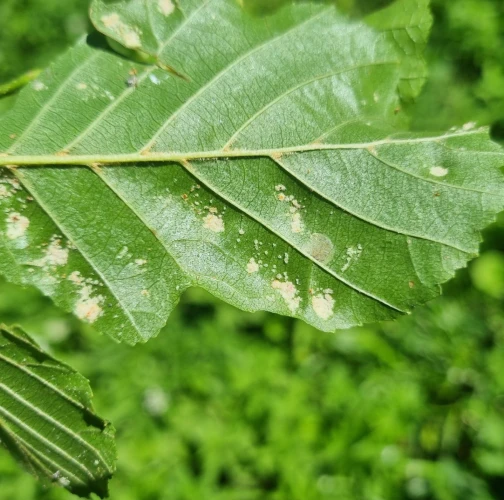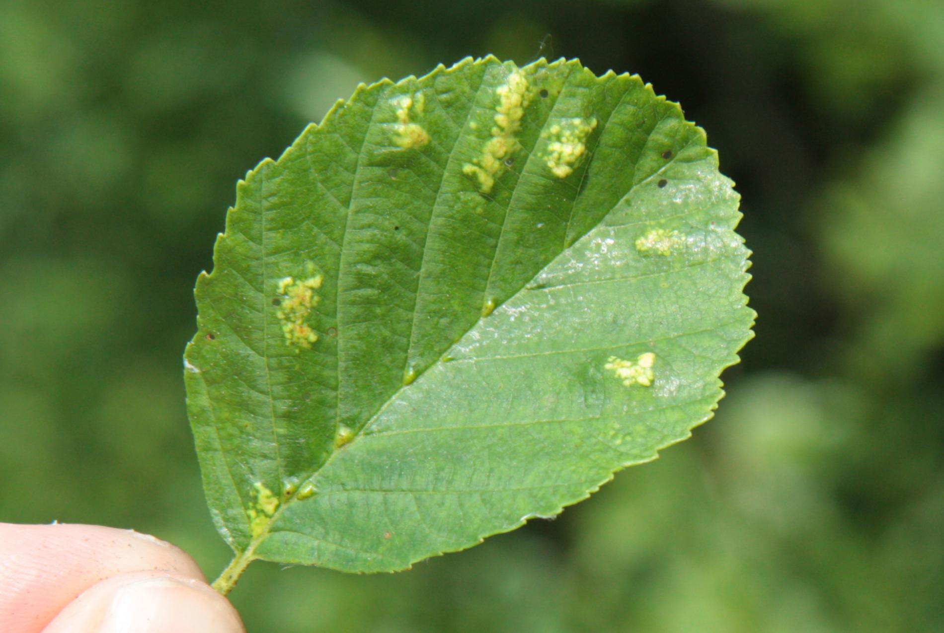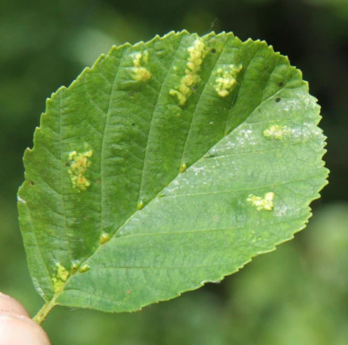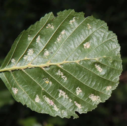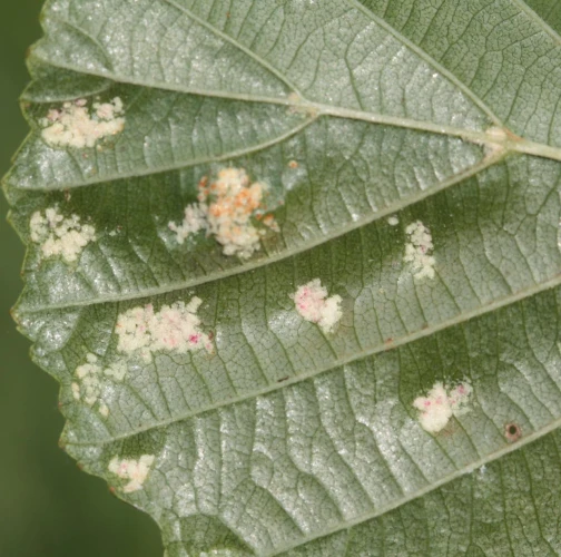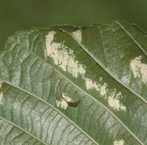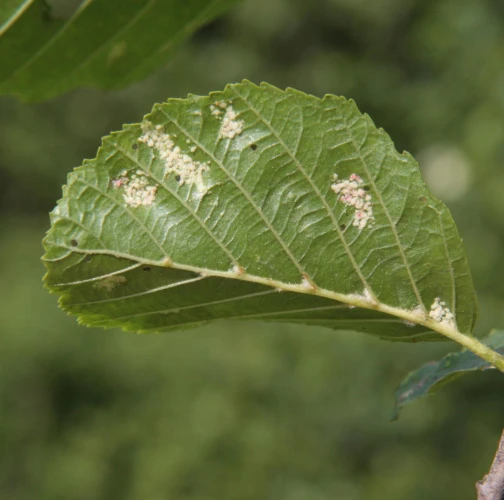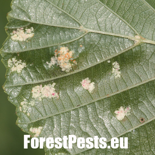 This mite causes the formation of flat, felt-coated areas on a host leaves. These are located in the intercostal space at the bottom of the leaf. On the upper side of the leaf, the damage is seen as lightening and yellowing of the surface.