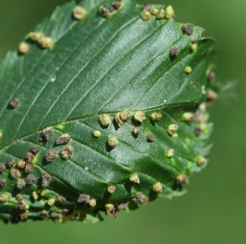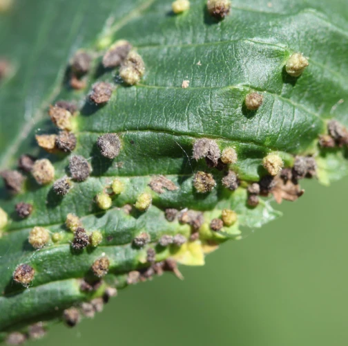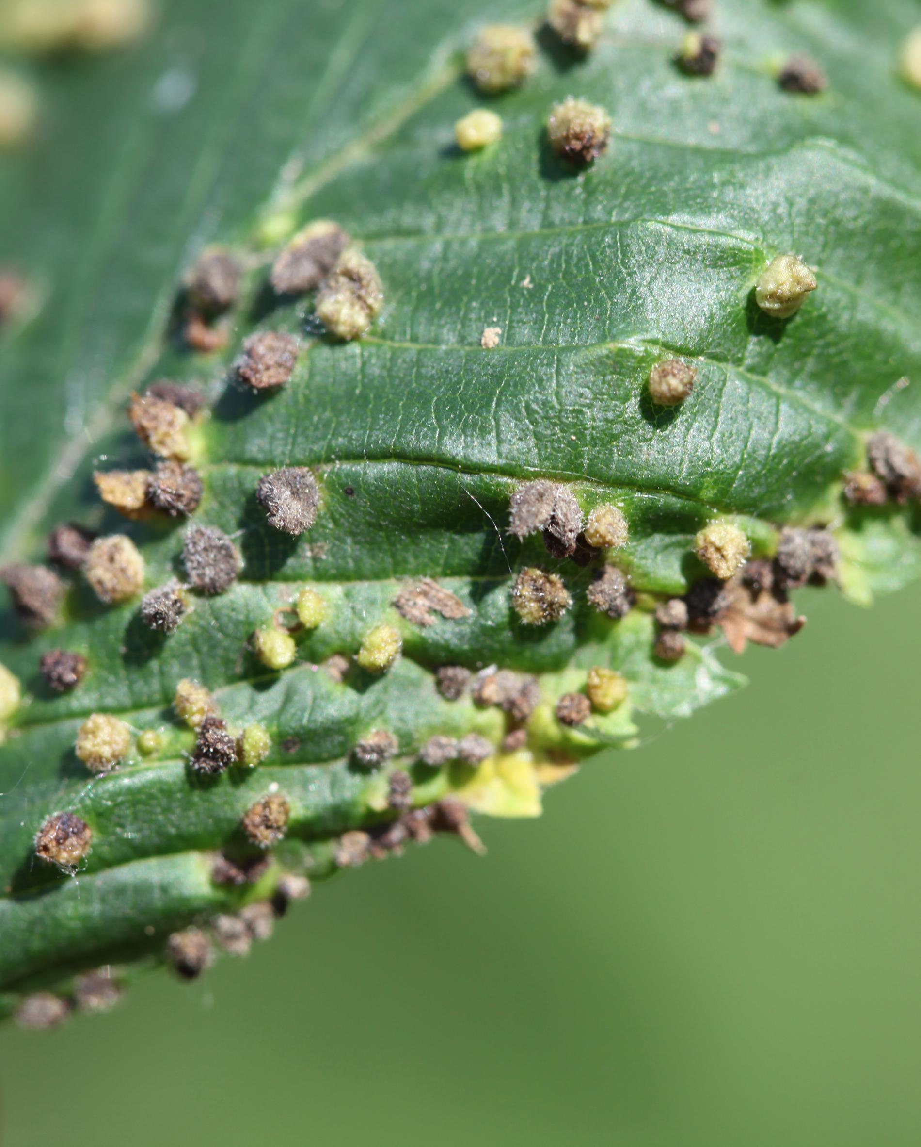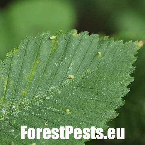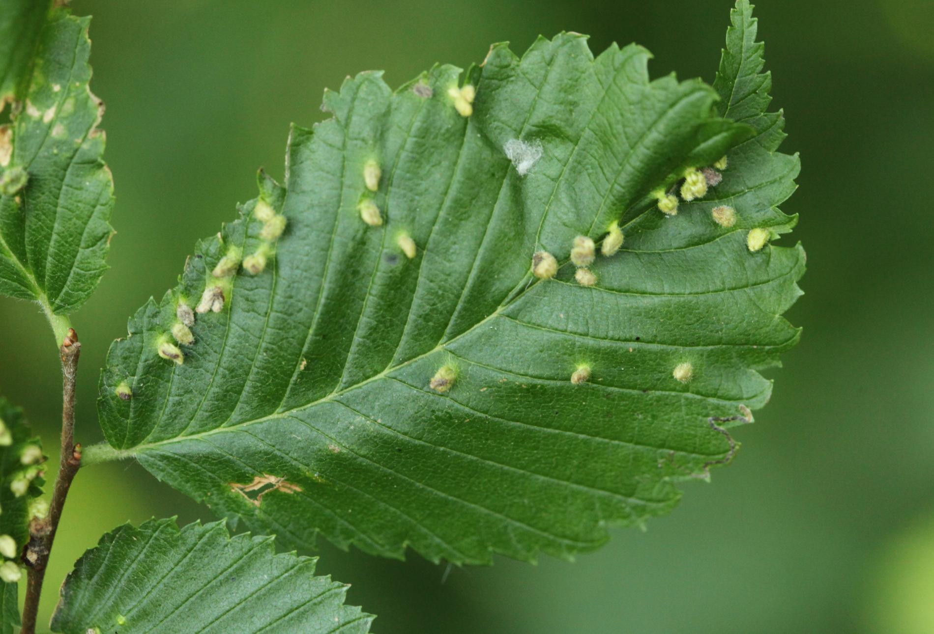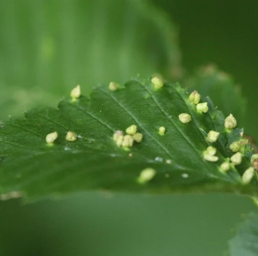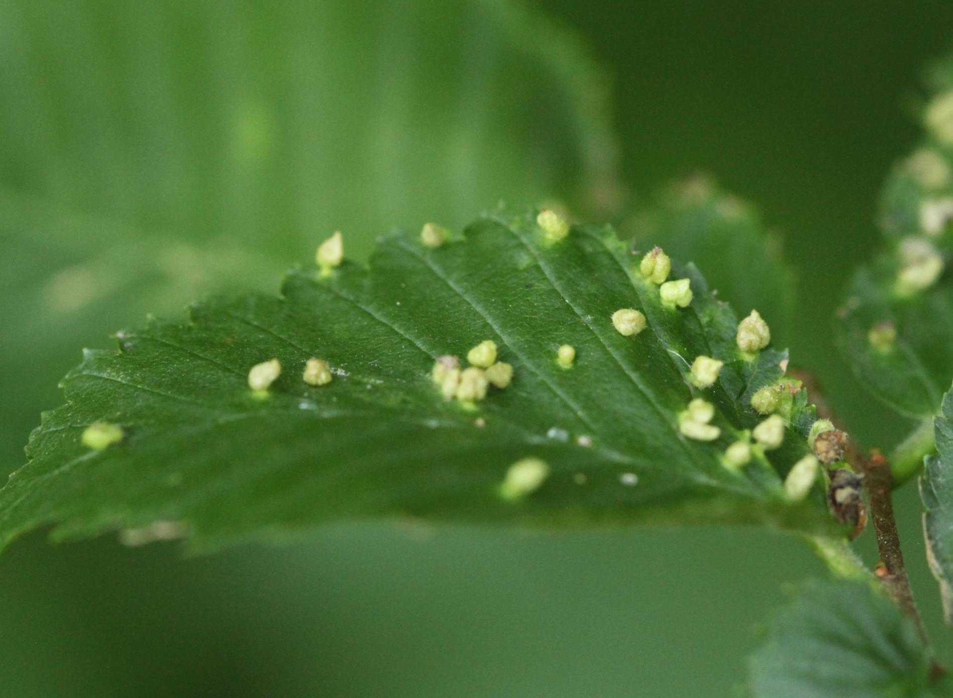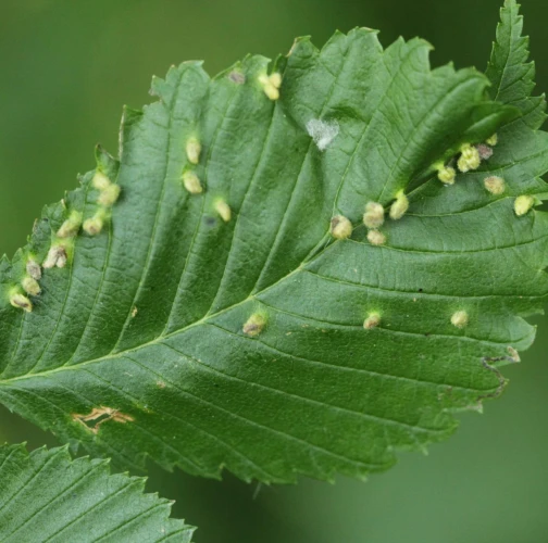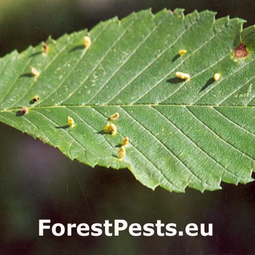 On the top side of leaves are found groups of tiny up to 1.5 - 2 mm long galls. They are pale green or yellow, narrowed at the base. They are caused by sucking of the mite. They occur frequently in large number. Galls are randomly placed on upper side of leaf. Large number of galls may result in leaf deformation. The mite is very small and cannot be seen with the naked eye. Aceria ulmi causes similar deformations.