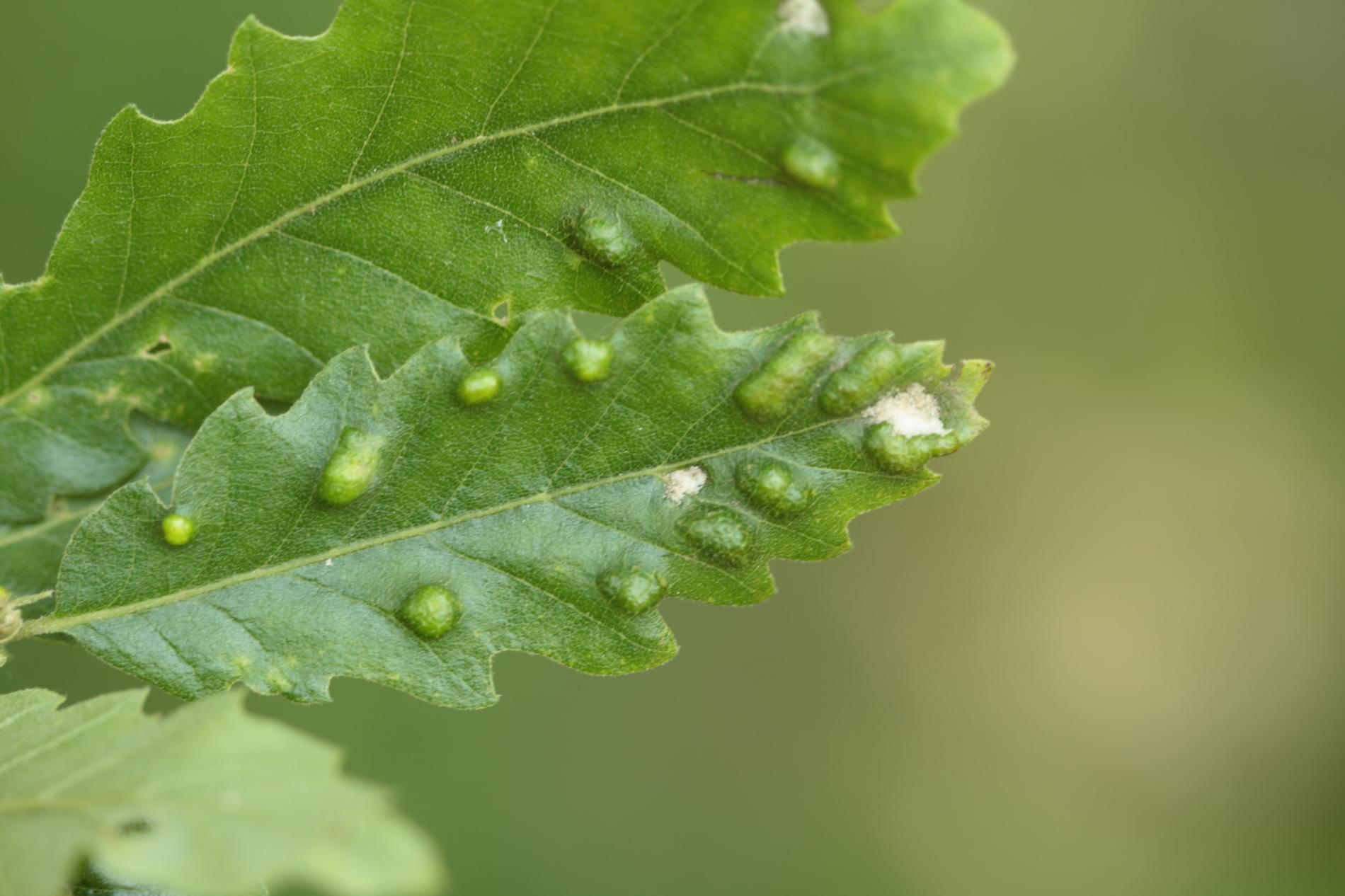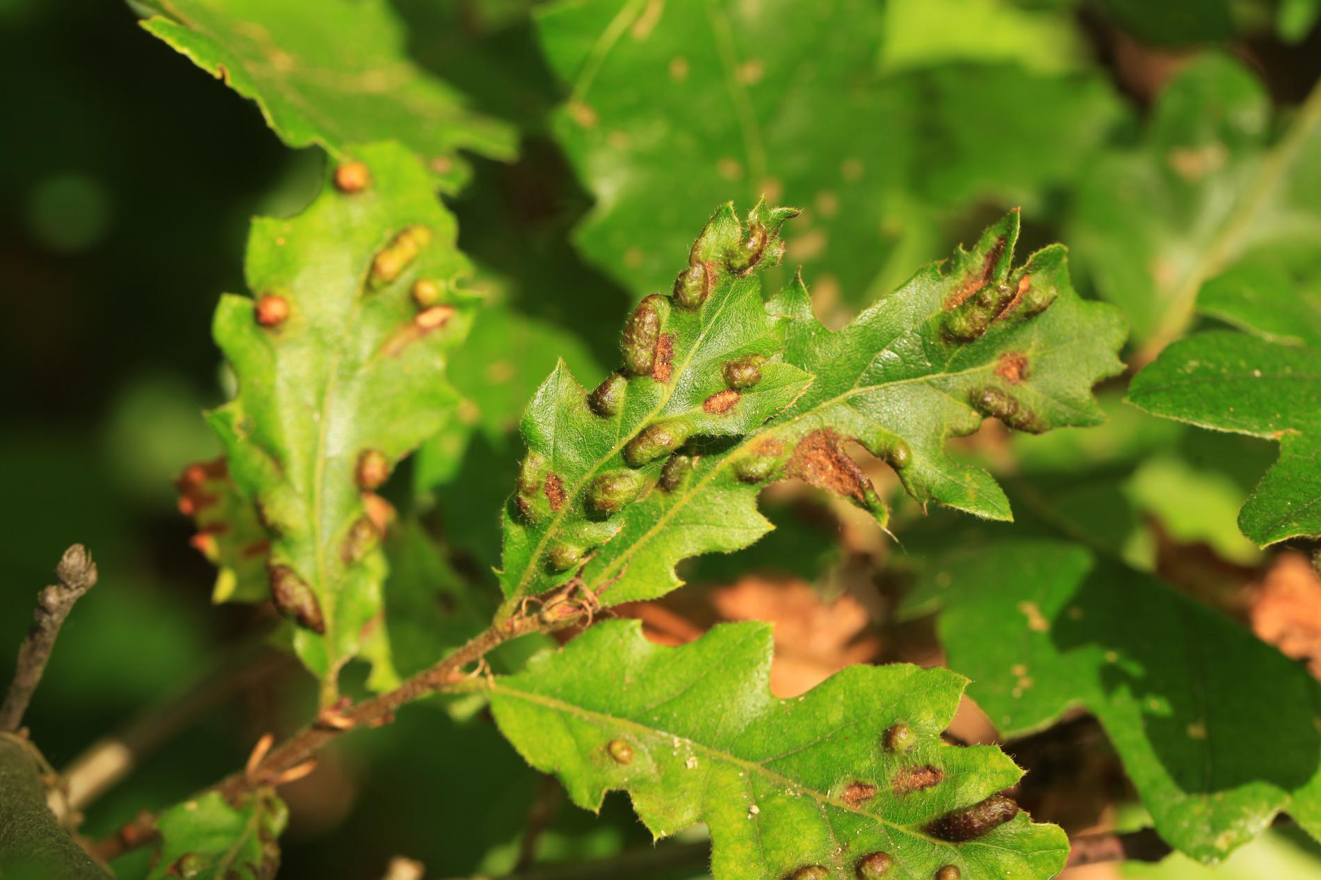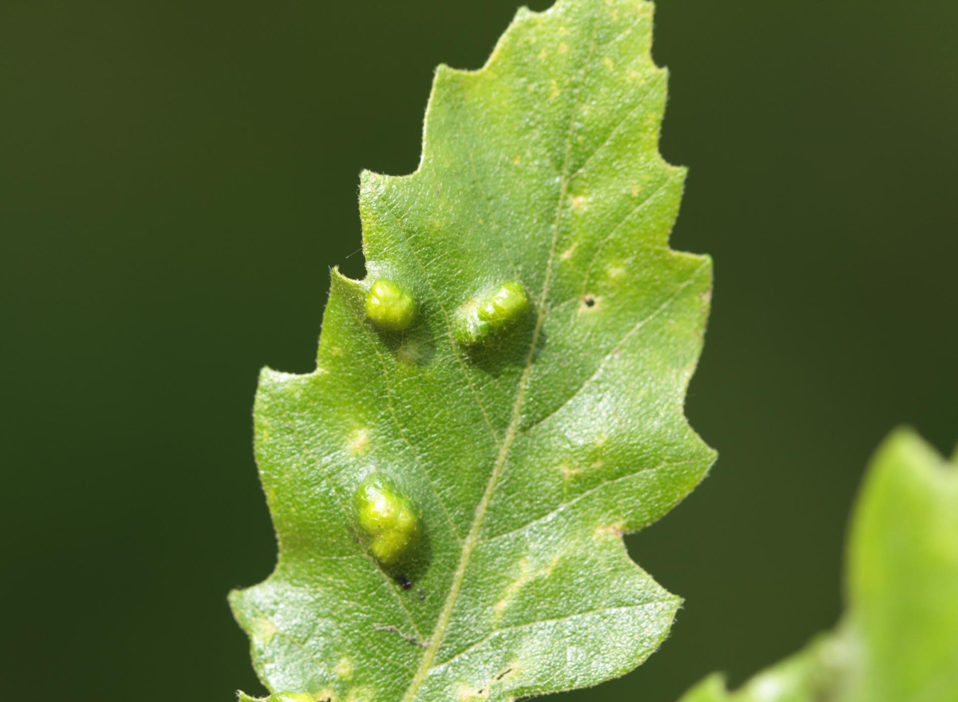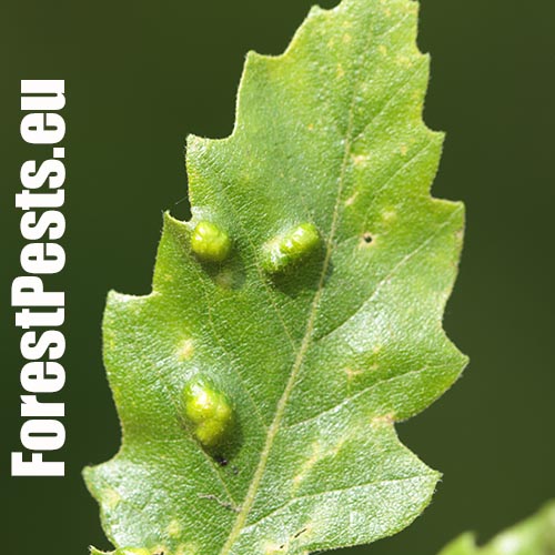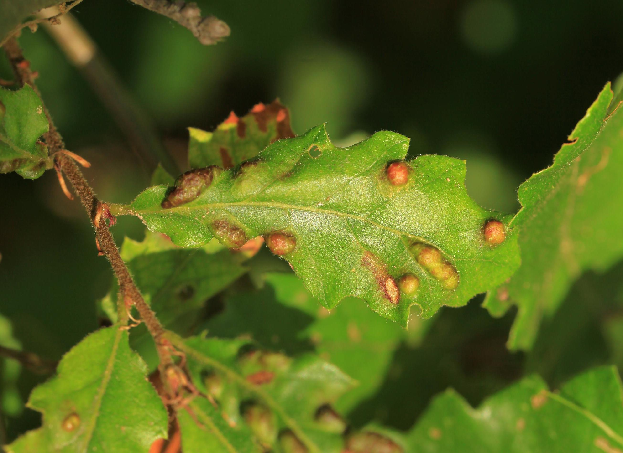 Blister-like bumps on the upper leaf surface of irregular shape and size. Corresponding underside of bulges is covered by an erineum. Hairs can have different shape. Creamy-white to red when young, later becoming darker, even brown. Its impact on health status of the tree is only negligible, they can reduce the aesthetic value of the tree.