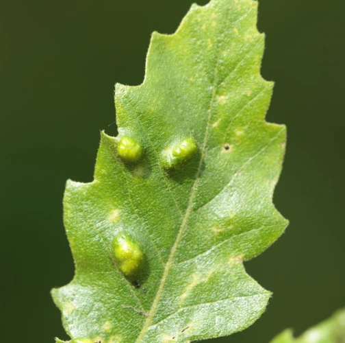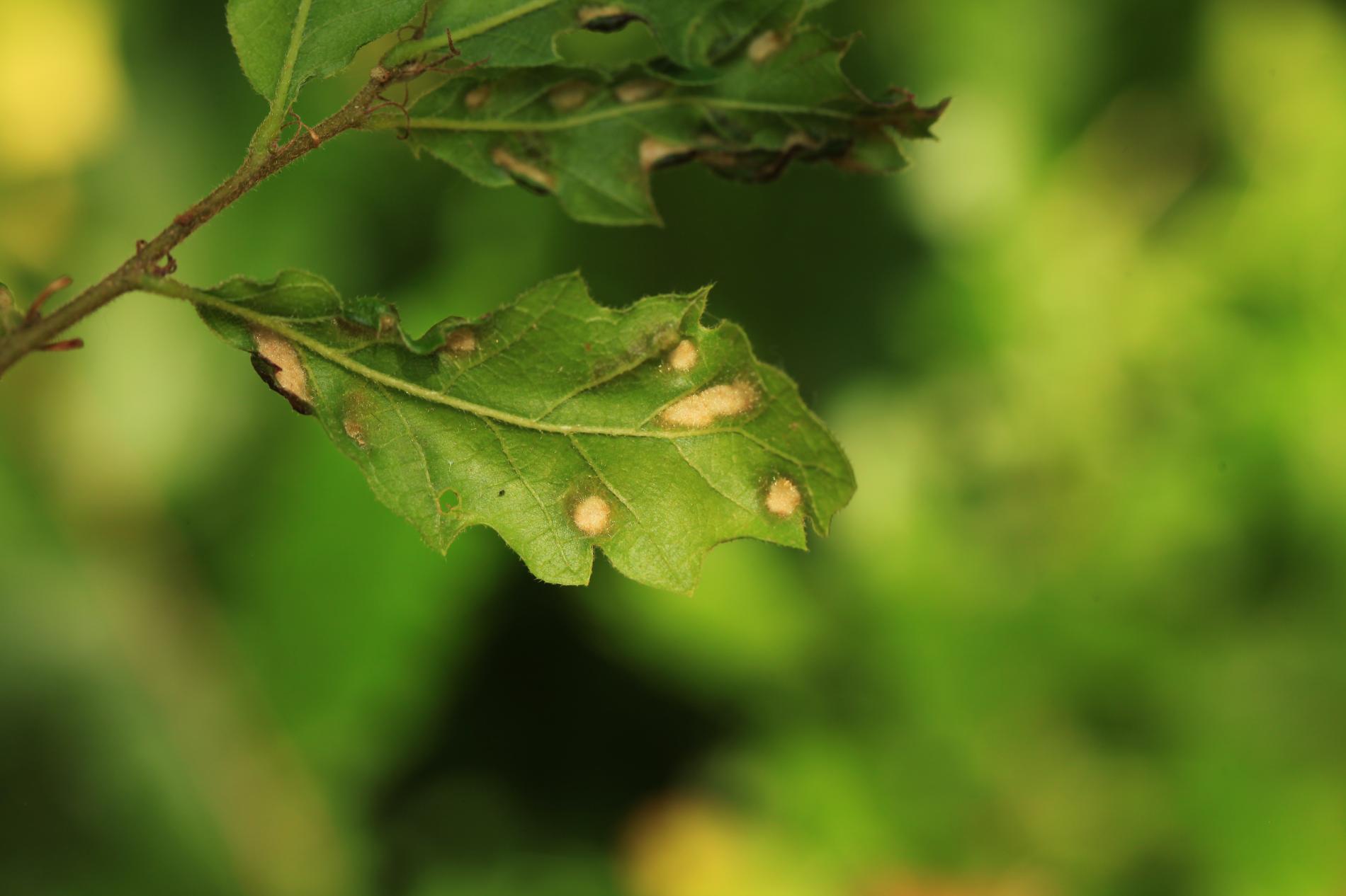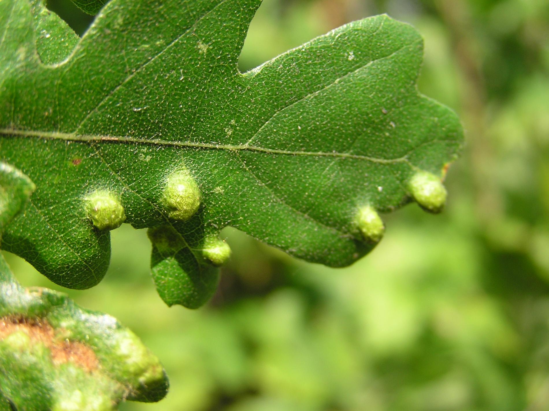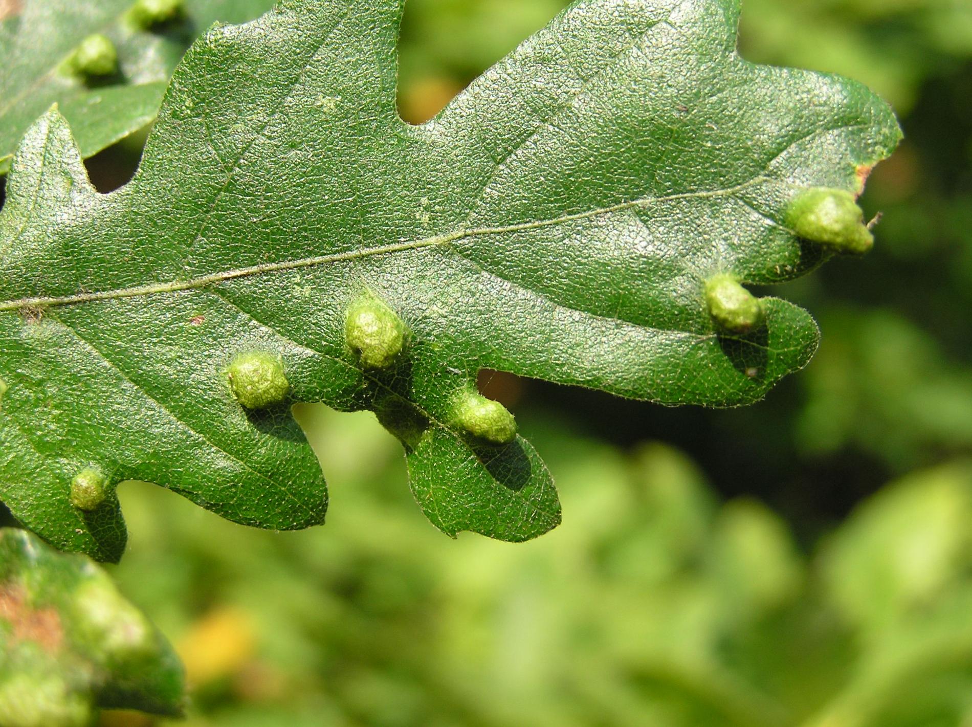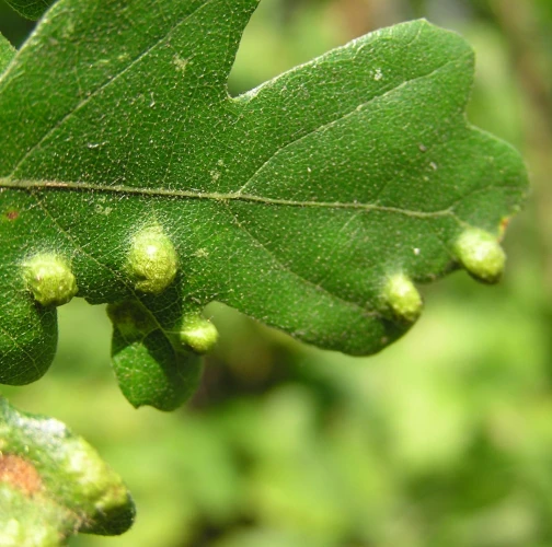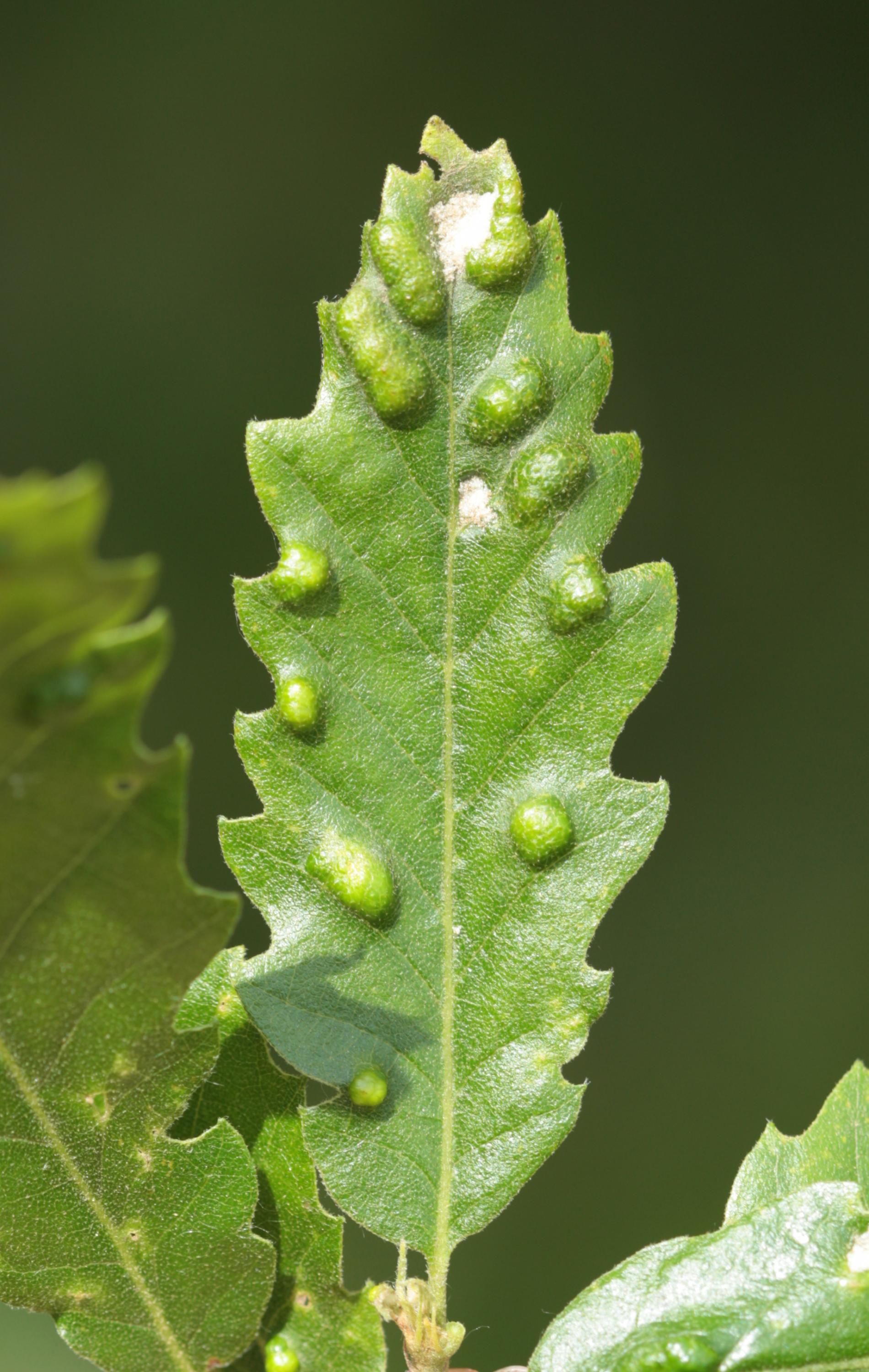 Blister-like bumps on the upper leaf surface of irregular shape and size. Corresponding underside of bulges is covered by an erineum. Hairs can have different shape. Creamy-white to red when young, later becoming darker, even brown. Its impact on health status of the tree is only negligible, they can reduce the aesthetic value of the tree.