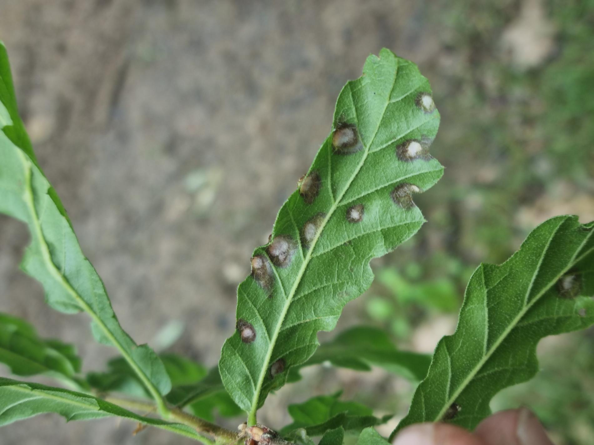 Blister-like bumps on the upper leaf surface of irregular shape and size. Corresponding underside of bulges is covered by an erineum.