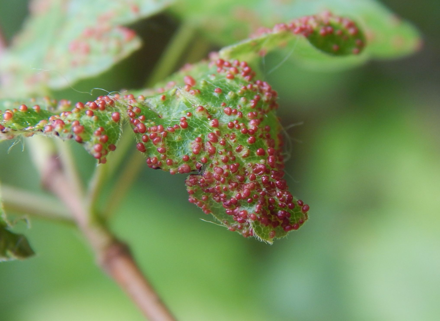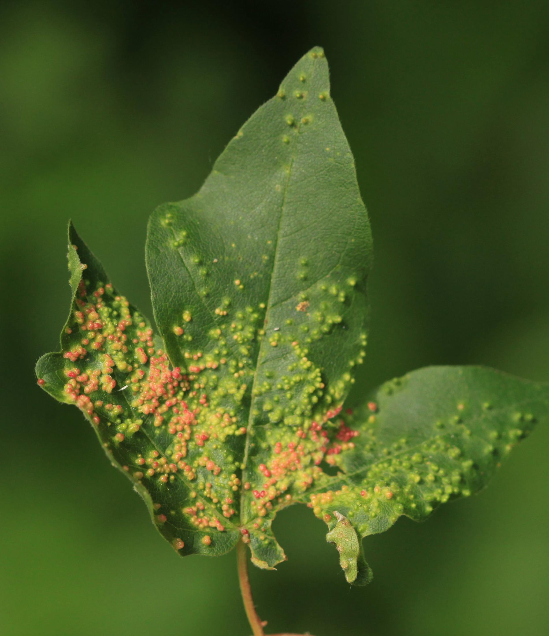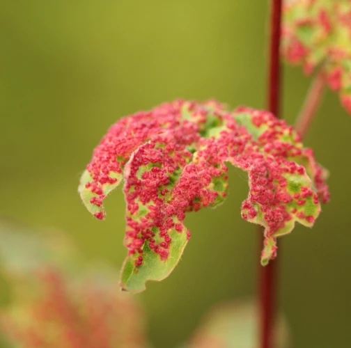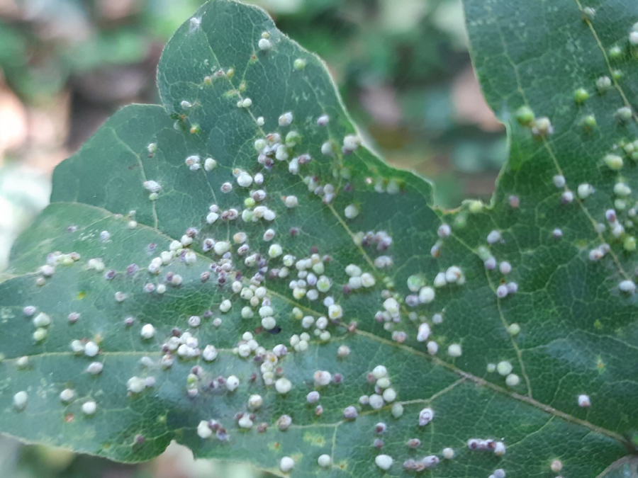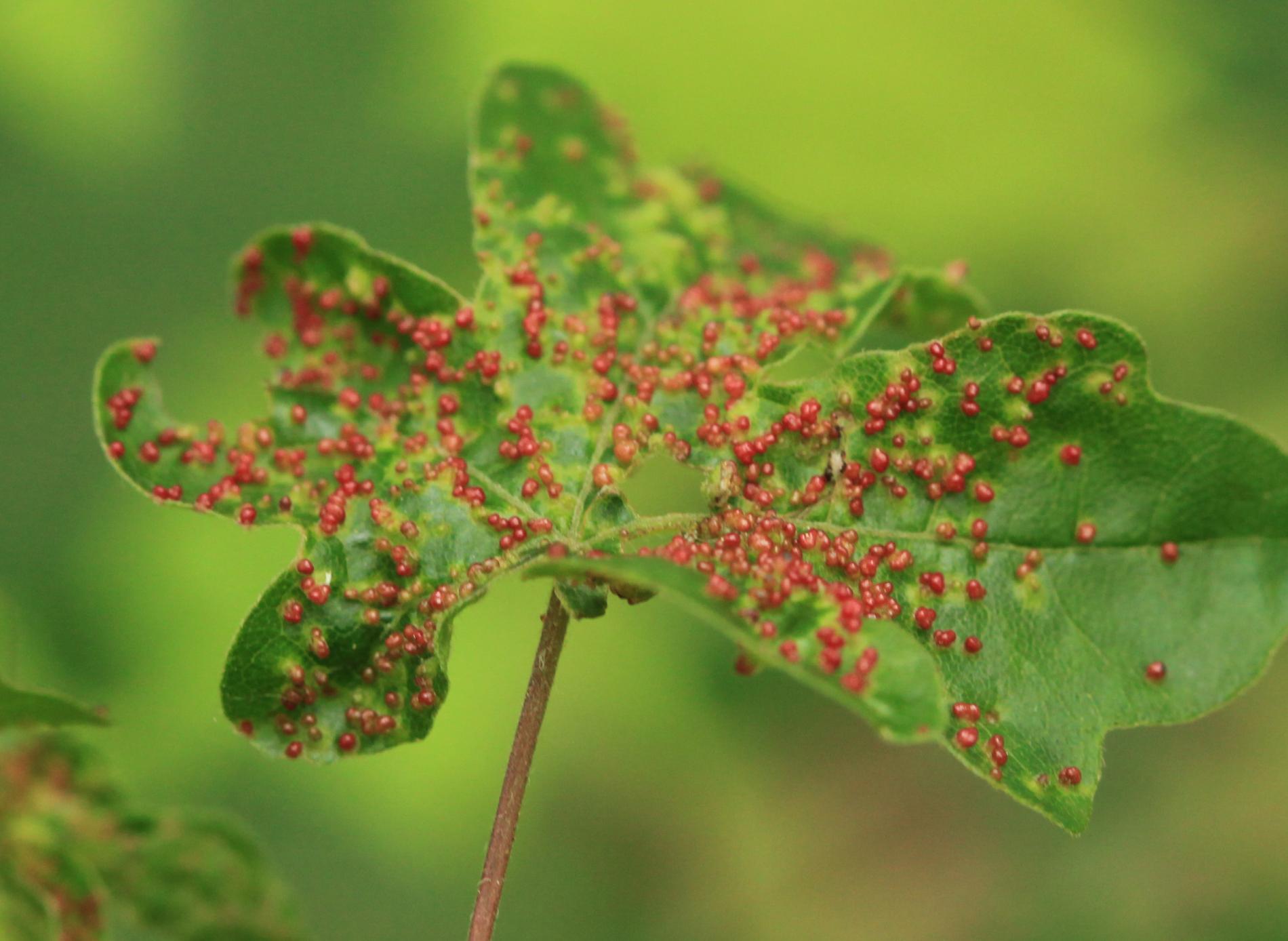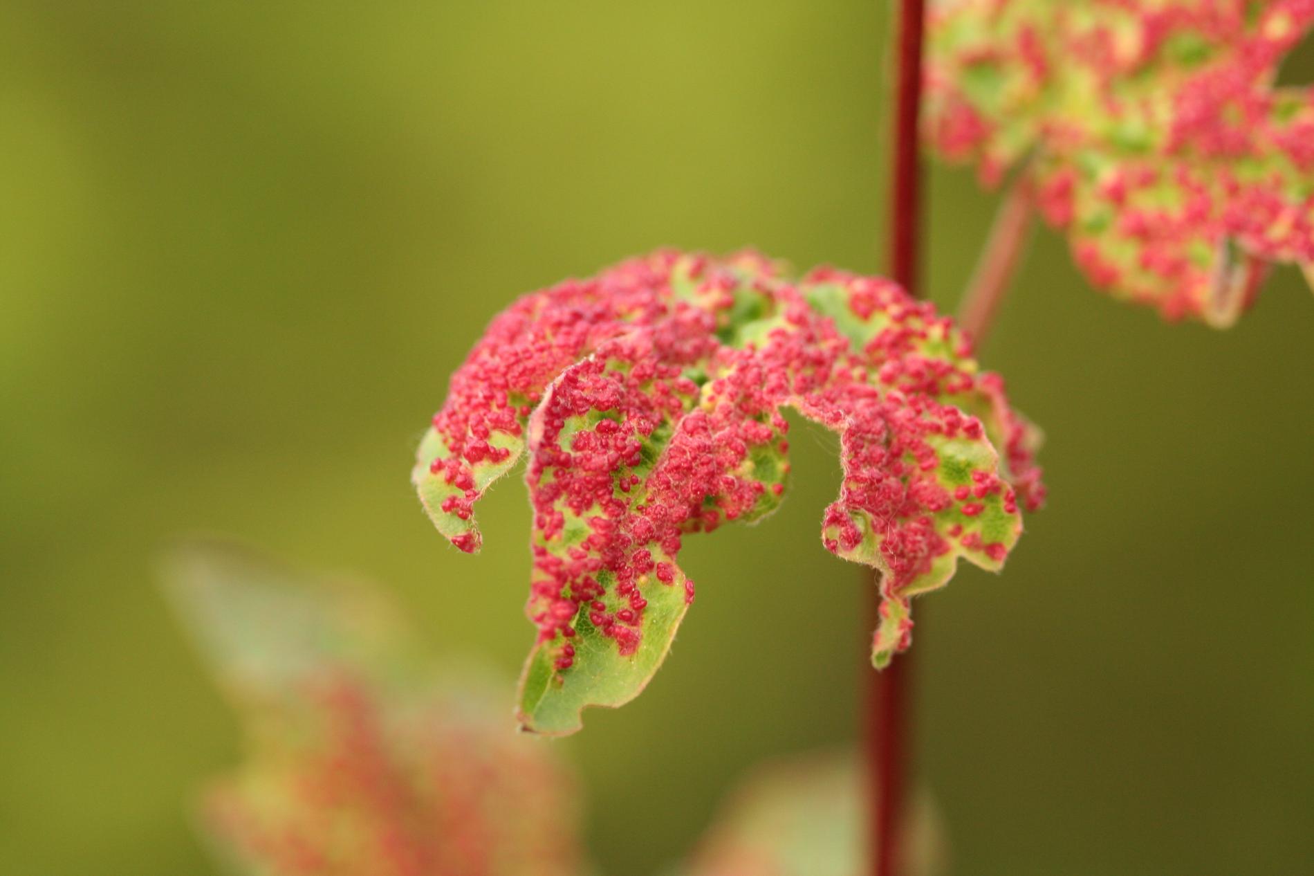 Galls, only 1-2 mm in size, and often in large numbers on the upper side of the leaf. Yellow-green, more often red.
