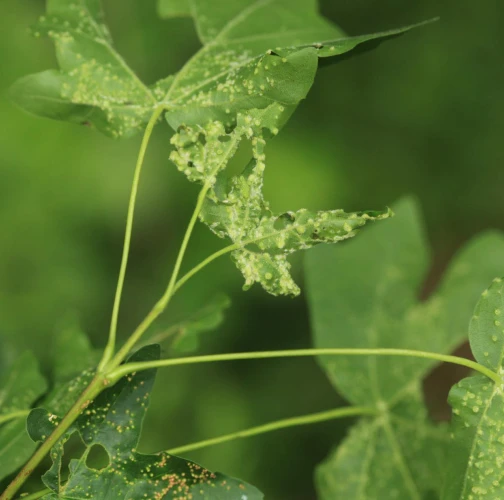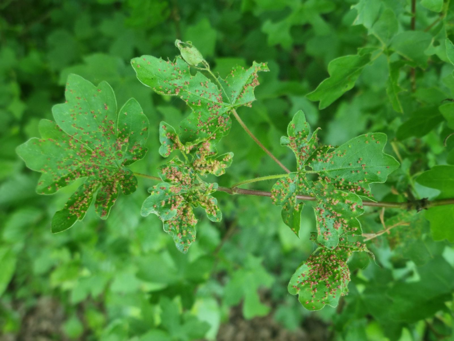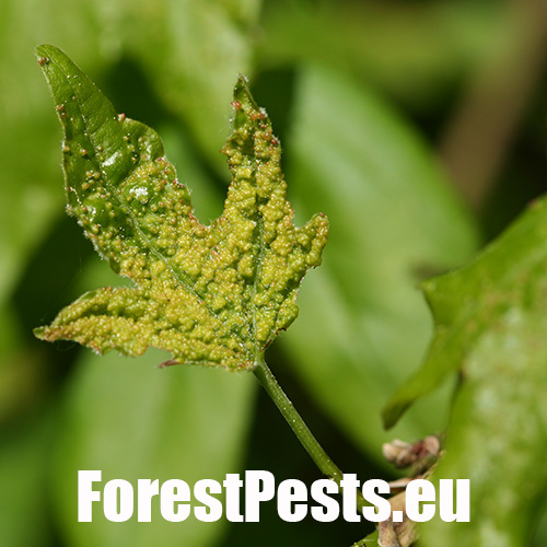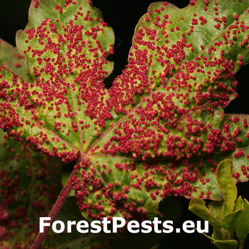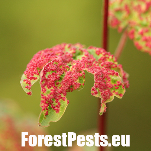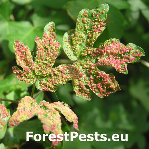 It is also known under the name Aceria aceriscampestris. A tiny mite, about 0.15-0.2 mm in size. It has several generations during the year. In the spring, the females begin to suck on the leaves and thus initiate the formation of small galls in which the mites reproduce and live. The galls are small, only 1-2 mm in size and are often in large numbers on the upper side of the leaf. They can cover almost entire leave blade. Yellow-green, more often red. The mites overwinter hide in the bark crevices or near the buds. It lives almost exclusively on the field maple (Acer campestre). On this maple species also other similar mites can live, and it can be confused with them. Gall mite Aceria myriadeum reduces the aesthetic value of trees and, in extreme cases, the vitality of especially young maples.