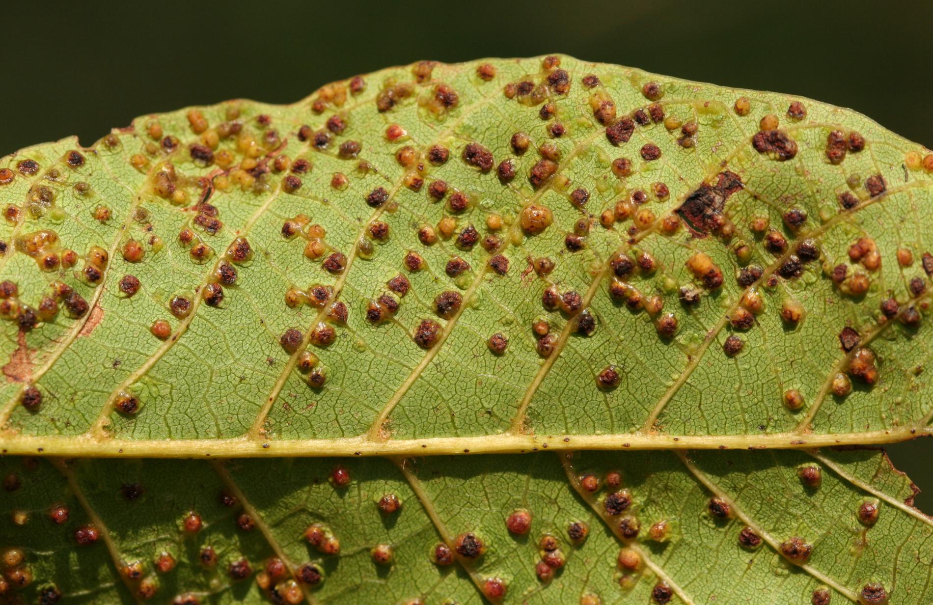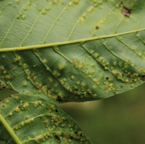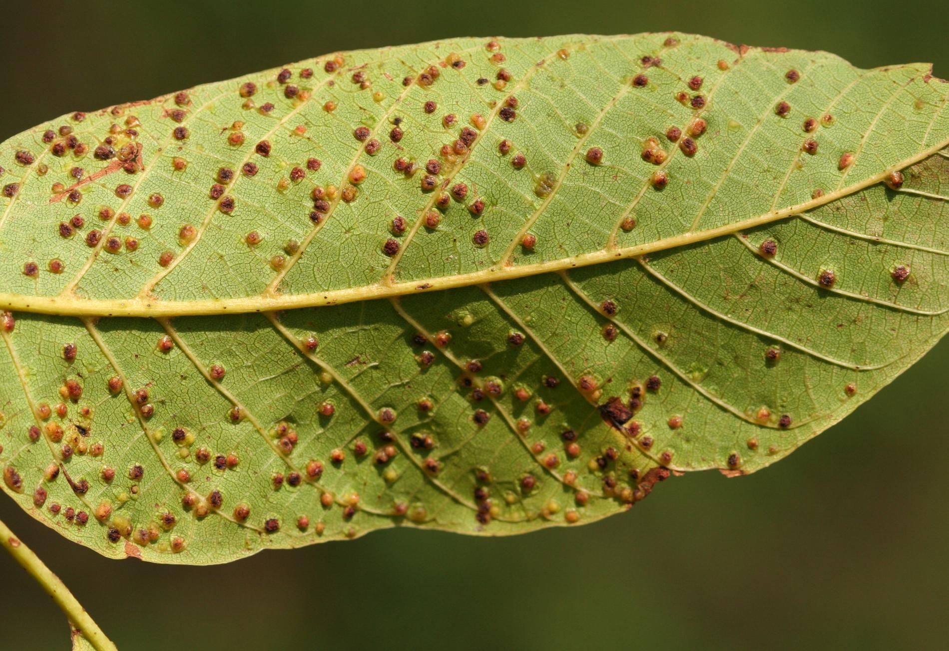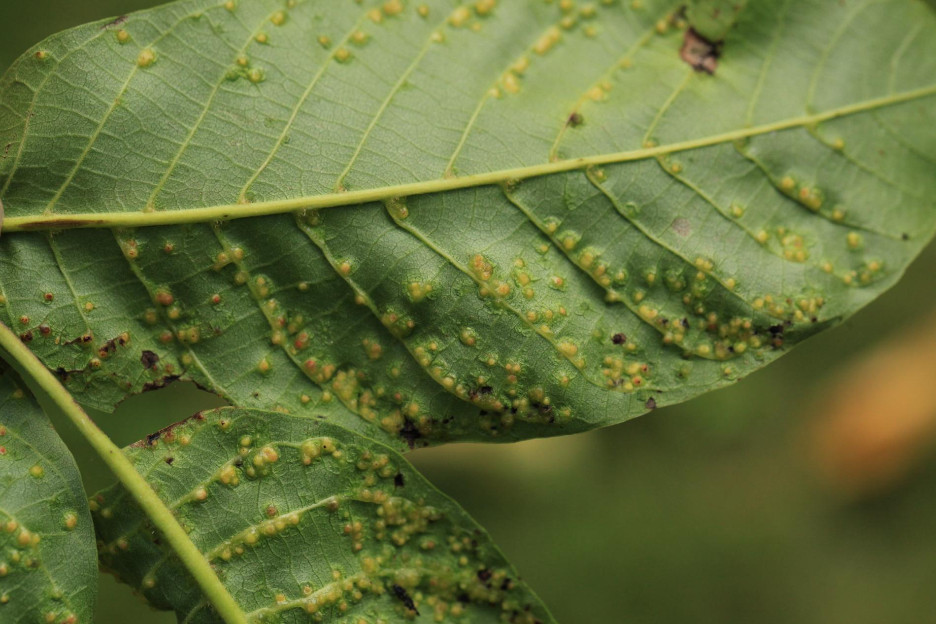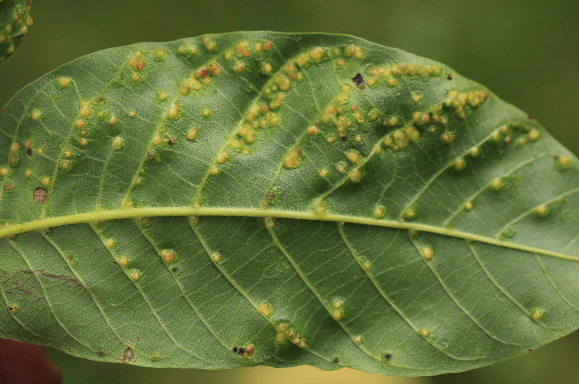 Roundish nipples/galls (1–2 mm), green at first later turning brown, occur mainly along the ribs, very visible on both sides of the leaf. The galls are hairless. During suitable conditions very abundant. All leaves can be infested. Fruits can also be attacked. This gall mite is common in parks, gardens and walnut plantations. It can become a serious pest attacking the fruits.