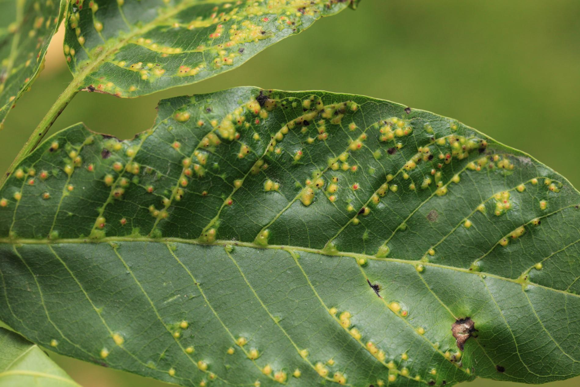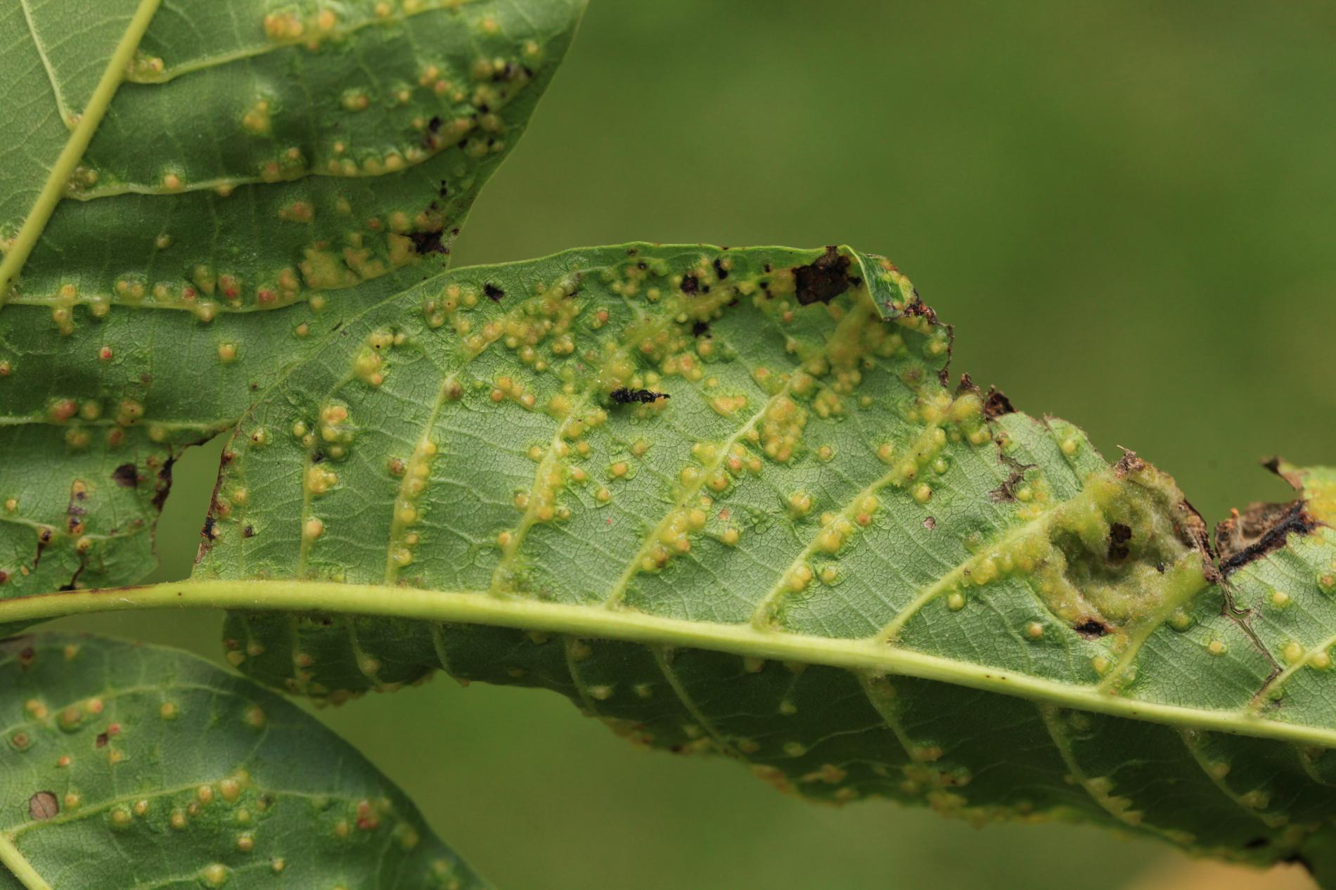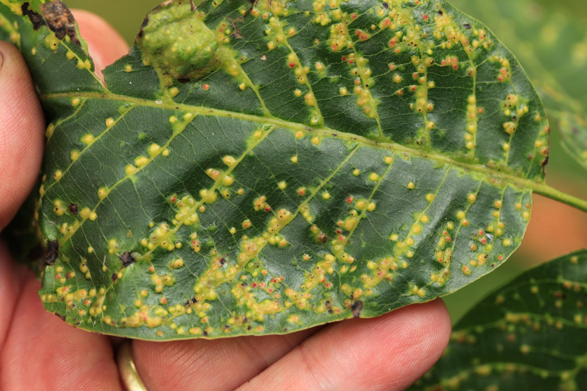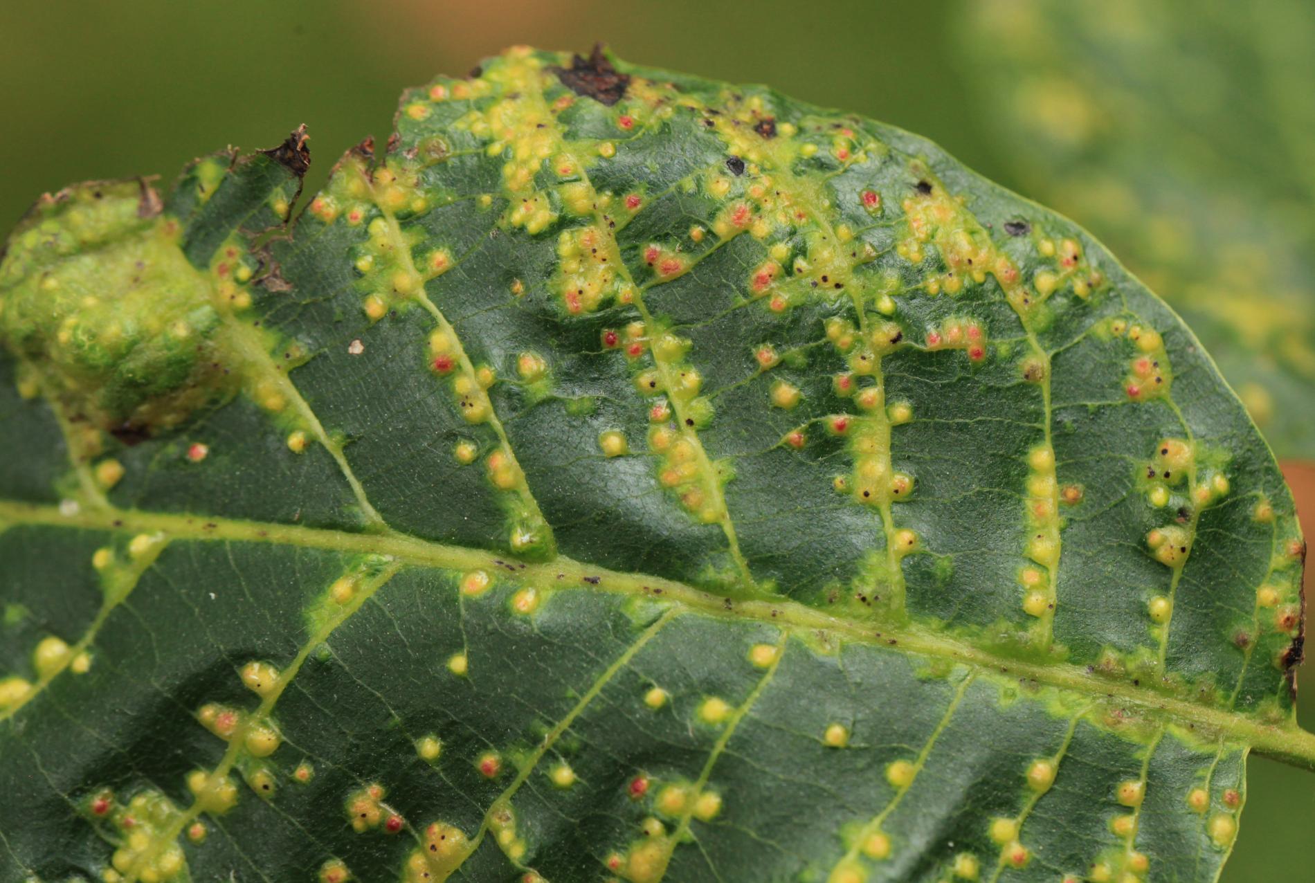 Roundish nipples/galls (1–2 mm), green at first later turning brown, occur mainly along the ribs, very visible on both sides of the leaf. The galls are hairless. During suitable conditions very abundant. All leaves can be infested. Fruits can also be attacked. This gall mite is common in parks, gardens and walnut plantations. It can become a serious pest attacking the fruits.