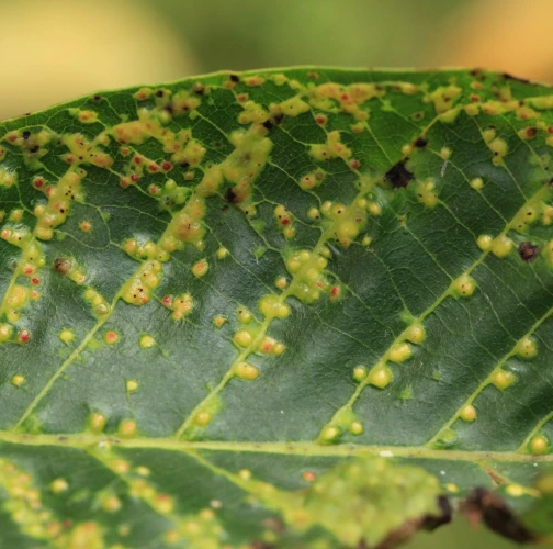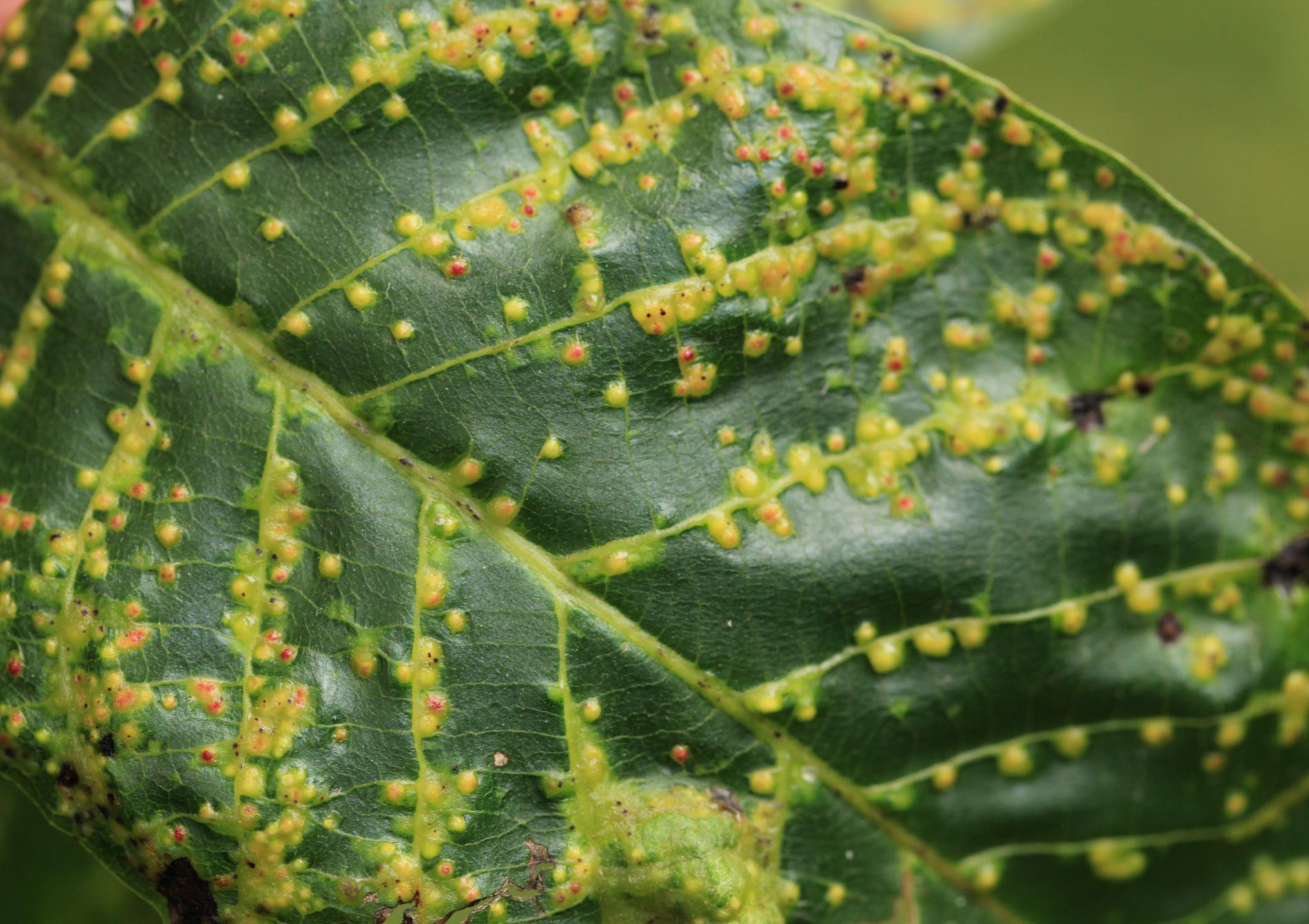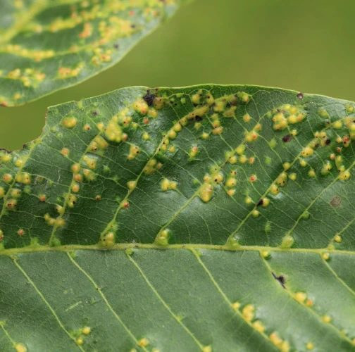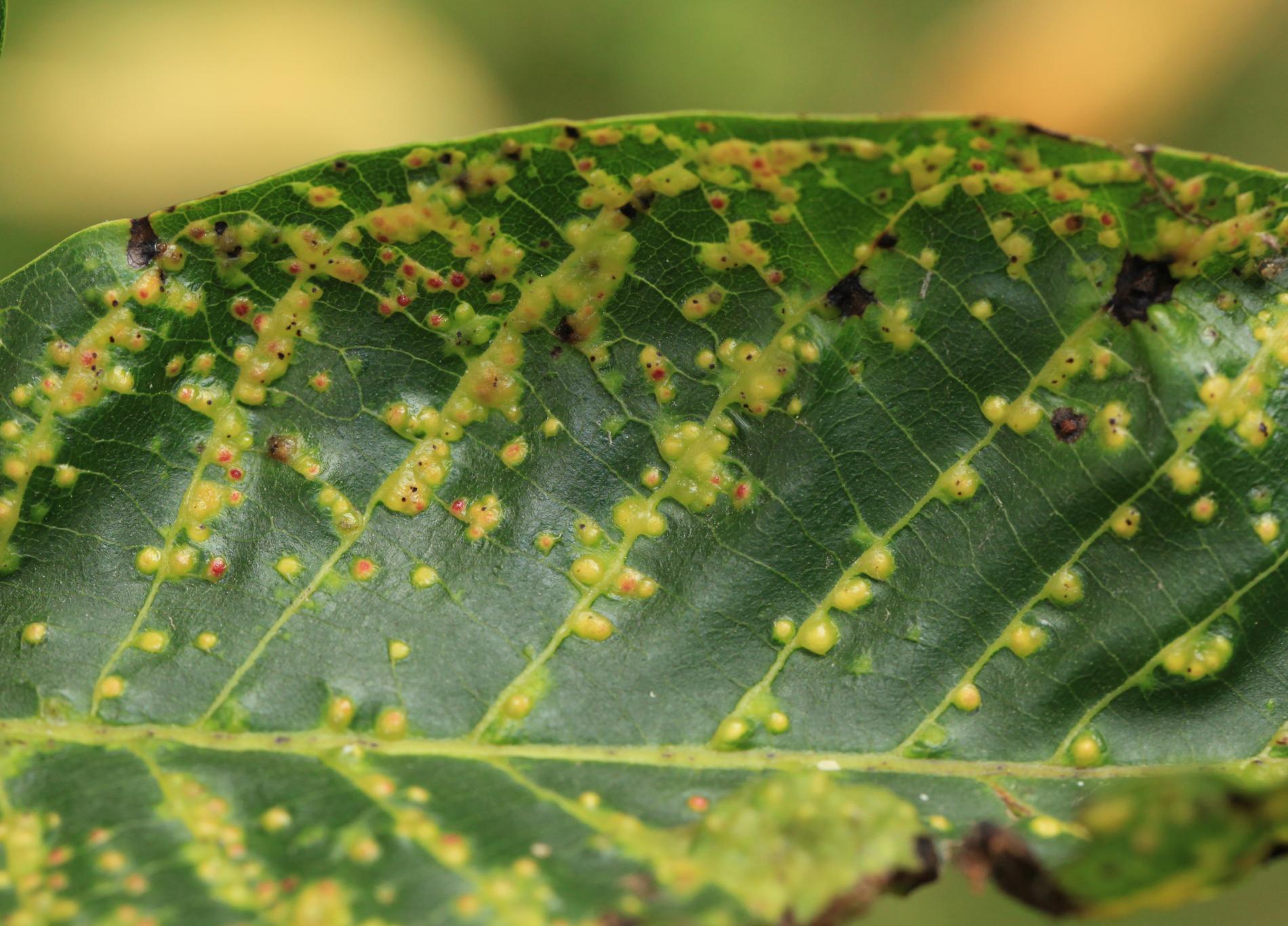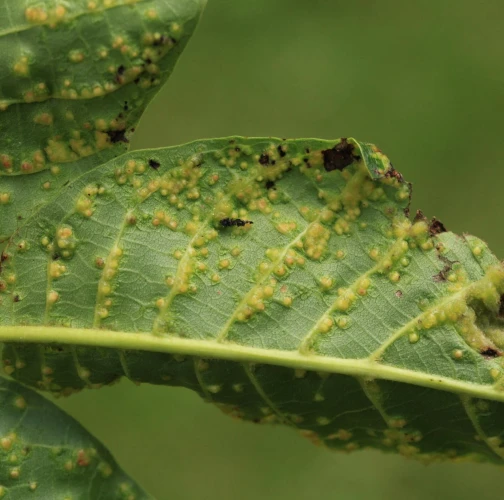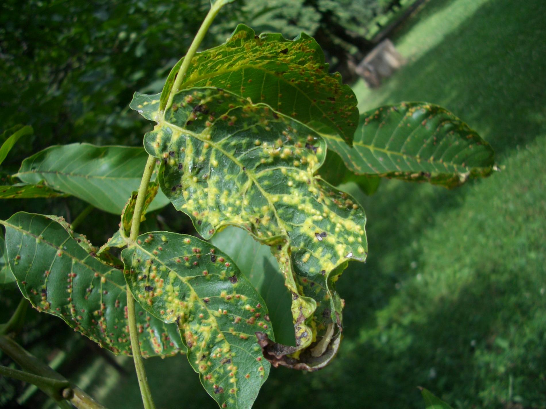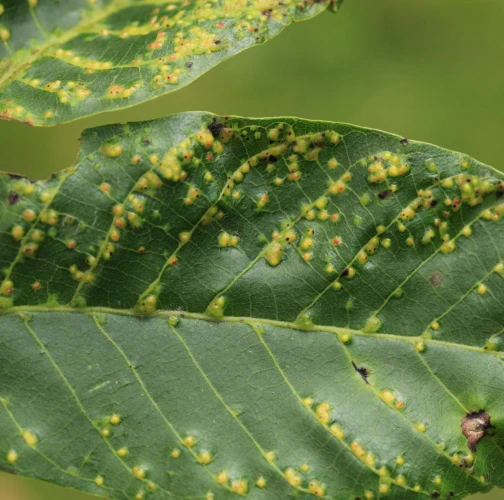 Roundish nipples/galls (1–2 mm), green at first later turning brown, occur mainly along the ribs, very visible on both sides of the leaf. The galls are hairless. During suitable conditions very abundant. All leaves can be infested. Fruits can also be attacked. This gall mite is common in parks, gardens and walnut plantations. It can become a serious pest attacking the fruits.