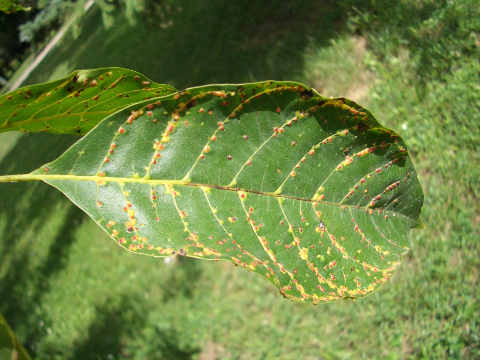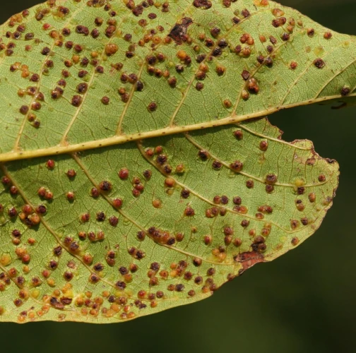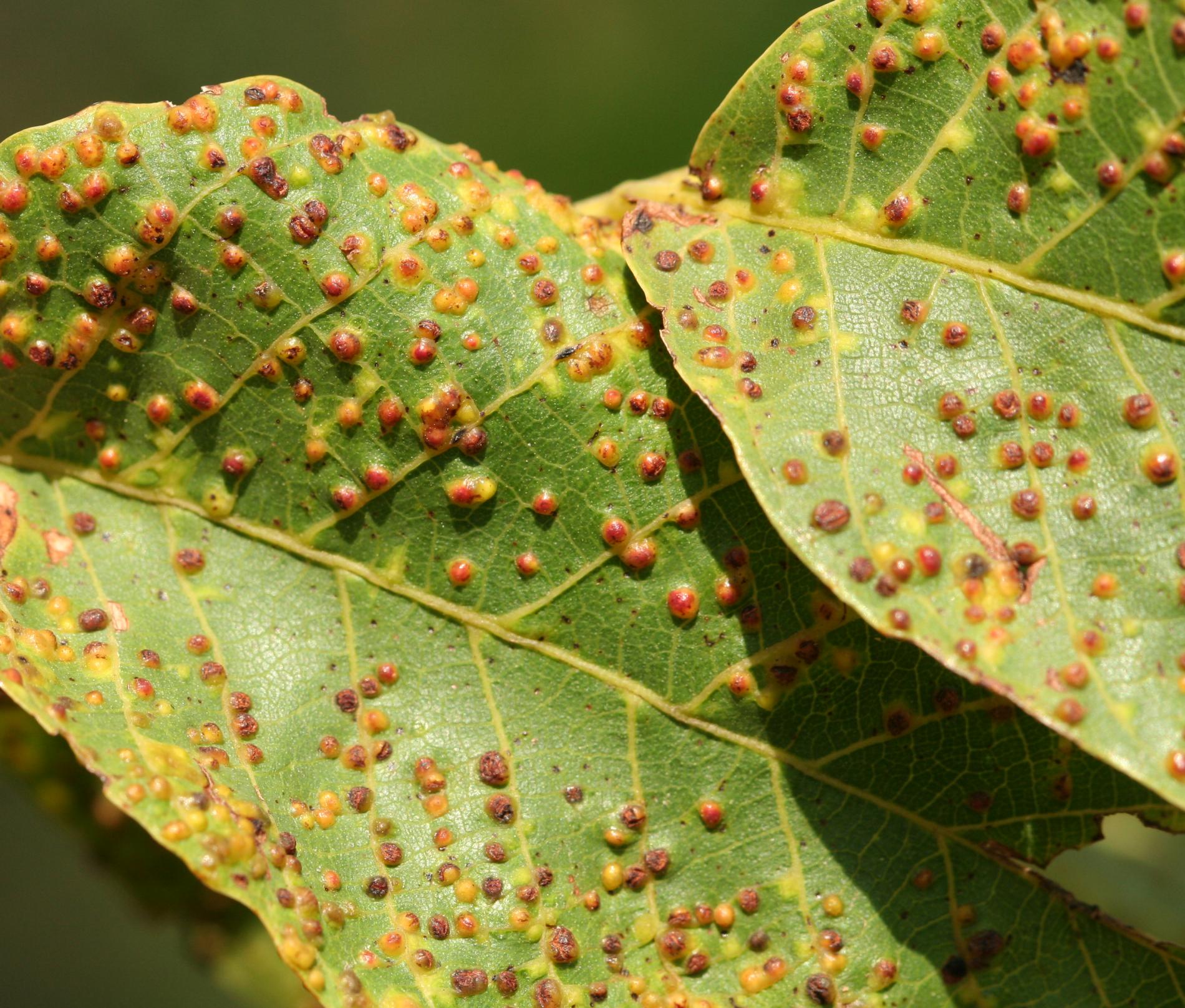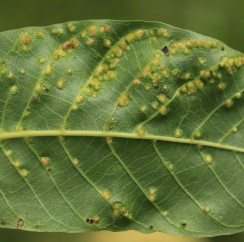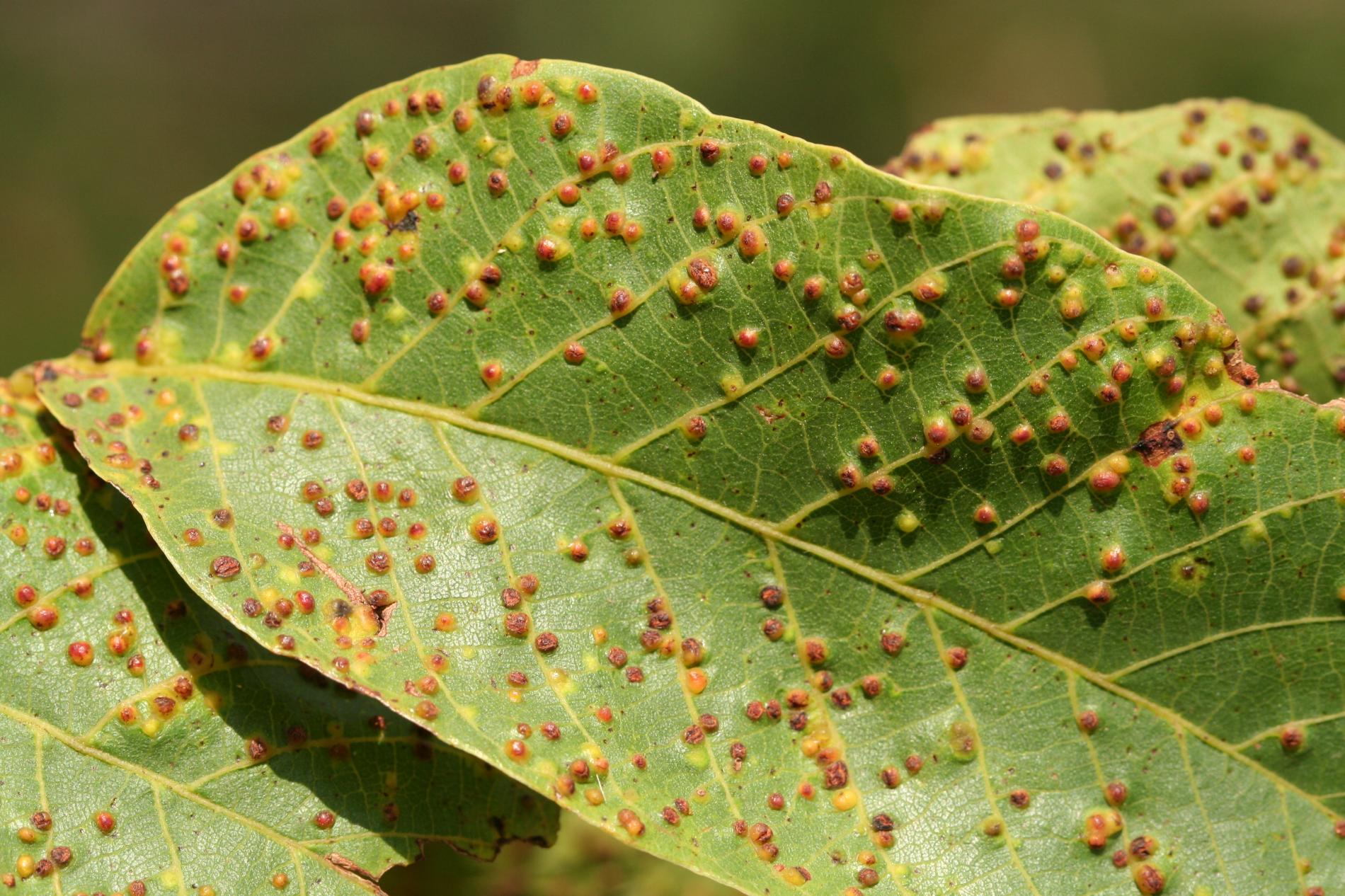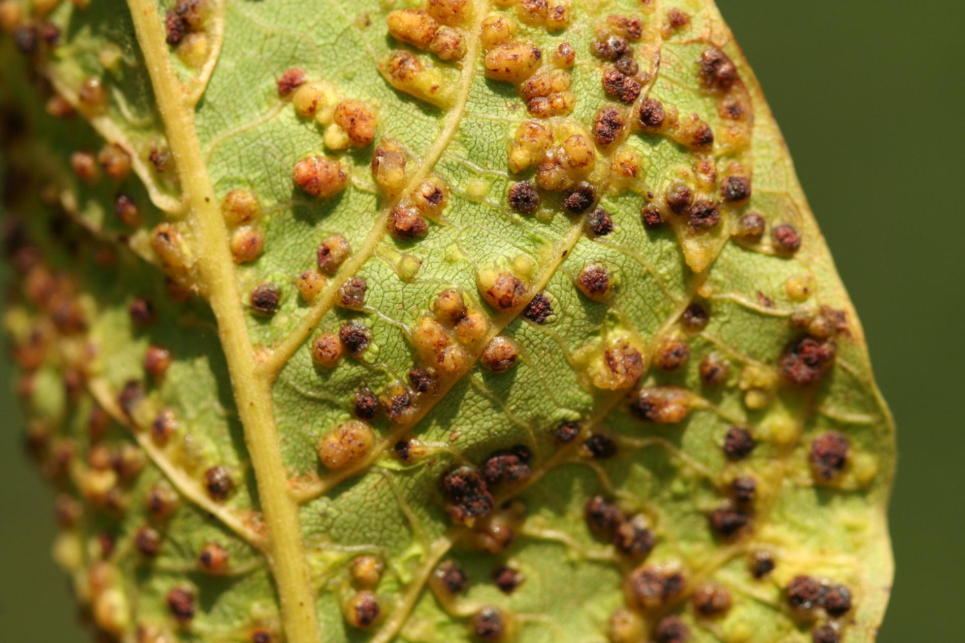 Roundish nipples/galls (1–2 mm), green at first later turning brown, occur mainly along the ribs, very visible on both sides of the leaf. The galls are hairless. During suitable conditions very abundant. All leaves can be infested. Fruits can also be attacked. This gall mite is common in parks, gardens and walnut plantations. It can become a serious pest attacking the fruits.