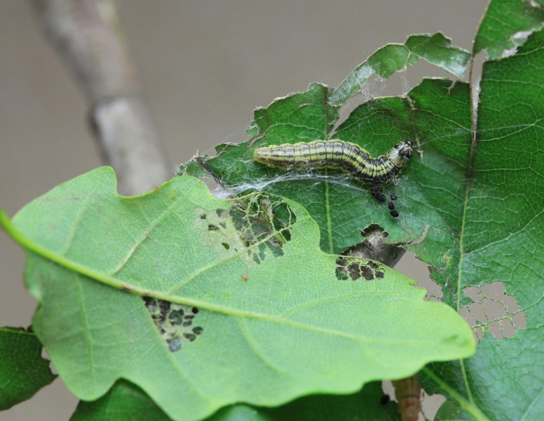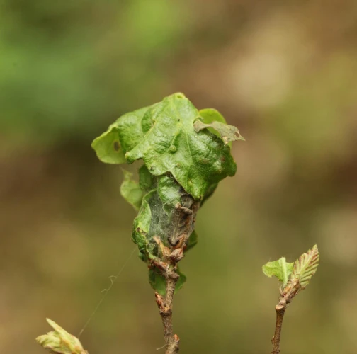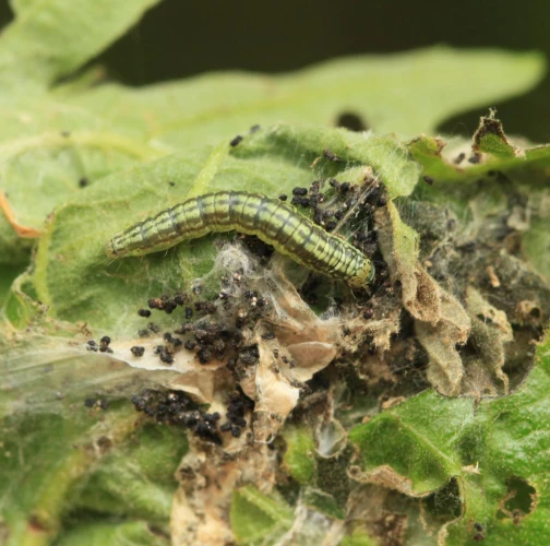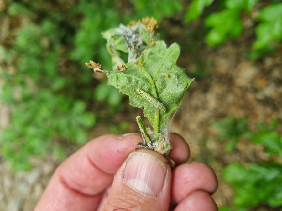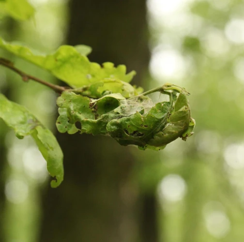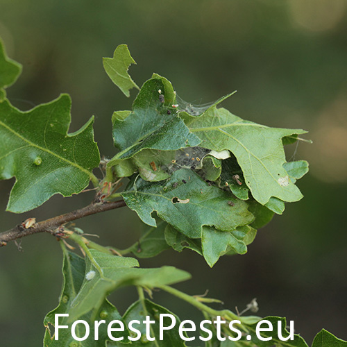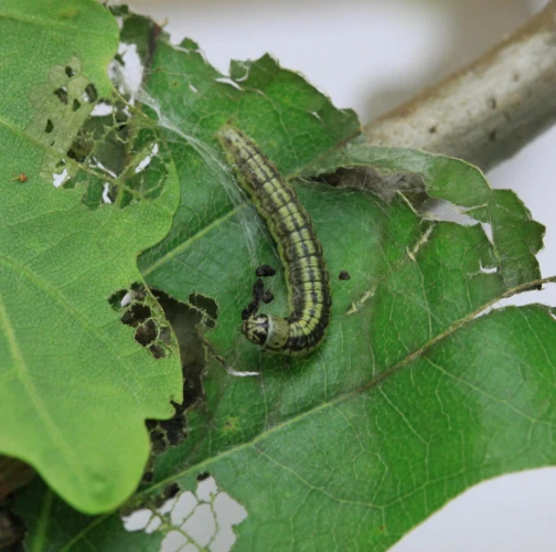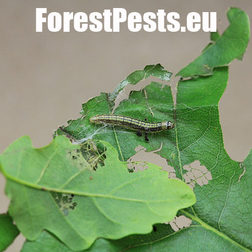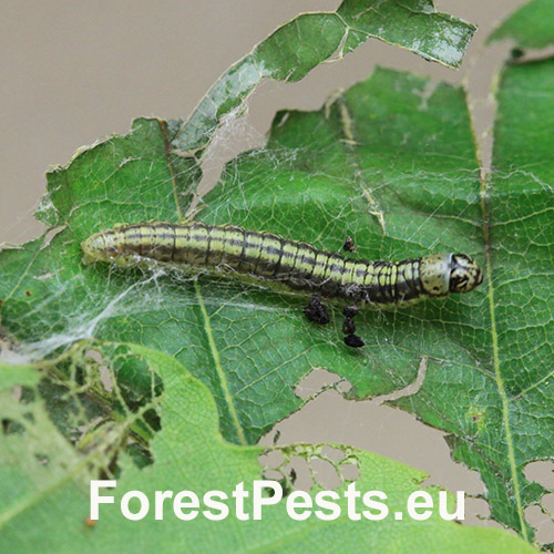 The green caterpillar lives in a spun leaf. It often spins together few leaves, where pupation takes place.