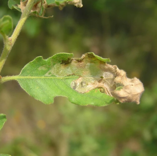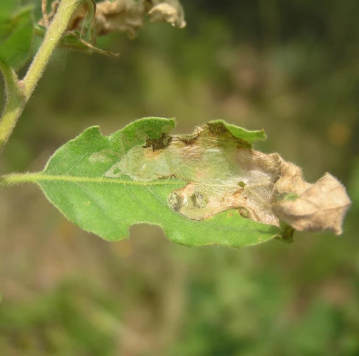 Leaves display irregular, large, silver-white blotches on the upper surface. These blotches are often covering significant part of the leaf. The mine begins as a narrow winding line, later expanding into a blotch mine.