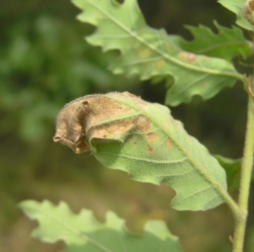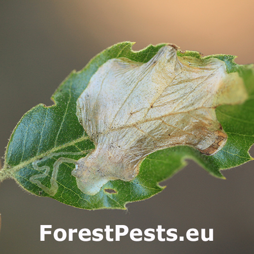Acrocercops brongniardella, known as the leaf blotch miner moth, is a small moth from the Gracillariidae family with a wingspan of 8–10 mm. This species is widespread in Europe, including Turkey, and primarily infests oak species (Quercus spp.), such as Quercus ilex (holm oak), Quercus robur (English oak), and Quercus cerris (Turkey oak). Occasionally, it can also be found on Castanea sativa (sweet chestnut). The larvae mine leaves in the upper epidermis, forming irregular, large, silver-white blotches that may coalesce, resulting in significant aesthetic damage to infested foliage. The mining activities rarely harm the tree’s health but can impact the ornamental value of oaks, particularly in gardens and parks.