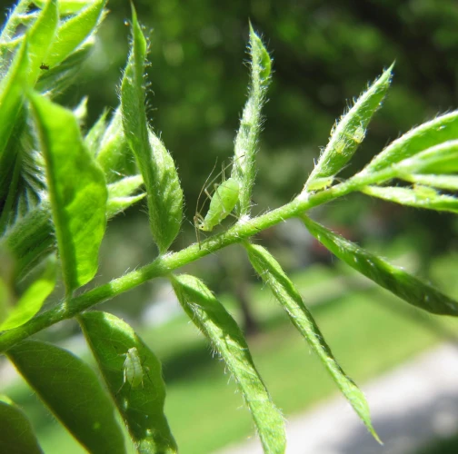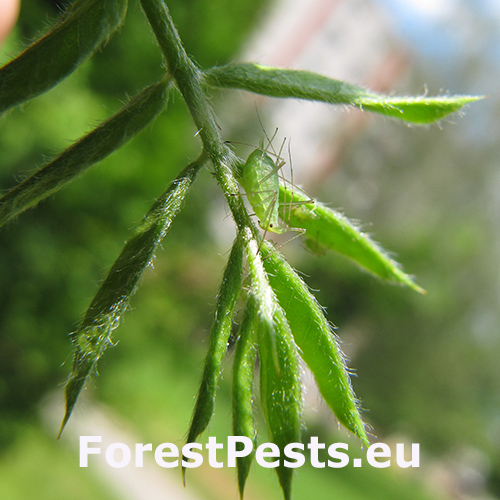 Acyrthosiphon caraganae, commonly known as the Caragana aphid, is an oligophagous aphid that primarily infests woody plants in the family Fabaceae, particularly species of Caragana (peashrubs) and Colutea (bladder senna). It is also occasionally found on other legumes such as Robinia pseudoacacia, Cytisus, and Indigofera. Originating in Mongolia, it is now widely distributed in temperate regions across the Northern Hemisphere, including Europe, Asia, and North America, where it thrives in parks and gardens.