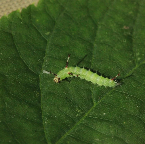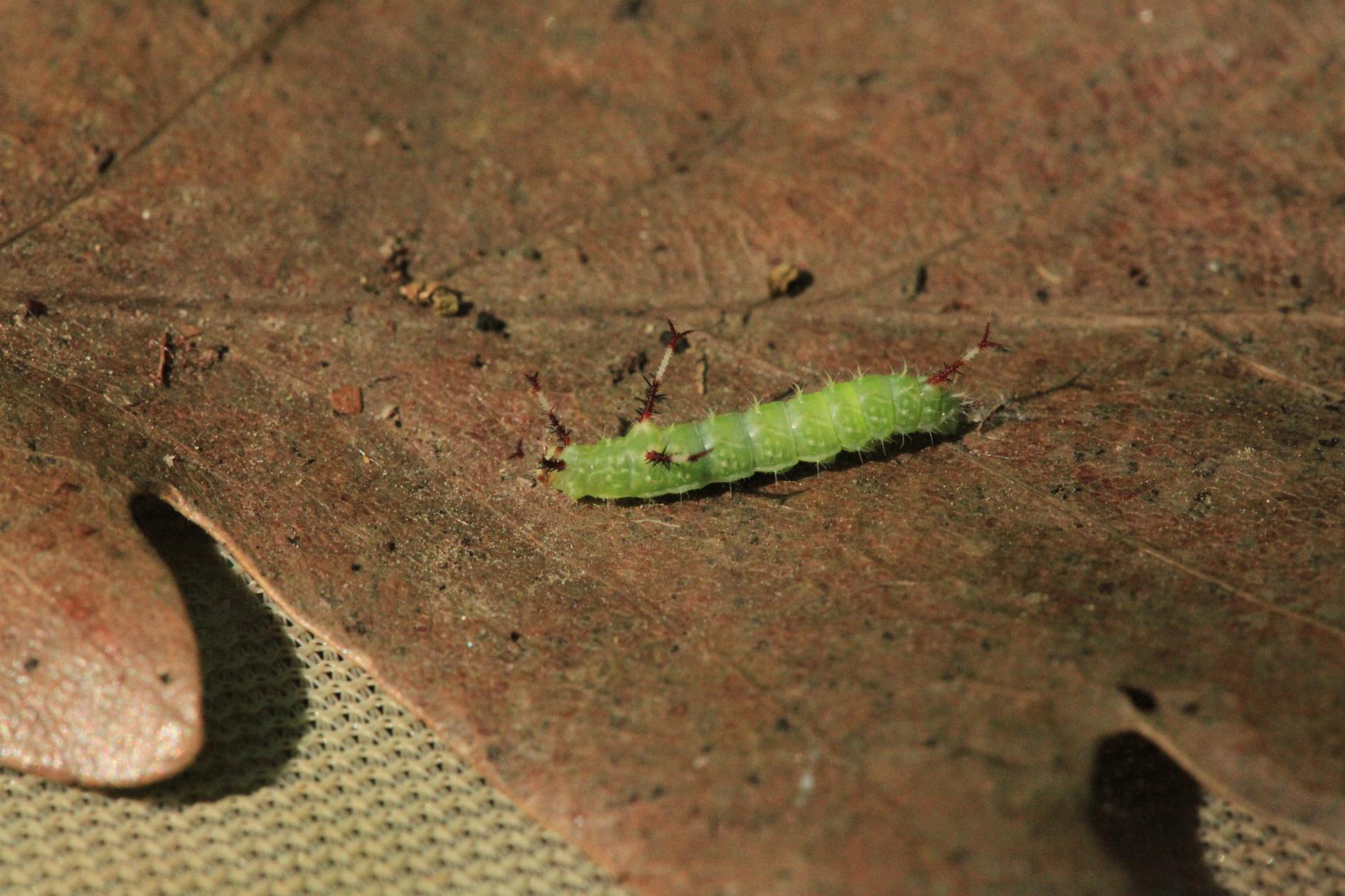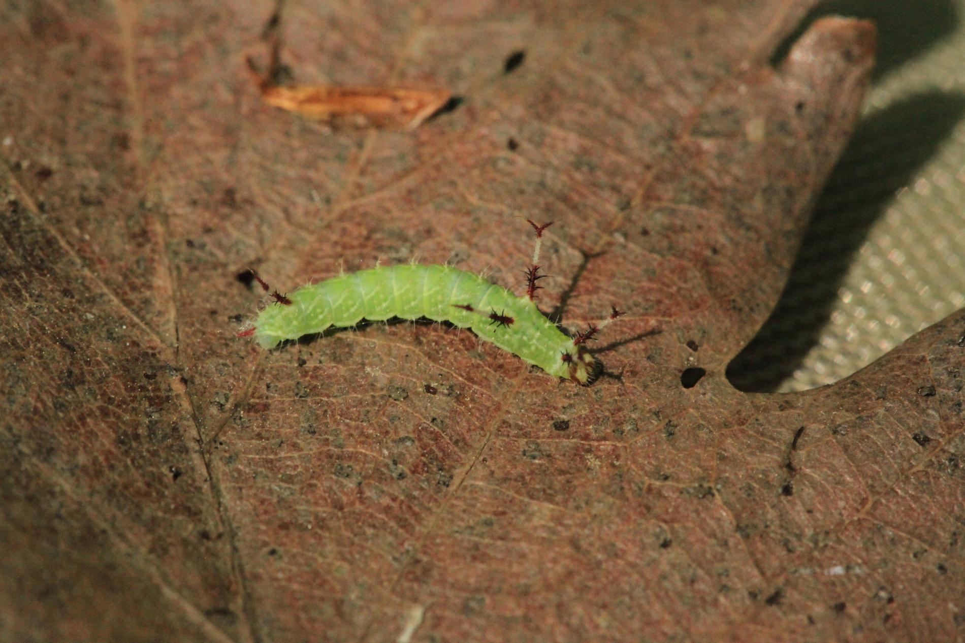 A green caterpillar with bizarre growths sitting on a leaf. Older caterpillars do not have growths.